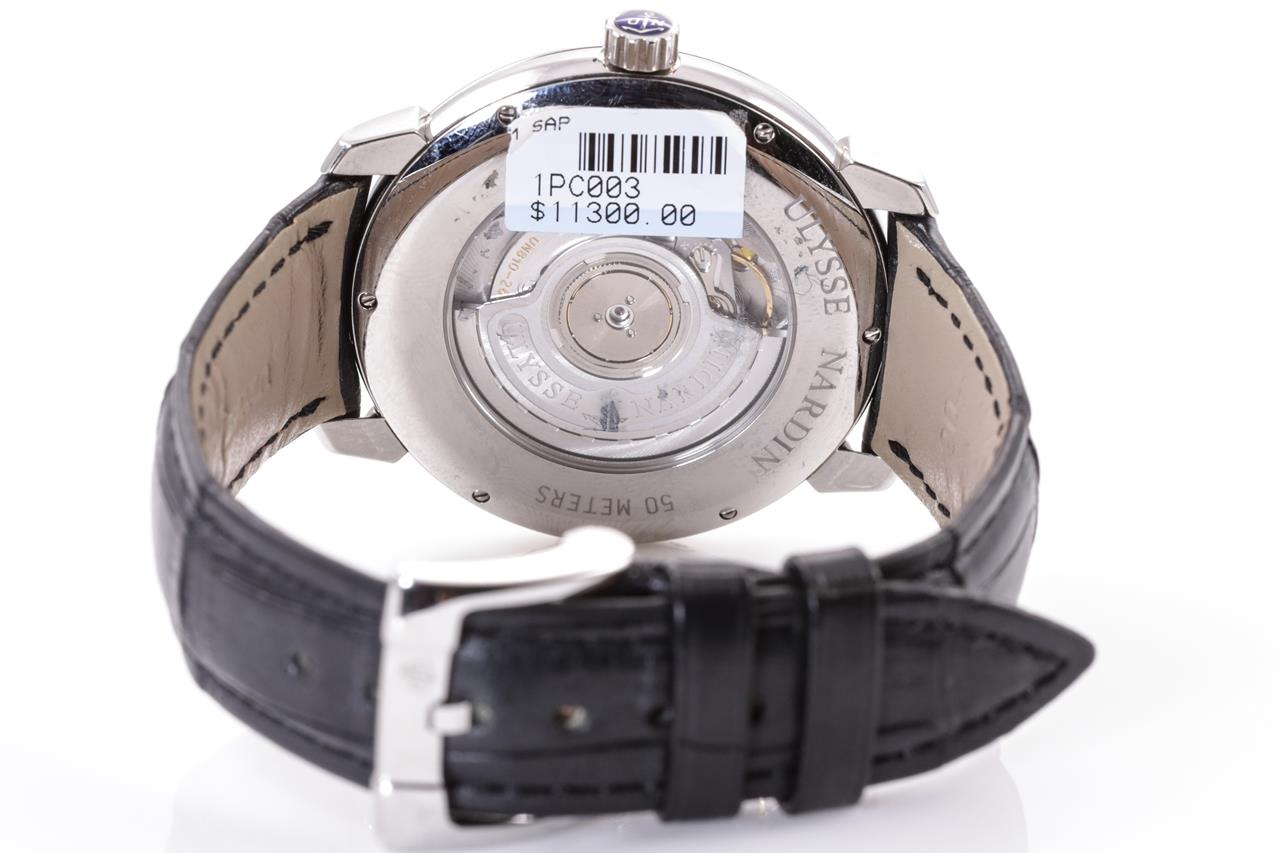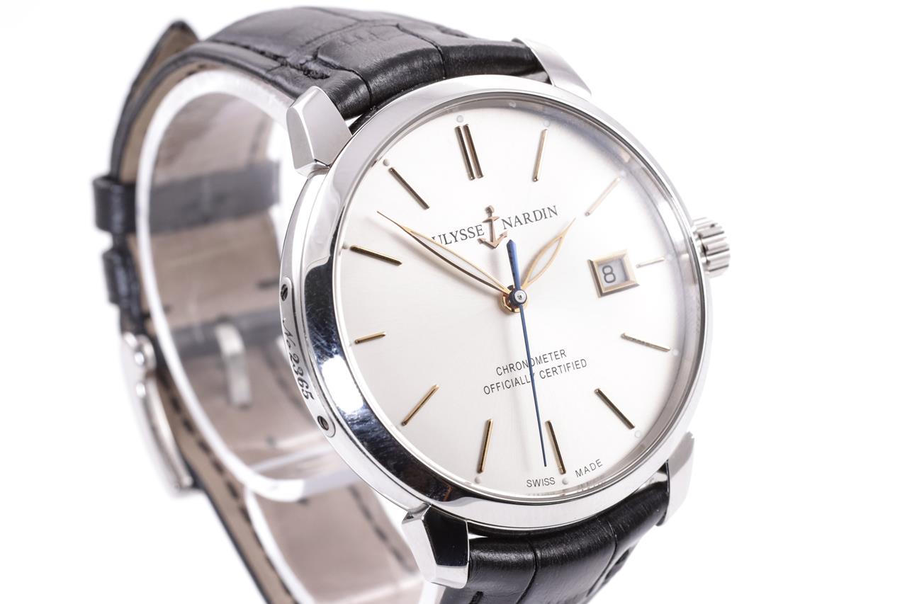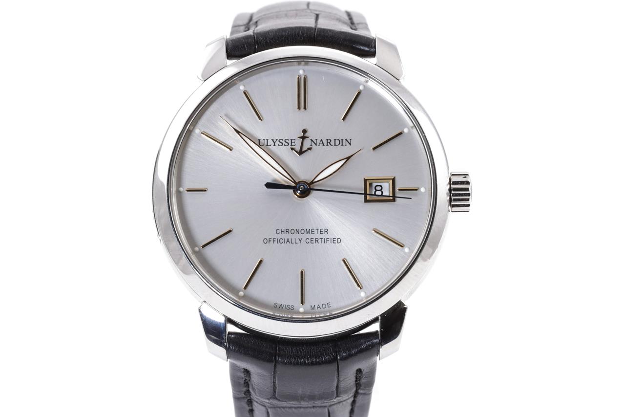 Ulysse Narding Classico stainless steel automatic mens watch. Silver dial, date, case diameter: 40mm, wrist length: 20cm, Swiss made. Ref# 8153-111-2/90. With Ulysse Nardin black leather strap and clasp. Note: light wear on strap due to being display stock. 3 month FSA warranty. (As New)