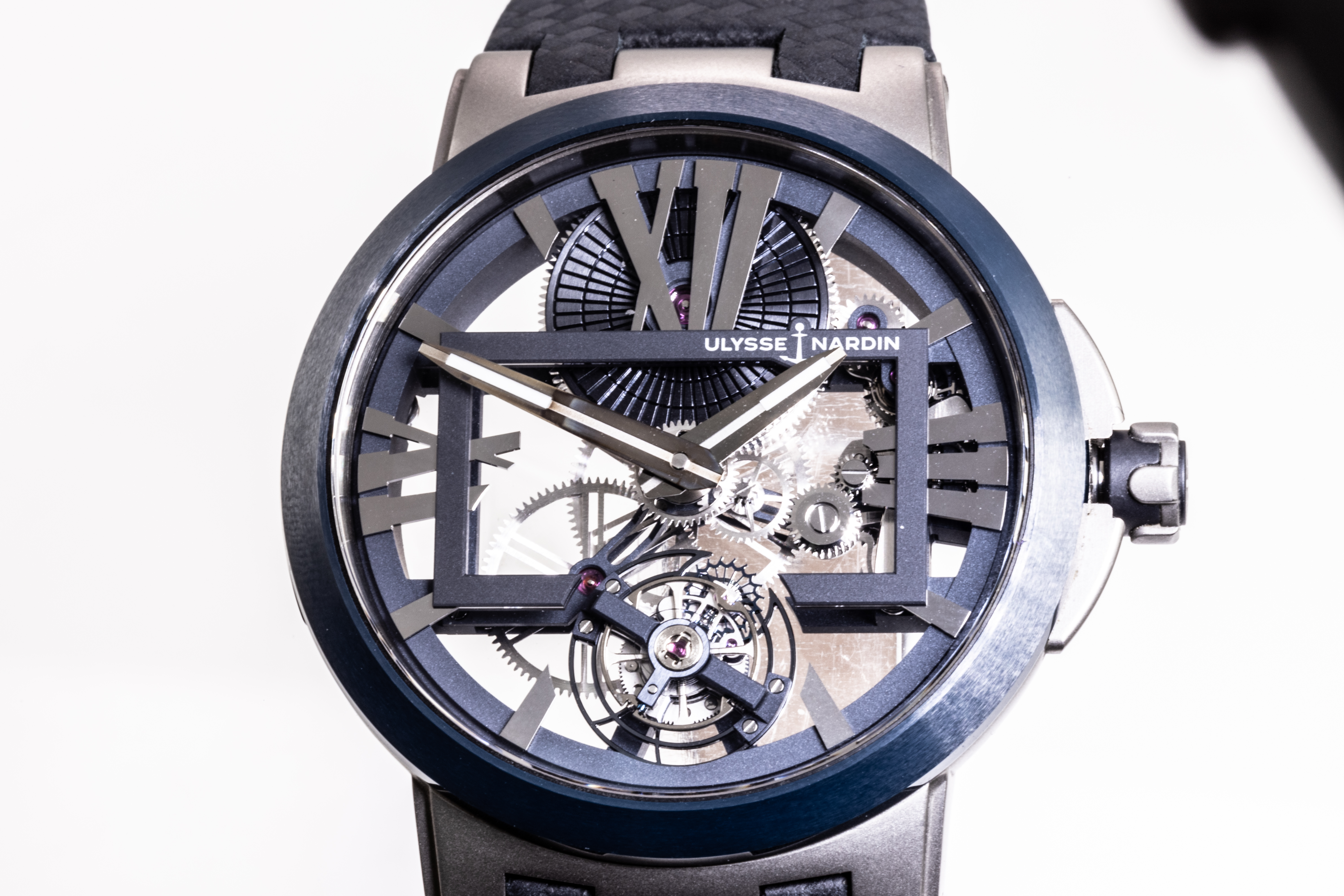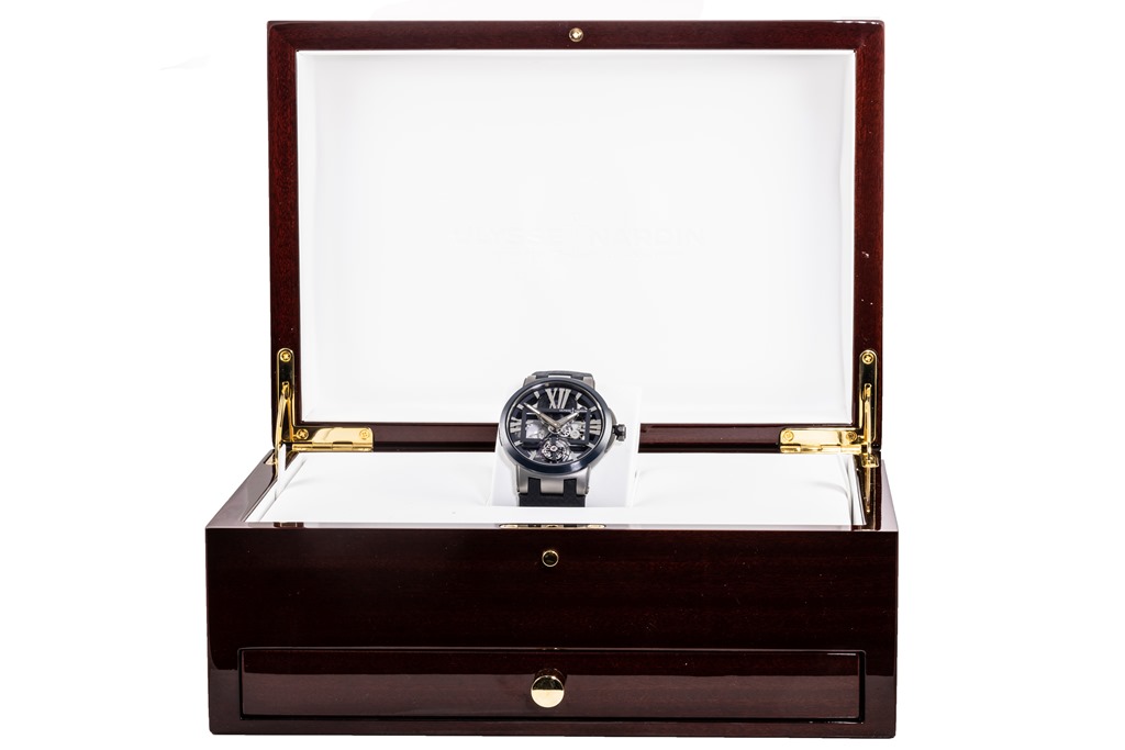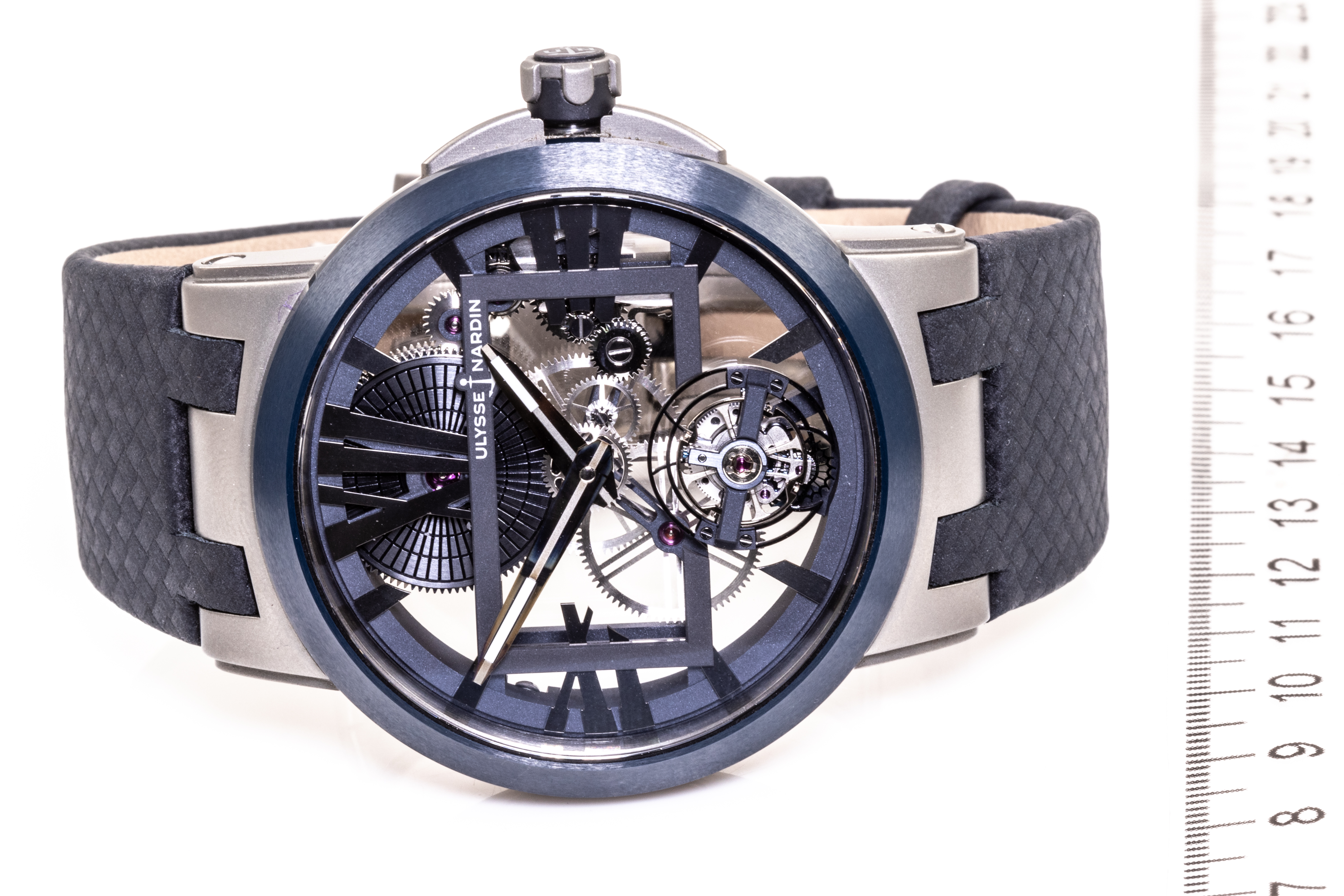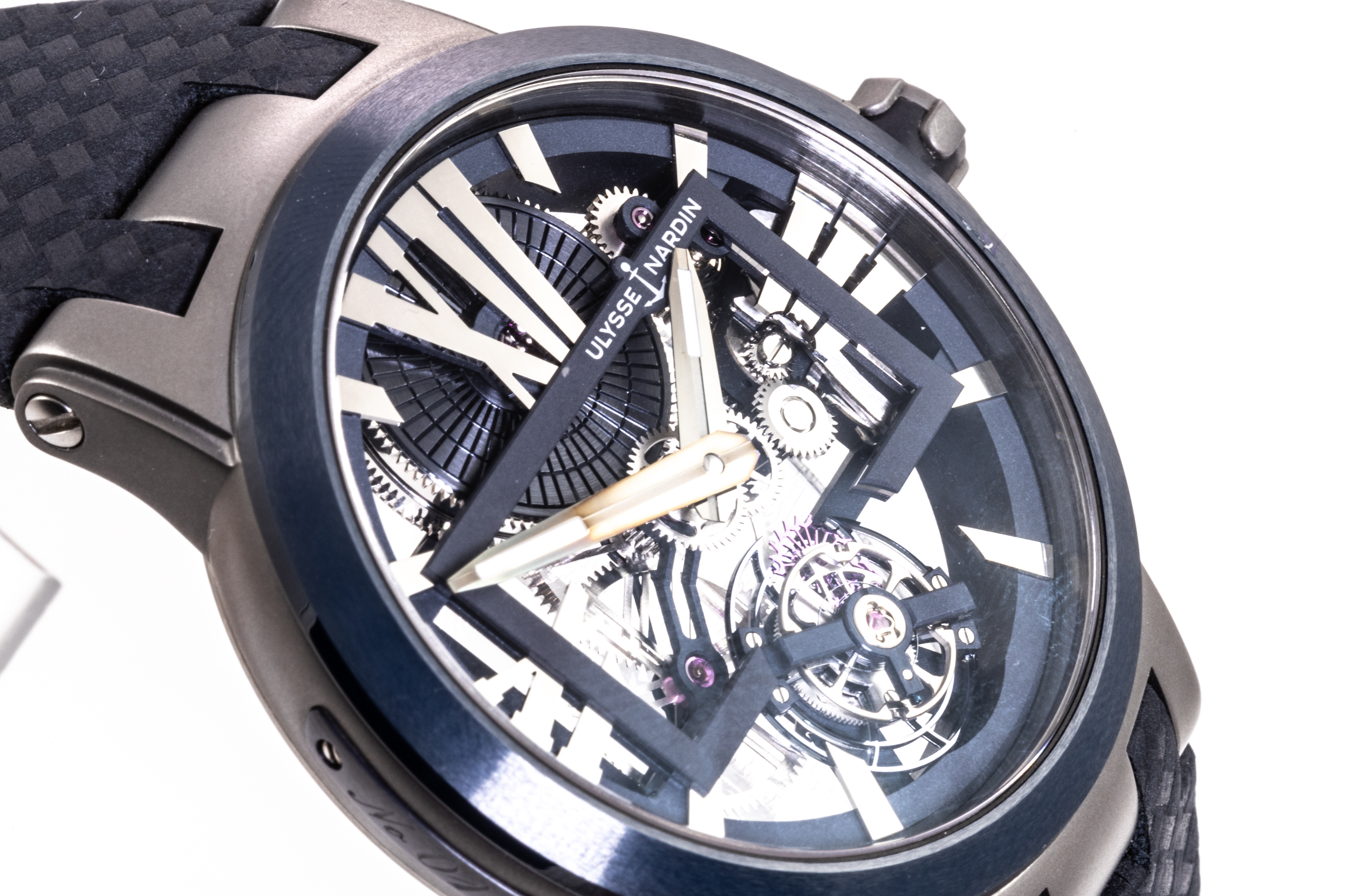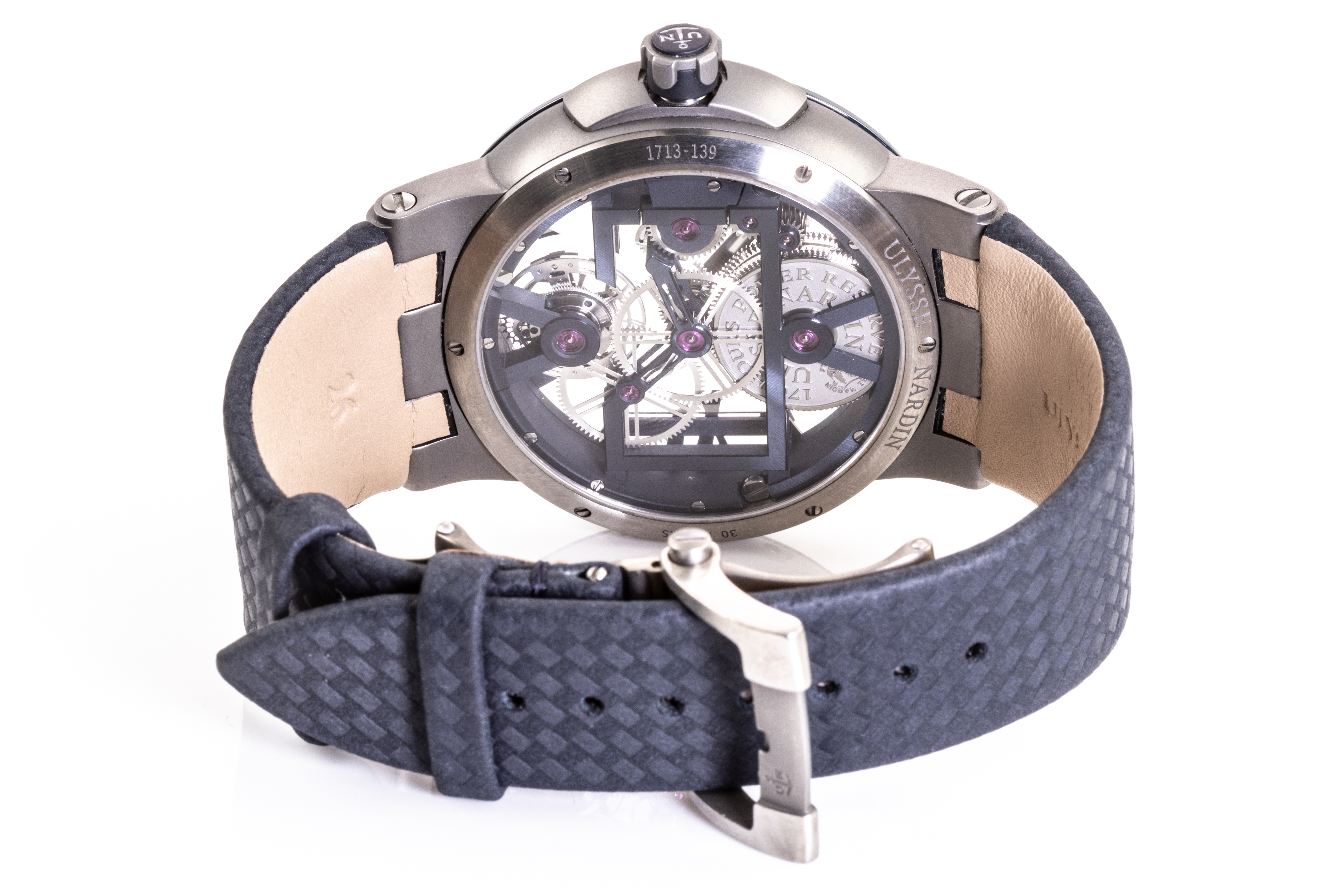 Ulysse Nardin Executive Skeleton Tourbillon titanium mens manual winding watch. Skeleton dial, case diameter: 45mm, wrist size: 19.5cm, Swiss made. Ref# 1713-139/43. With Ulysse Nardin blue leather strap and clasp. With Certificate of Authenticity, Ulysse Nardin Warranty Card and Ulysse Nardin box. 3 month FSA warranty. (Pre-owned)