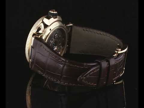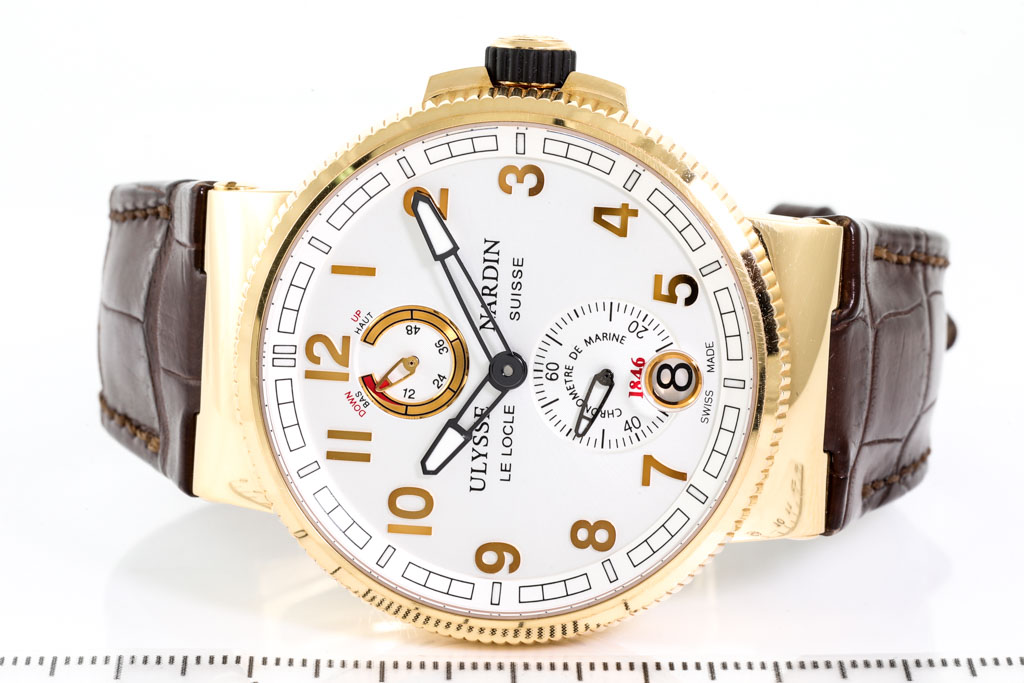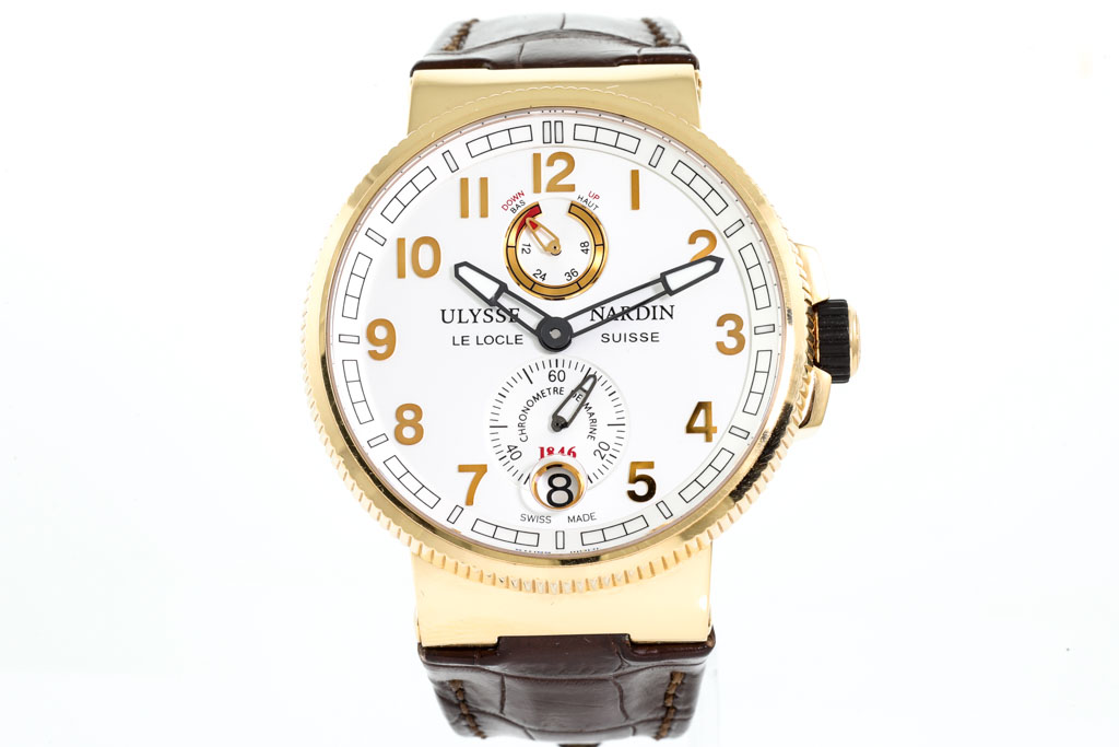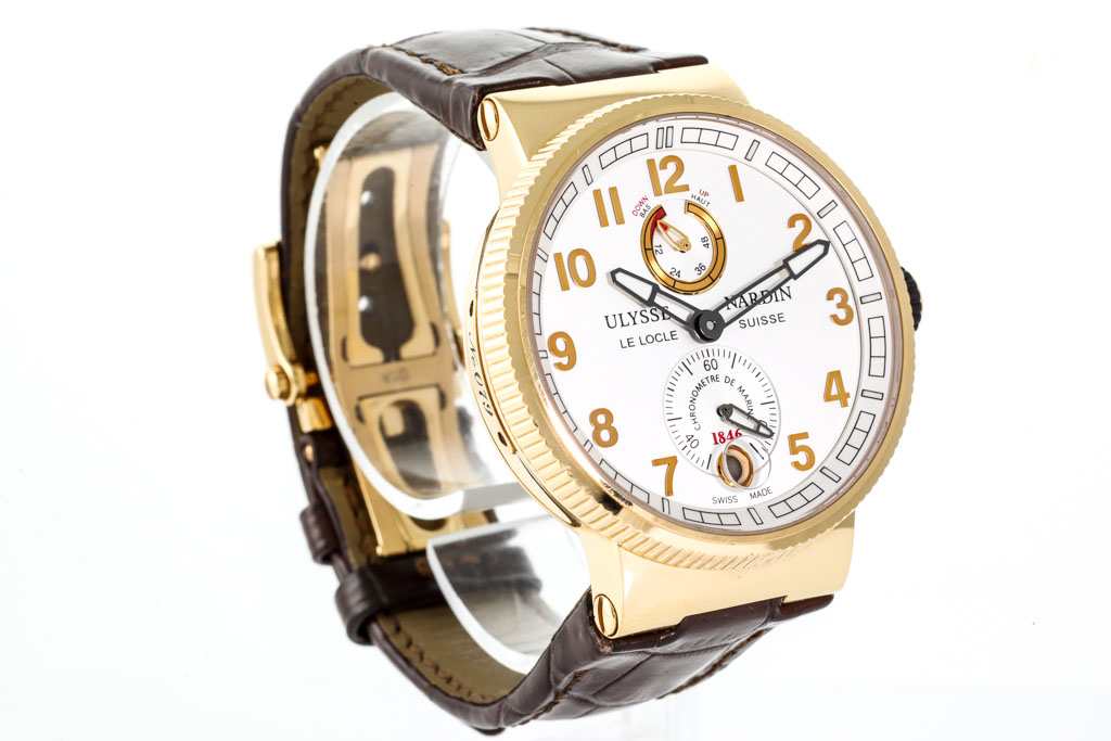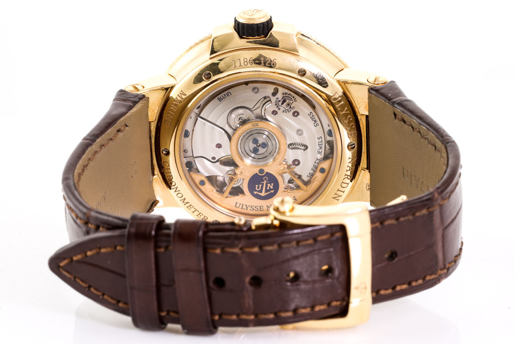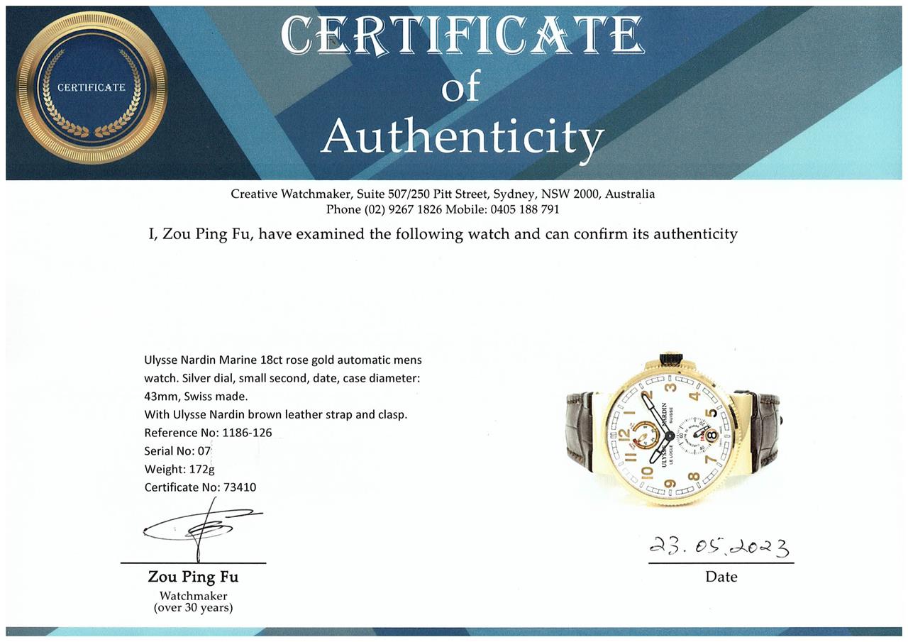 Ulysse Nardin Marine 18ct rose gold automatic mens watch. Silver dial, small second, date, case diameter: 43mm, wrist size: 20.5cm, Swiss made. Ref# 1186-126. With Ulysse Nardin brown leather strap and clasp. With Certificate of Authenticity, Ulysse Nardin International Warranty Card dated 21/16/2016 and Ulysse Nardin box. 3 month FSA warranty (As new)