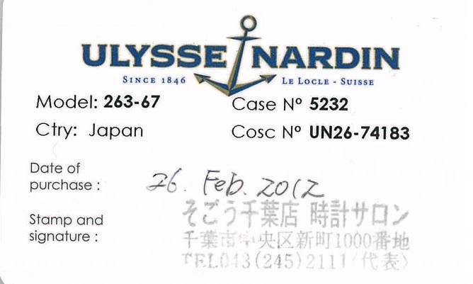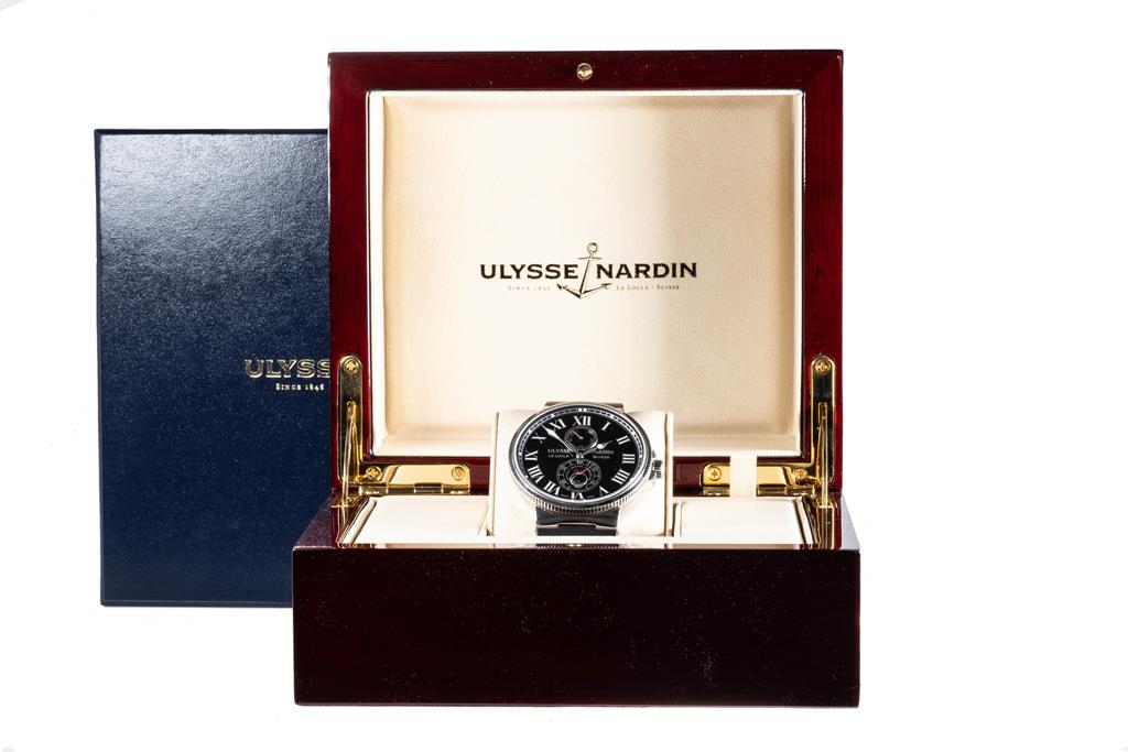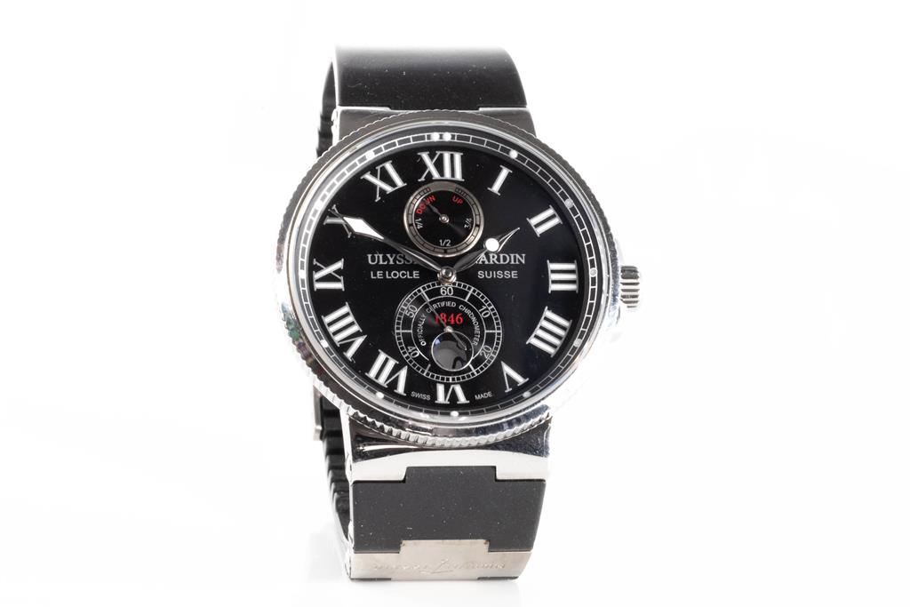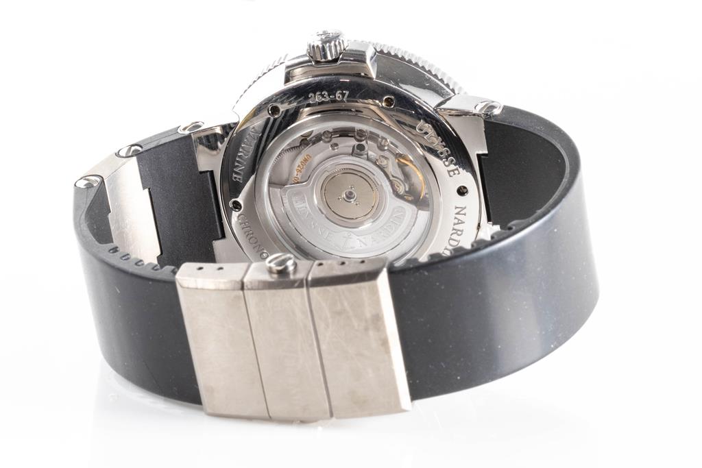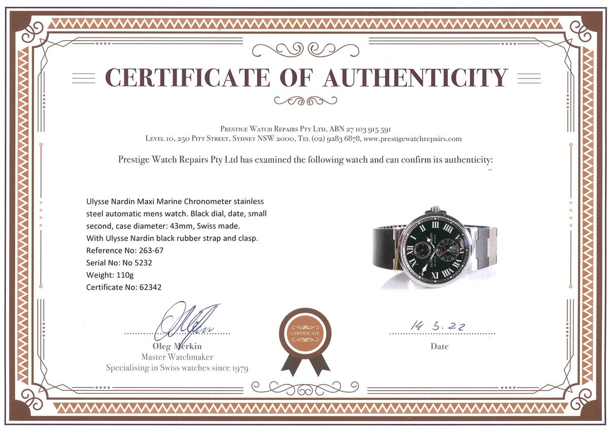 Ulysse Nardin Maxi Marine Chronometer stainless steel automatic mens watch. Black dial, date, small second, case diameter: 43mm, wrist size: 17.5cm, Swiss made. Ref# 263-67. With Ulysse Nardin black rubber strap and clasp. With Certificate of Authenticity, Ulysse Nardin International Guarantee Certificate Card dated 26/02/2012 and Ulysse Nardin box. 3 month FSA warranty. (Pre-owned)