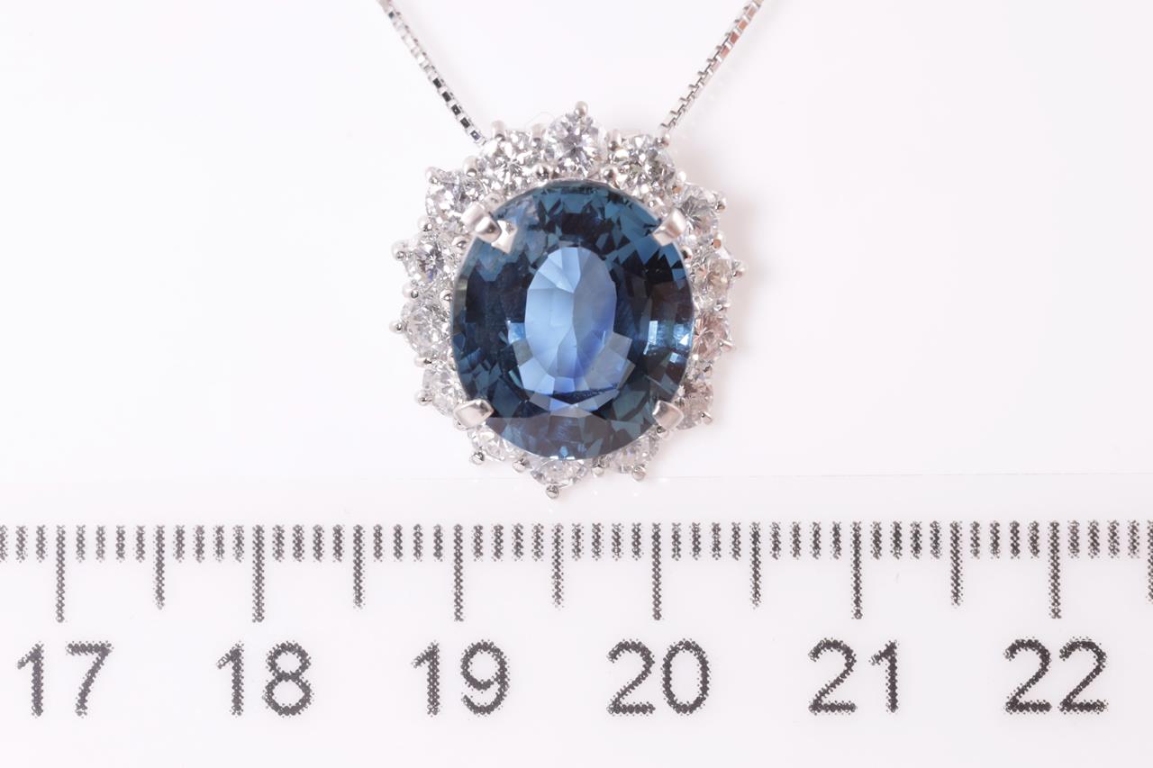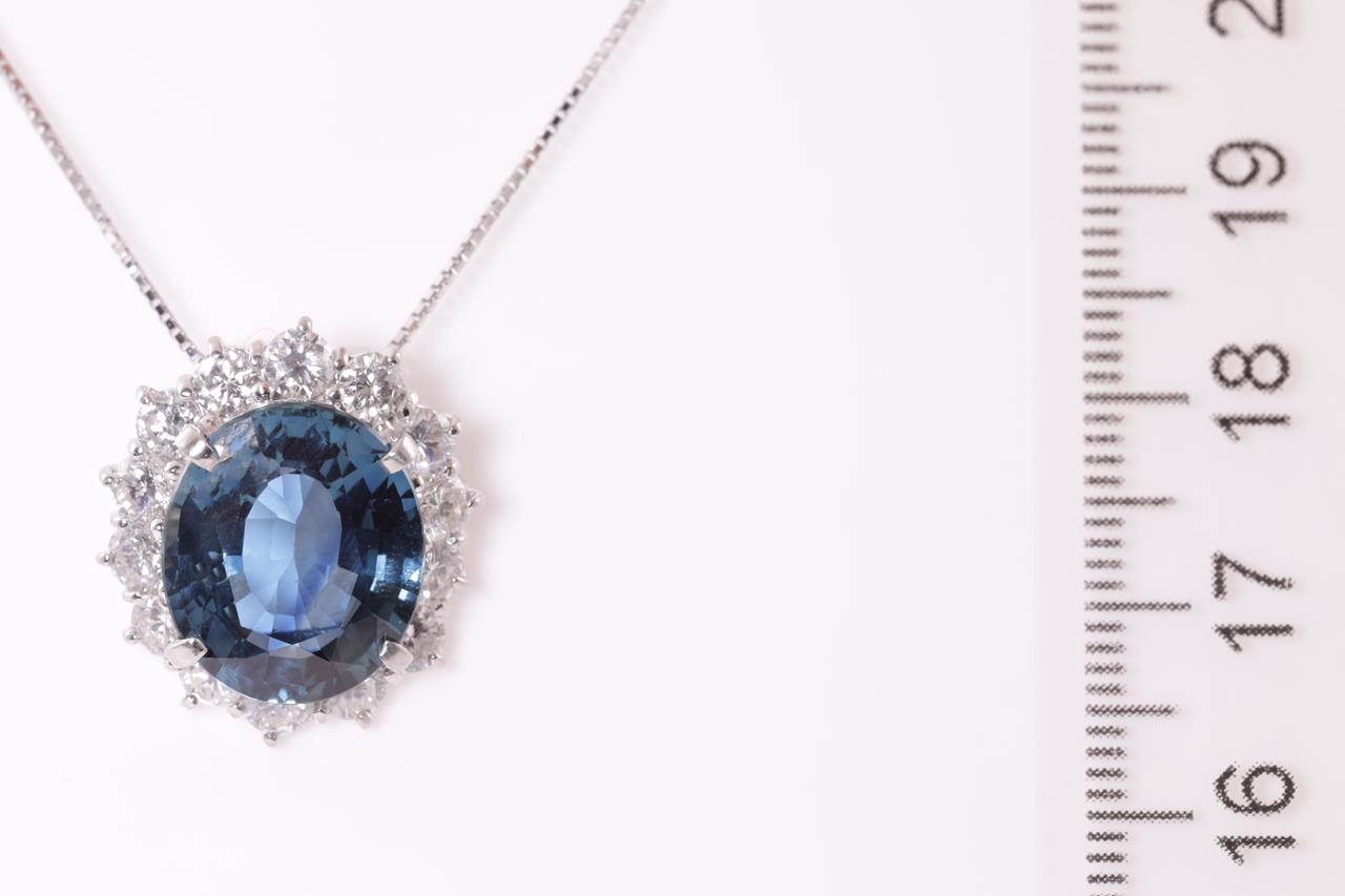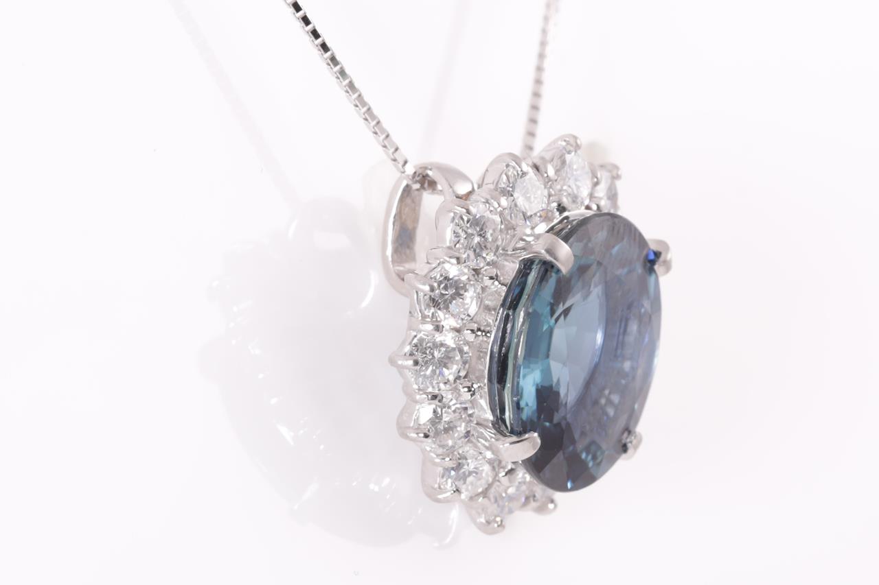 Sapphire and Diamond pendant with a oval shape unheated blue Sapphire of 9.10ct and Diamonds totalling 1.00cts (Estimated grading: G SI). Platinum with 18ct white gold adjustable 44cm chain. Weight: 9.1g. With certificate #414892 (Pre-owned)