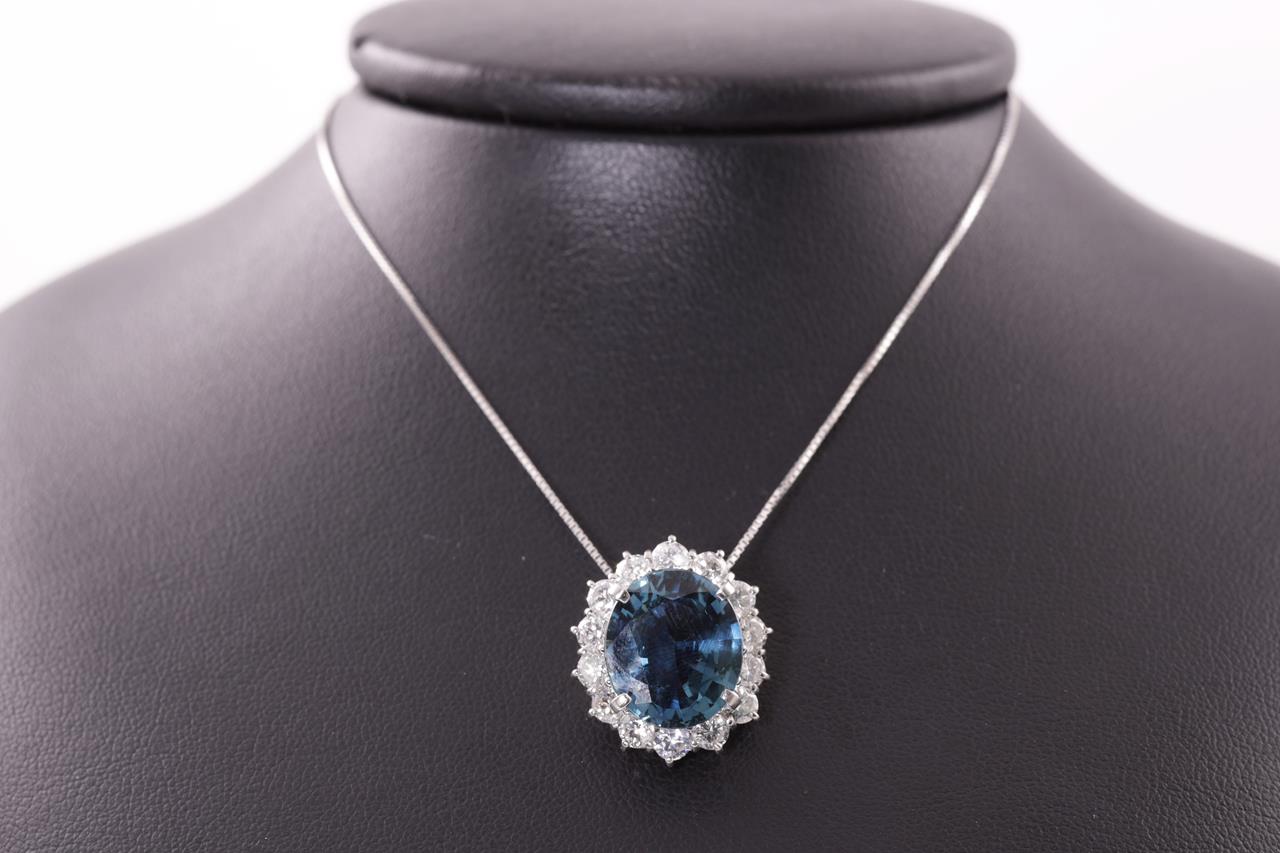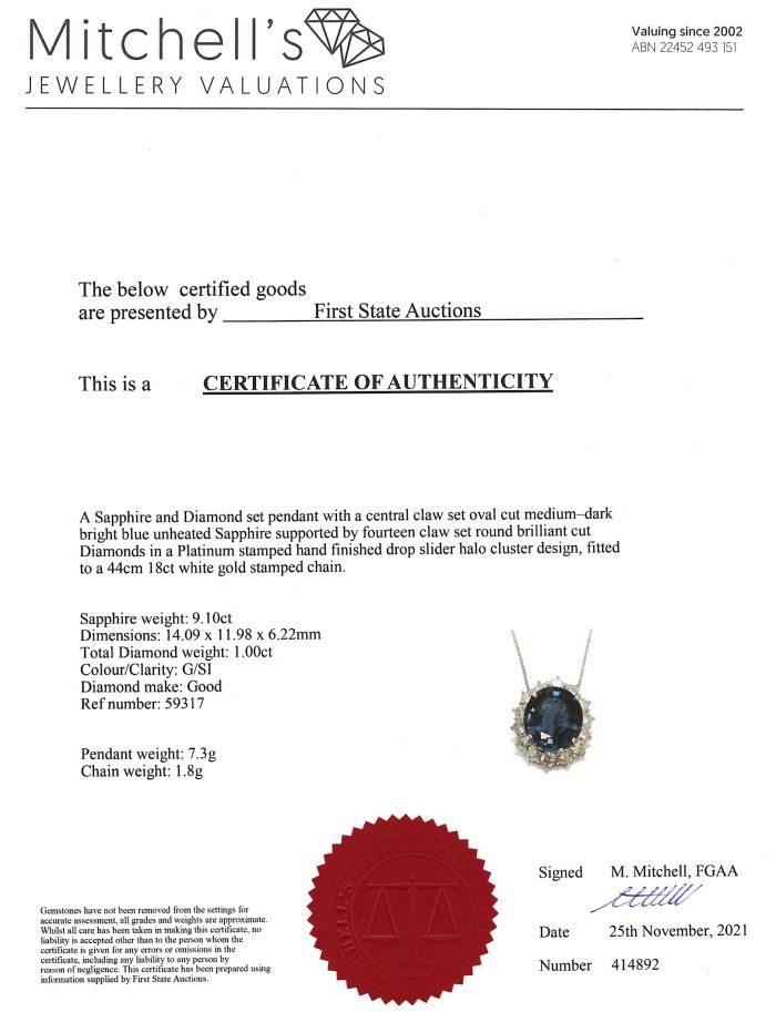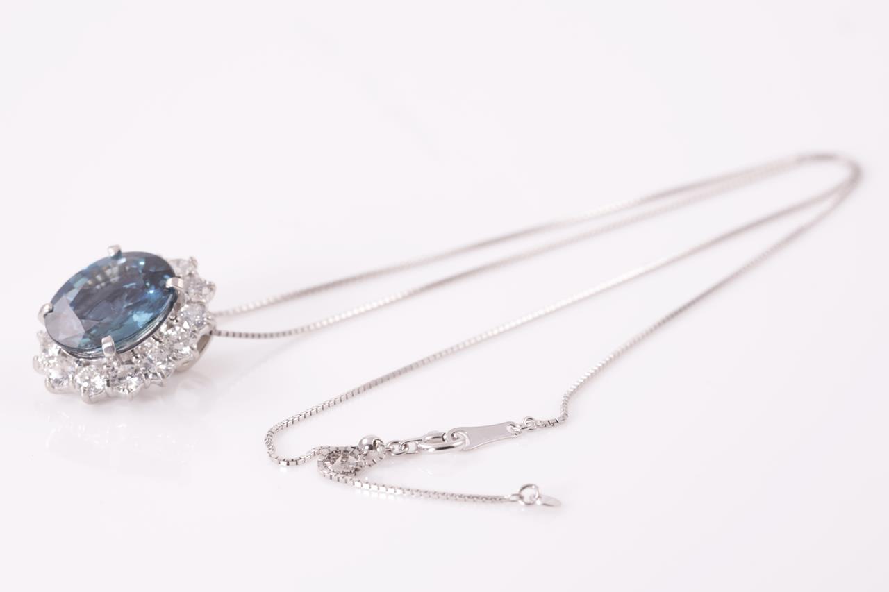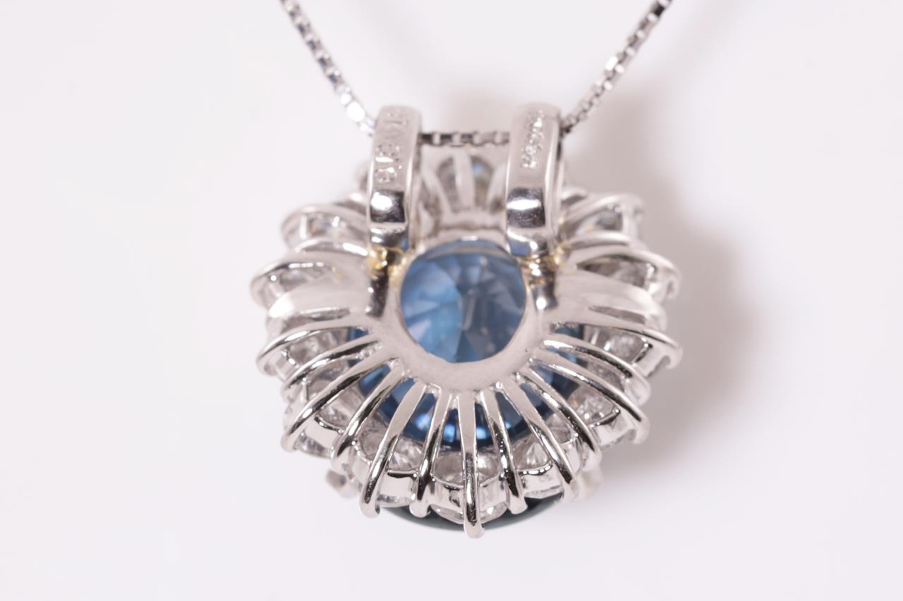 Sapphire and Diamond pendant with a oval shape unheated blue Sapphire of 9.10ct and Diamonds totalling 1.00cts (Estimated grading: G SI). Platinum with 18ct white gold adjustable 44cm chain. Weight: 9.1g. With certificate #414892 (Pre-owned)