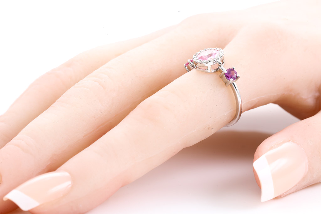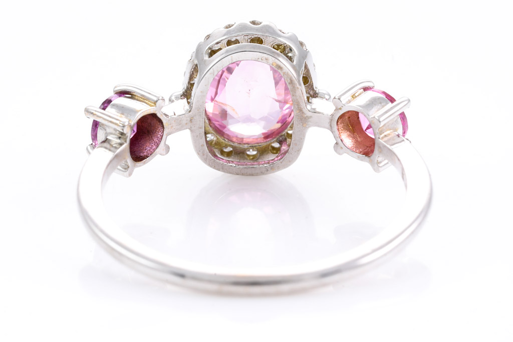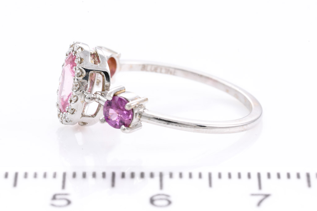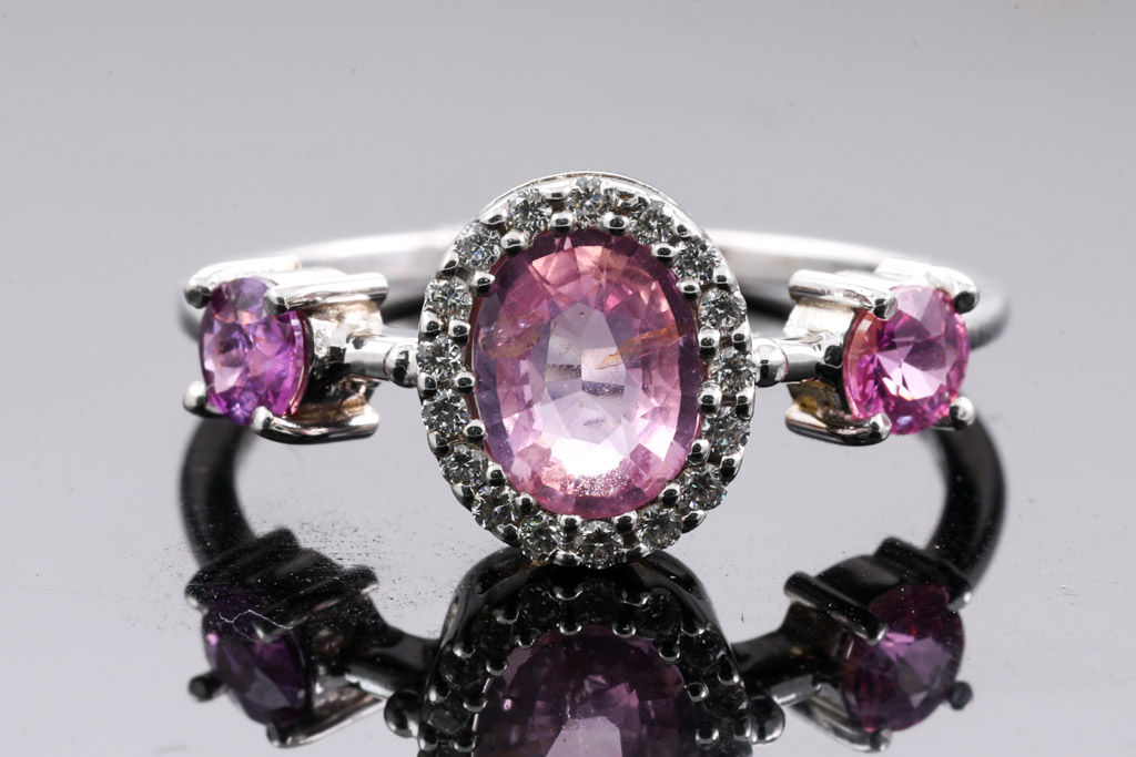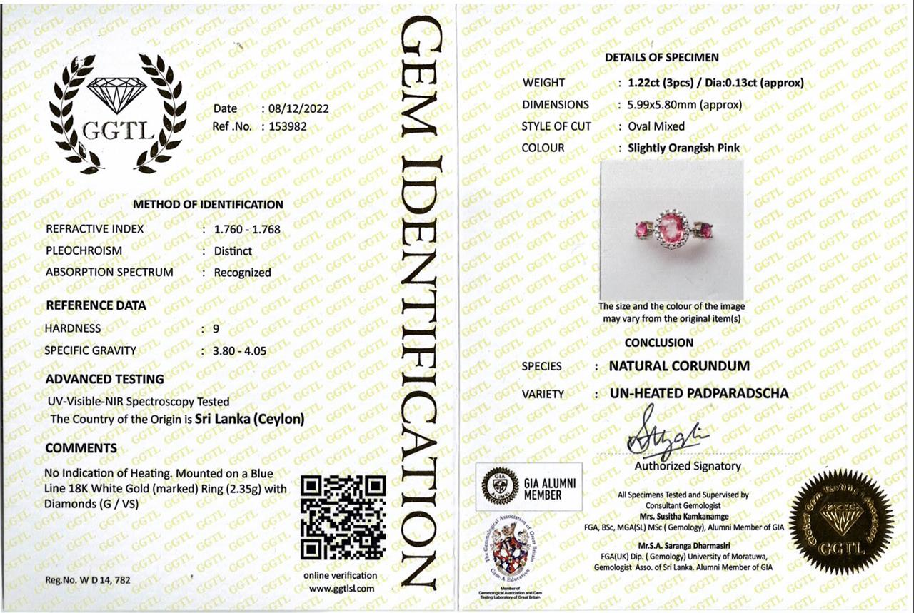 Sapphire and Diamond ring with Ceylon unheated oval Padparadscha Sapphires totalling 1.22cts and round Diamonds totalling approximately 0.13cts. 18ct white gold. Ring size M 1/2. Weight 2.3g. With Gem report #153982. (As New)