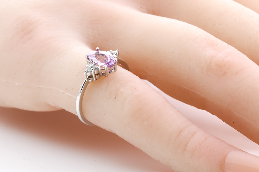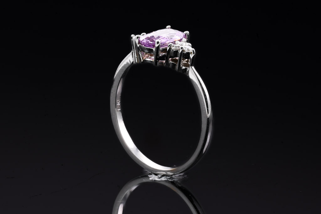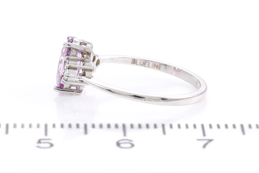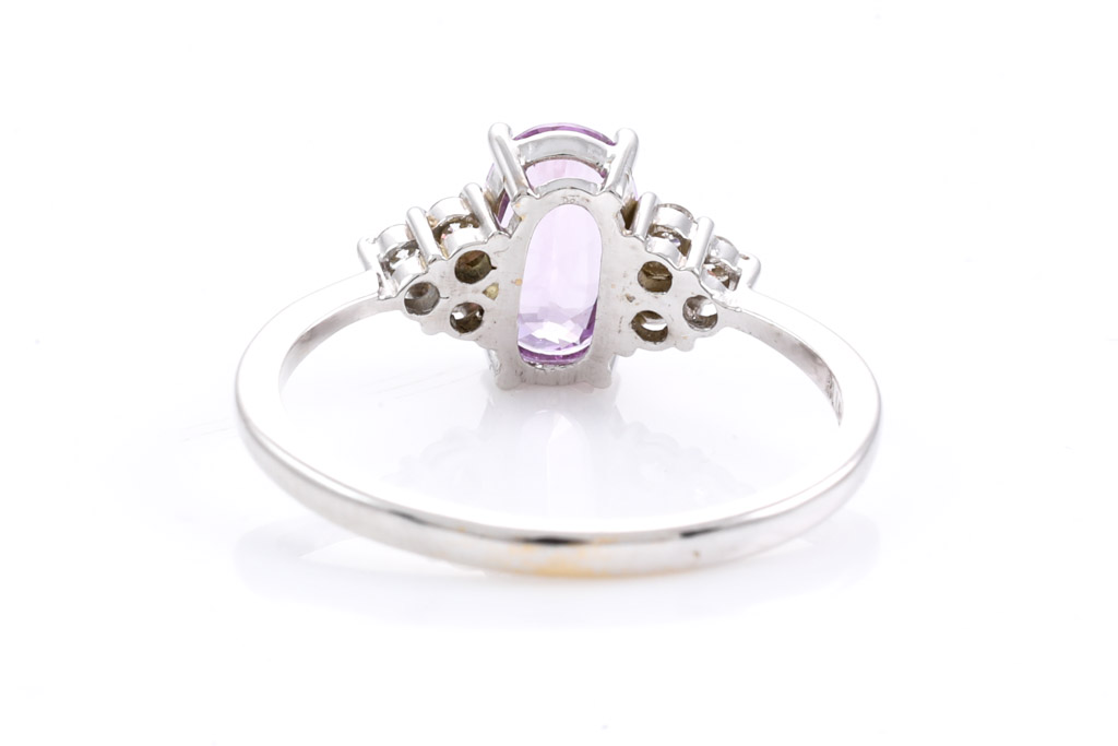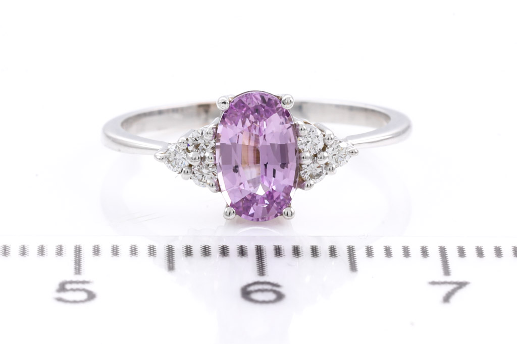 Sapphire and Diamond ring with oval cut pink unheated Ceylon Sapphire of 0.90ct and round Diamonds totalling approximately 0.09cts. 18ct white gold. Ring size H. Weight 1.6g. With gem Report #153975. (As New)