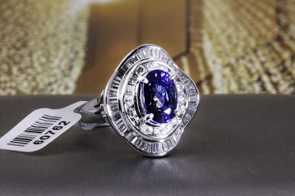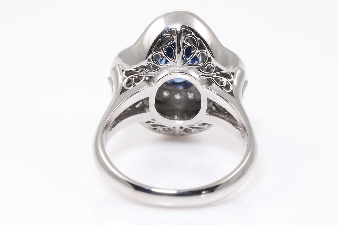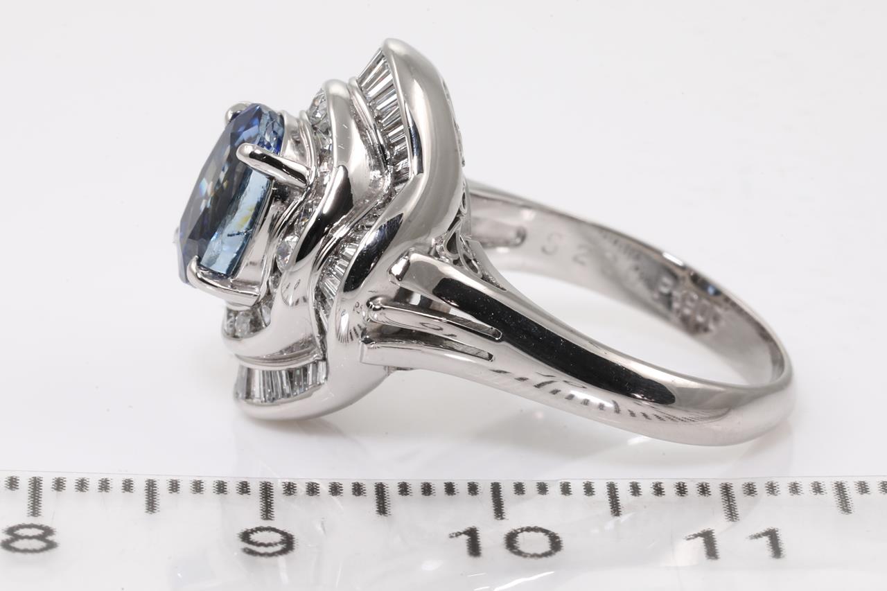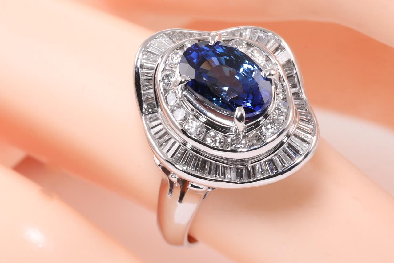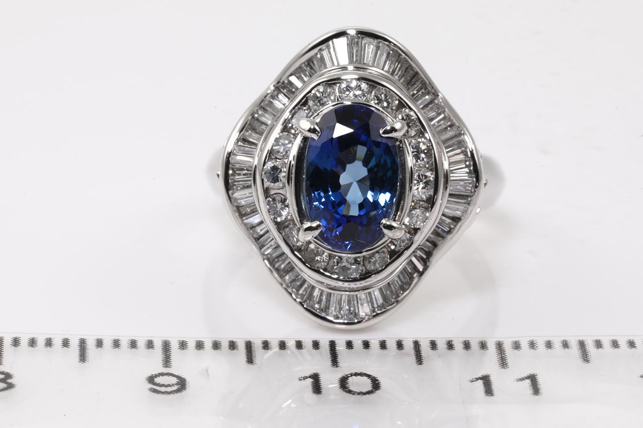 Sapphire and Diamond ring with centre oval shape unheated cornflower blue Sri Lankan Sapphire of 2.80cts and surrounding round & baguette cut Diamonds totalling 1.05cts (Estimated grading: G-H VS-SI). Platinum. Ring size: K. Weight: 10.2g. With AIGS report #GF21080060. (Pre-owned)