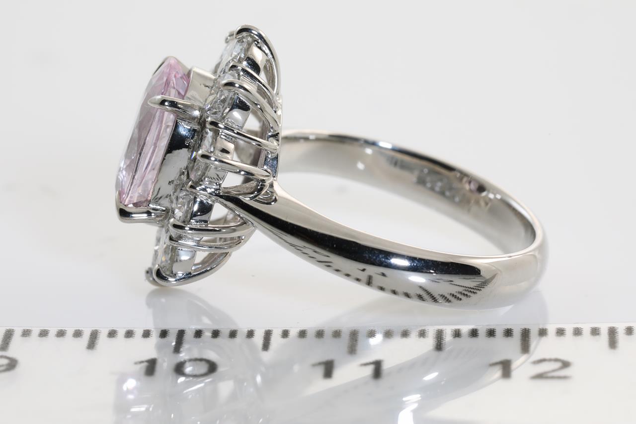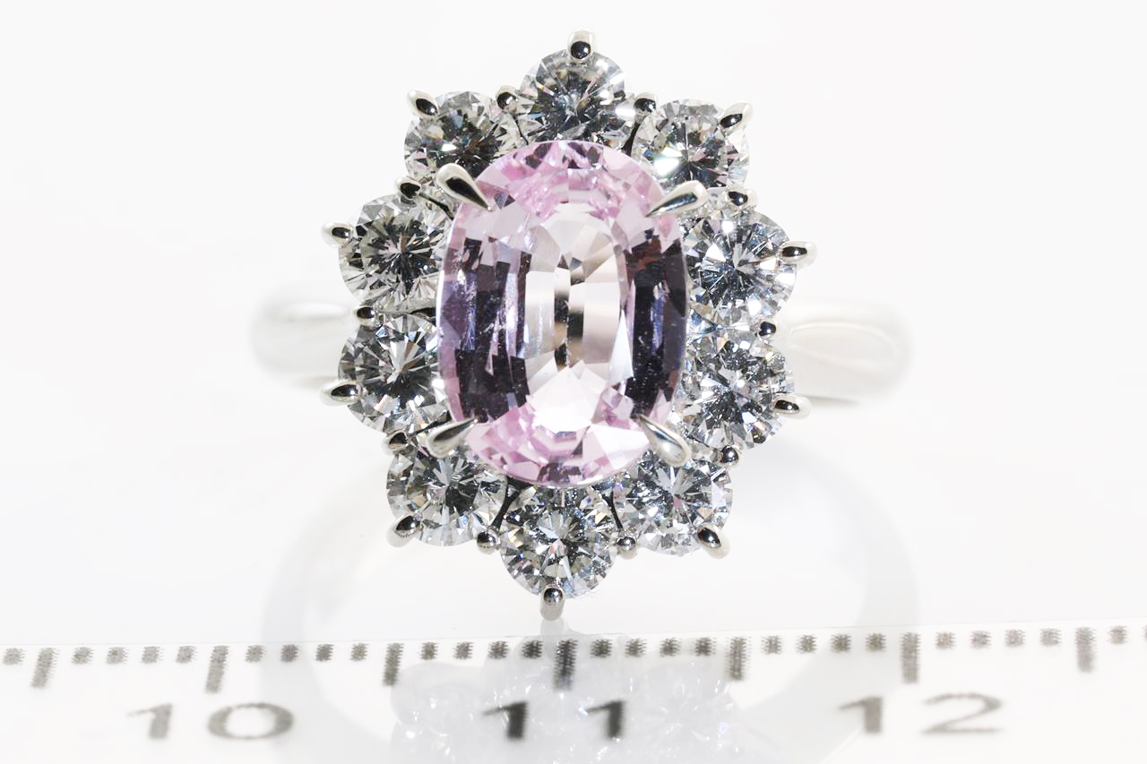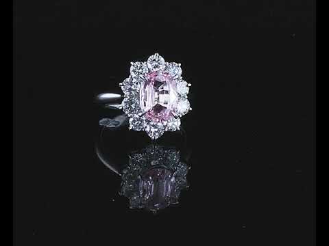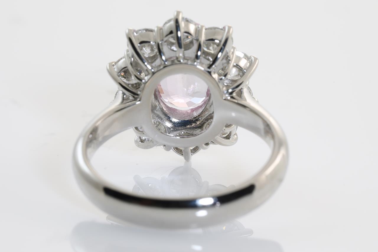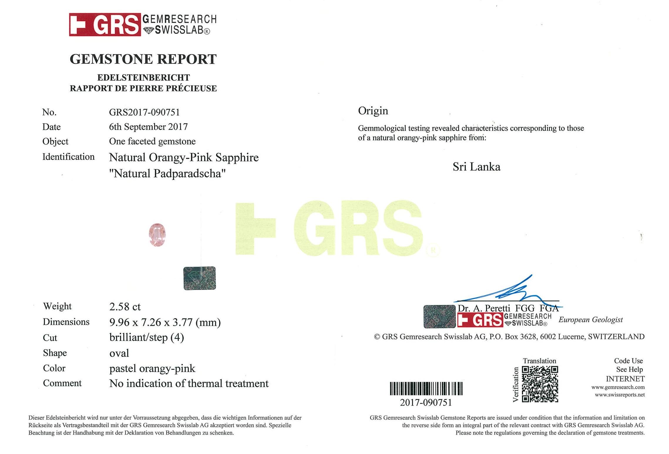 Sapphire and Diamond ring with an oval unheated Sri Lankan Padparadscha Sapphire of 2.58ct (With GRS report #090751) and Diamonds totalling 1.55cts (Estimated grading: G-H VS-SI). Platinum. Ring size L. Weight: 8.6g. (Pre-owned)
