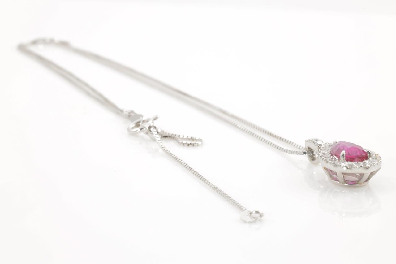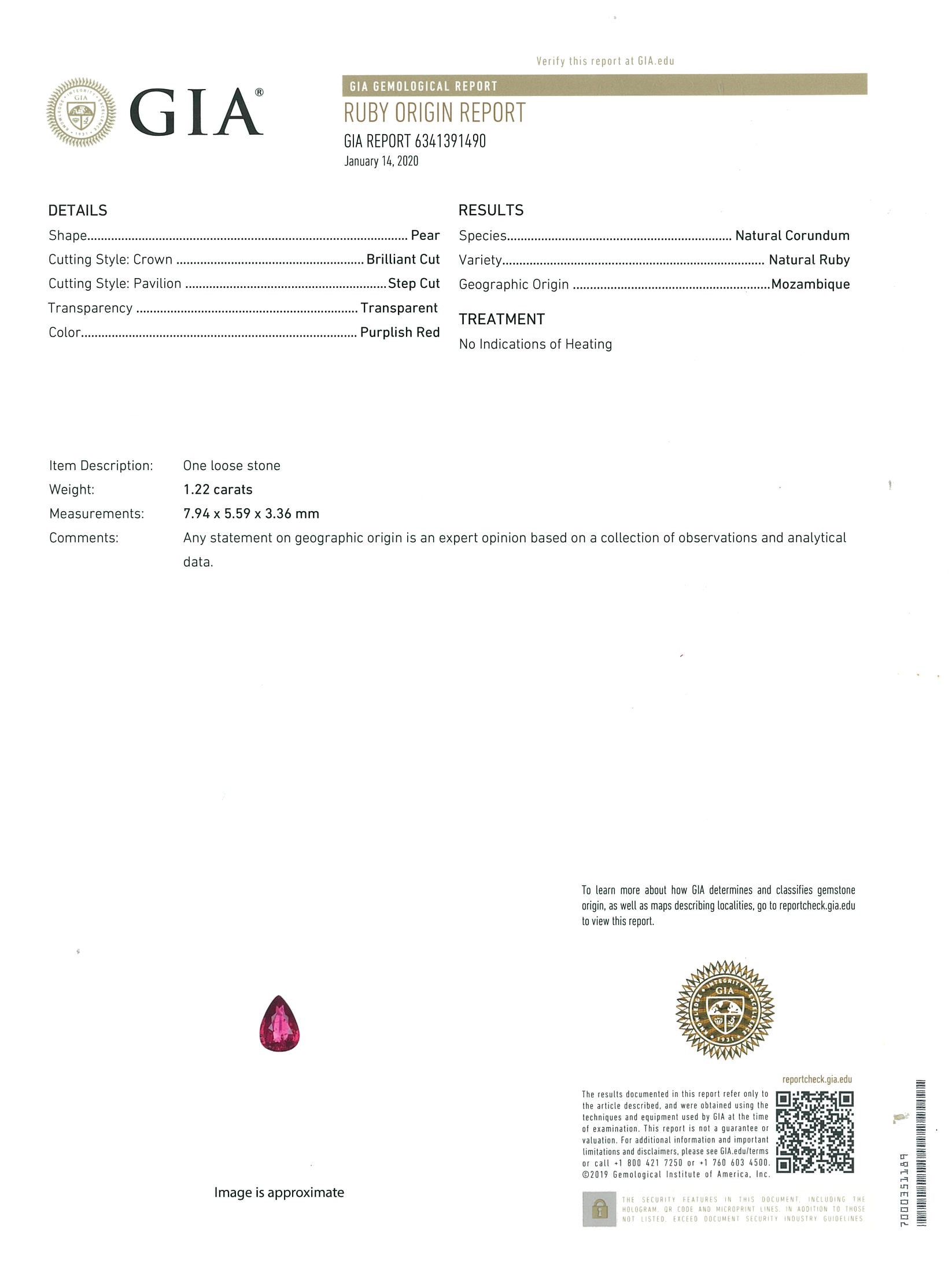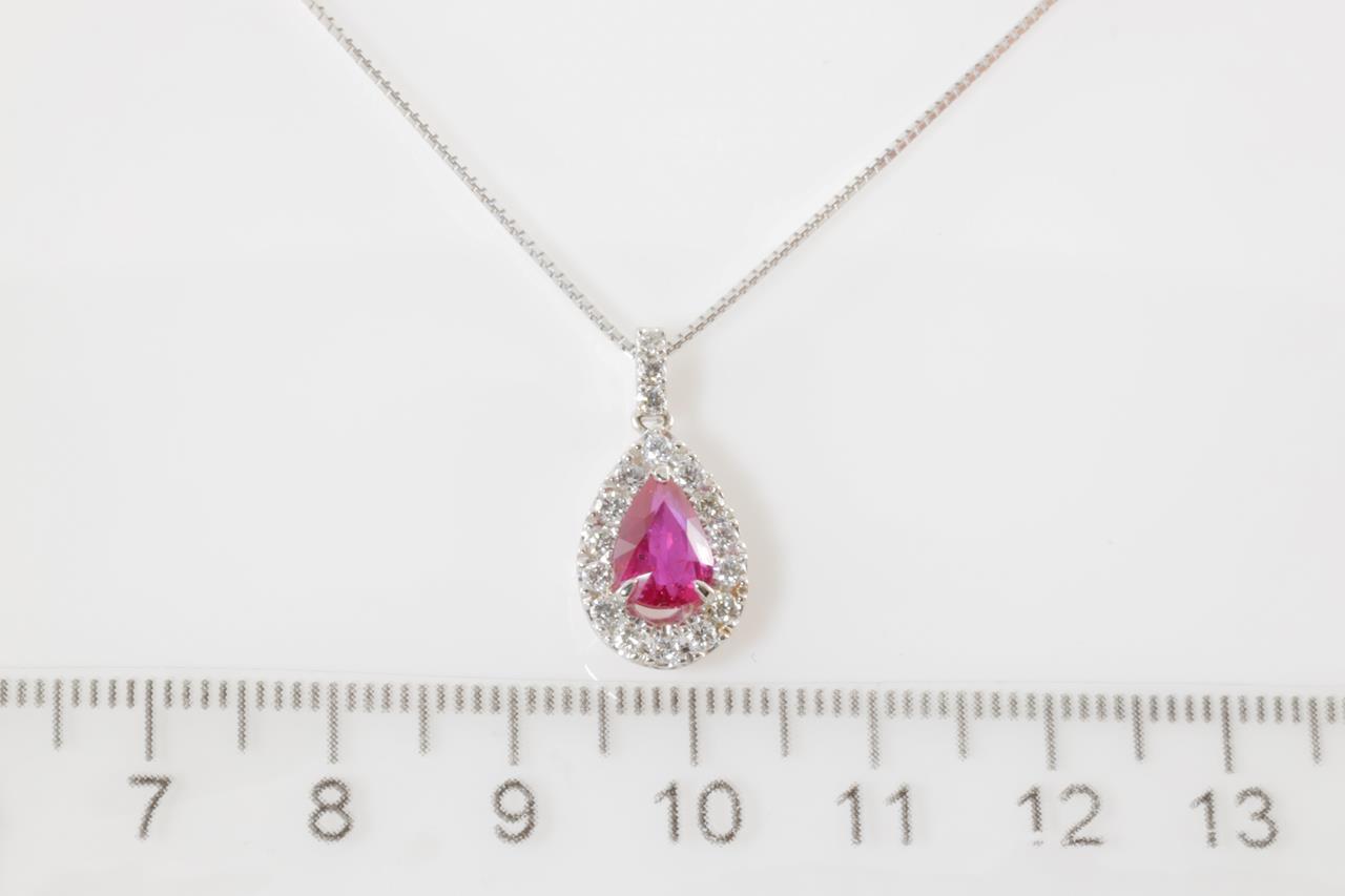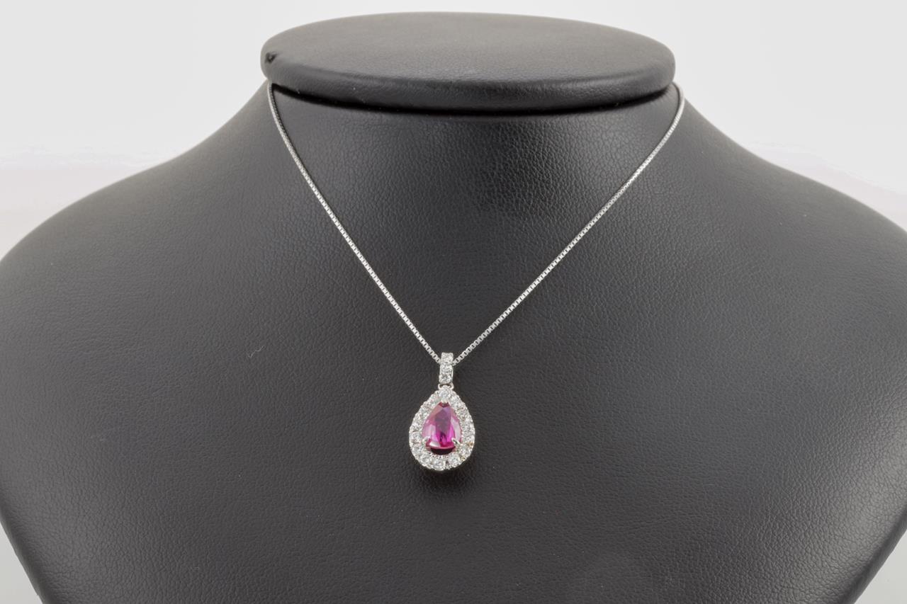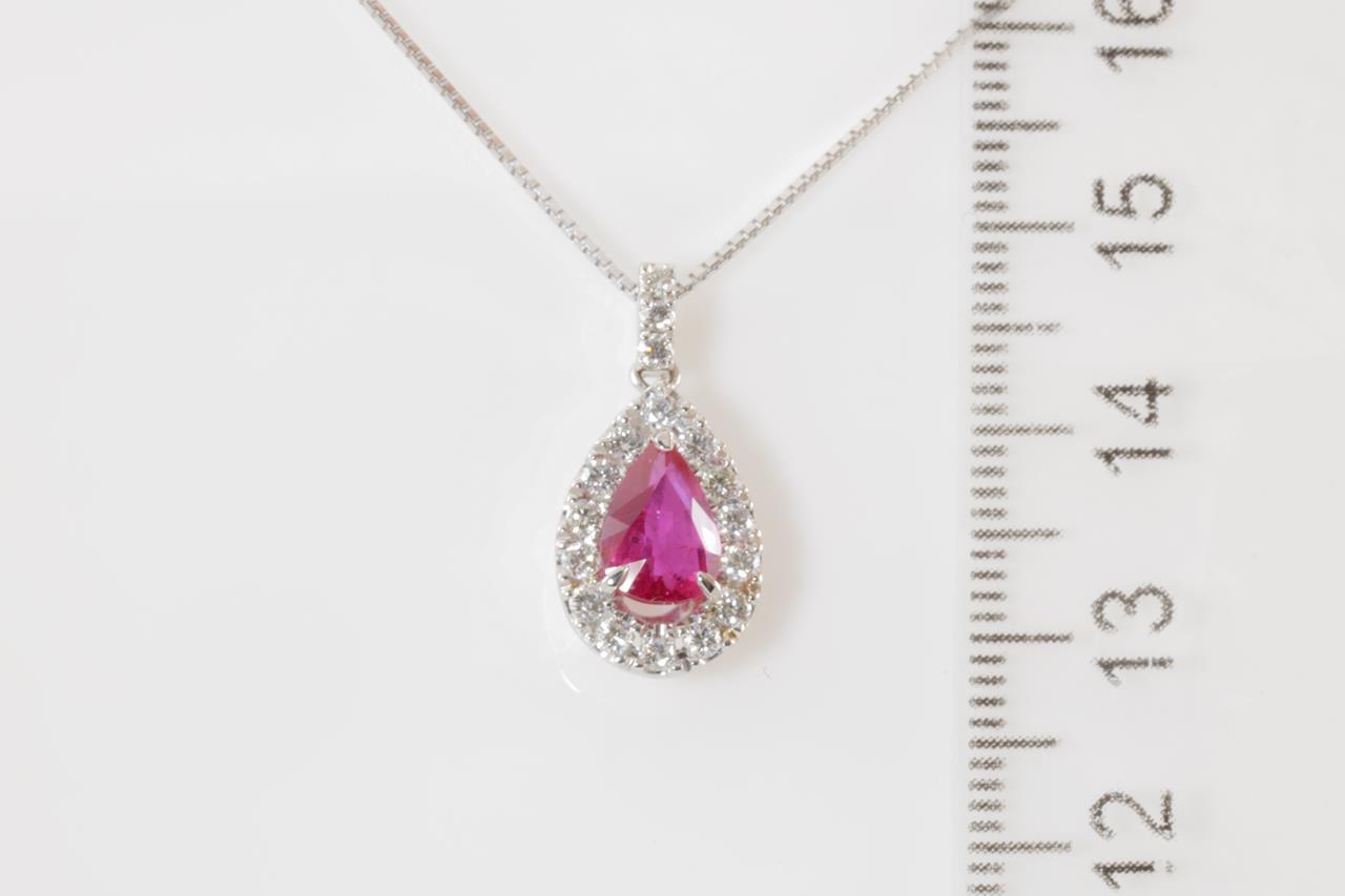 Ruby and Diamond pendant with a pear shape purplish-red unheated Mozambique Ruby of 1.22ct (With GIA report #6341391490) and Diamonds totalling 0.32cts (Estimated grading: G-H SI). Platinum with 18ct white gold 44cm chain. Weight: 4.8g (Pre-owned)