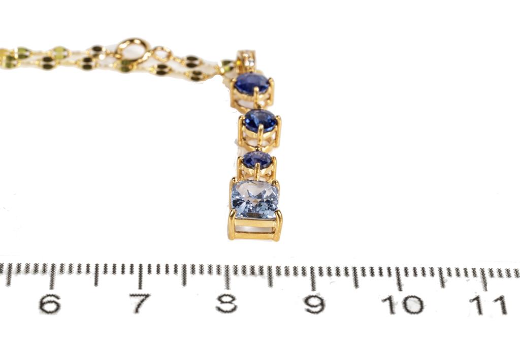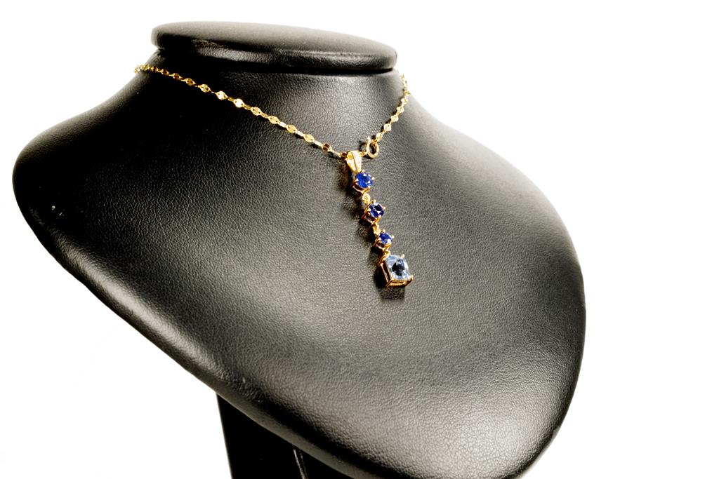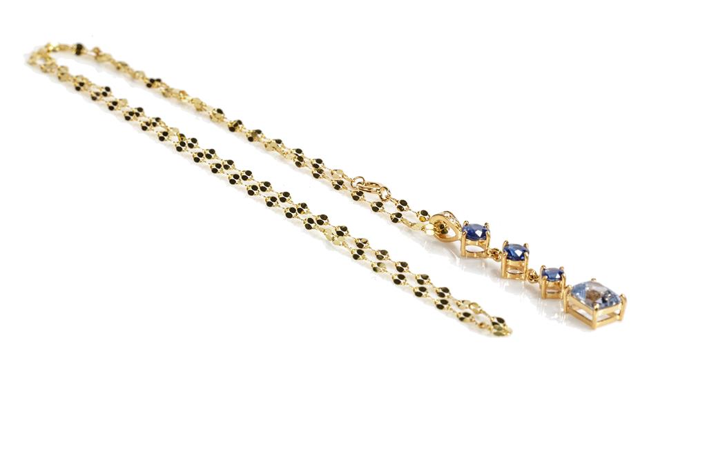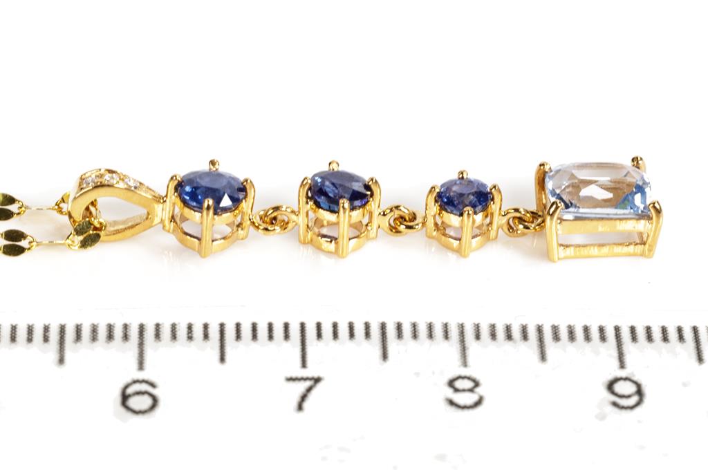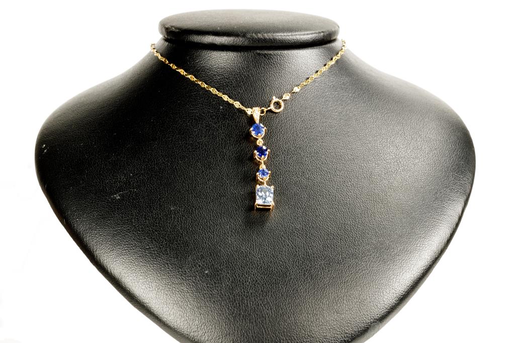 Sapphire and Diamond Pendant with unheated Ceylon cushion cut light blue Saphhire and 3 round blue Sapphires totalling 2.62ct and round Diamonds totalling 0.02cts. 18ct yellow gold with 45cm 18ct yellow gold chain. Weight 3.4g. (As New)