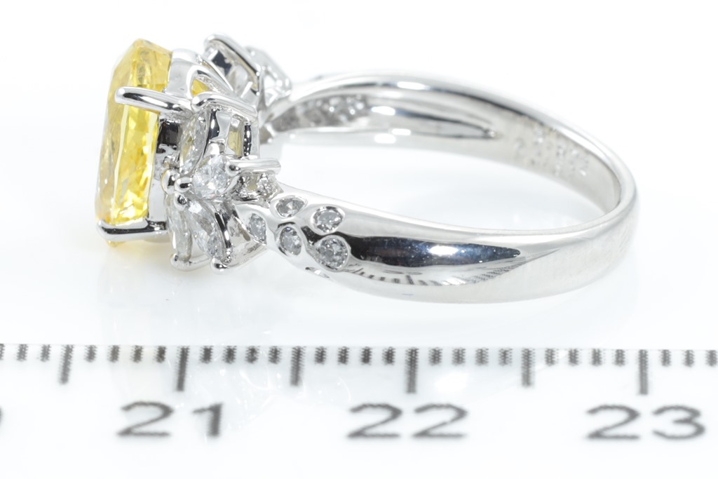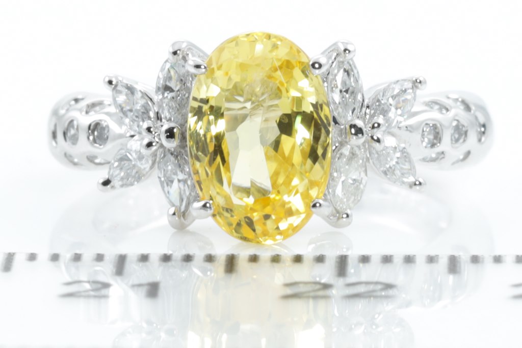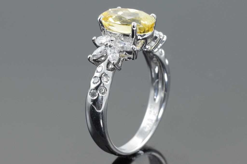 Sapphire and Diamond ring with centre oval shape unheated yellow Sapphire of 2.87ct and marquise & round cut Diamonds totalling 0.52cts (Estimated grading: G-I SI). Platinum. Ring size: L - ring resizing is not recommended. Weight: 6.7g. (Pre-owned)