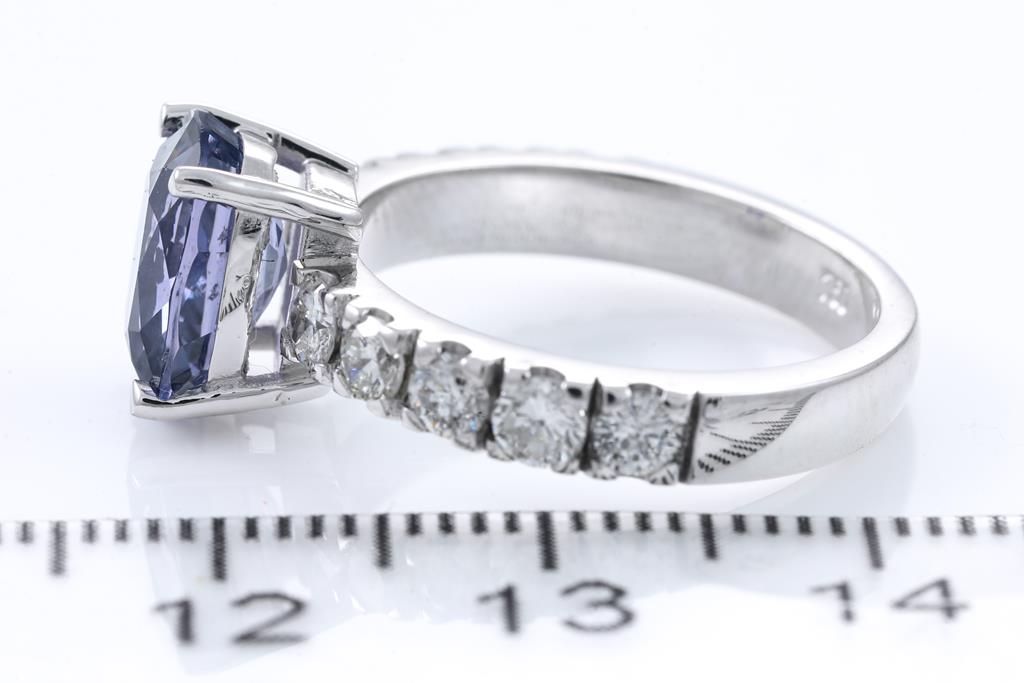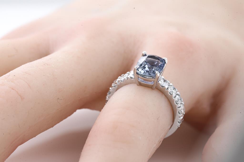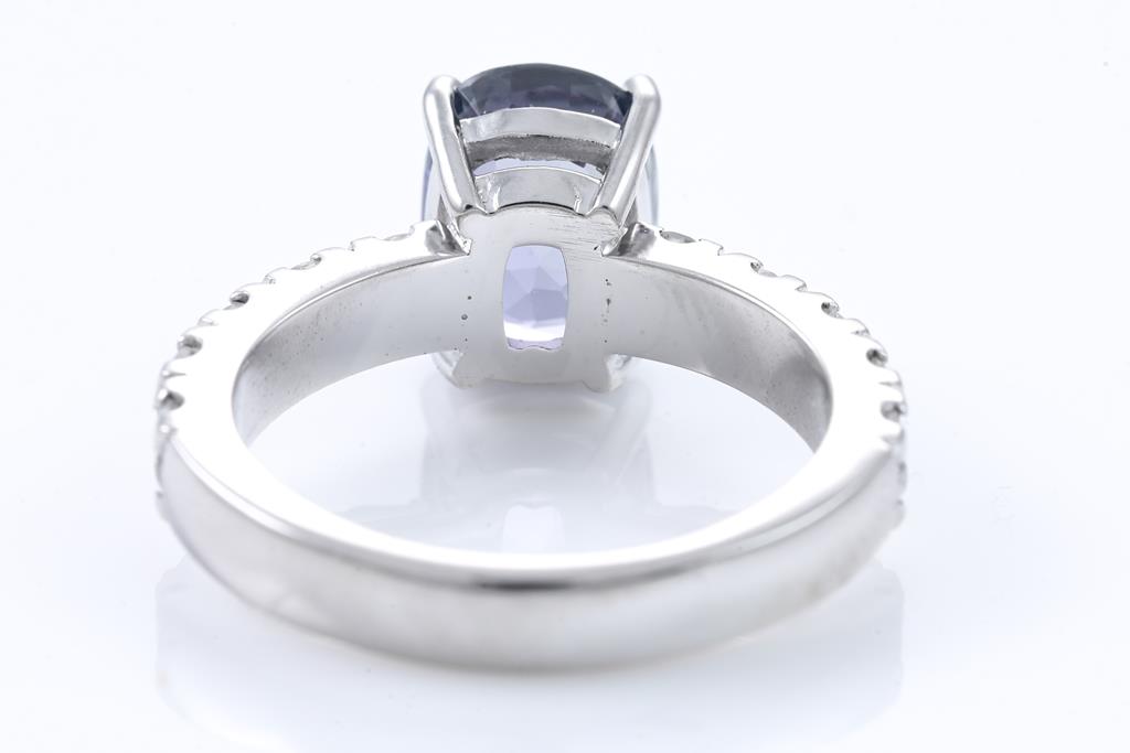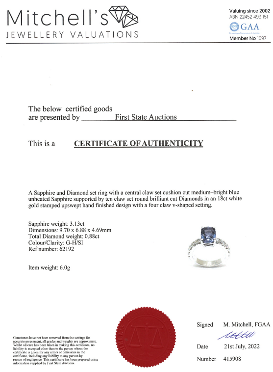 Sapphire and Diamond ring with a cushion cut unheated blue Sapphire of 3.13ct and 10 round Diamonds totalling 0.88cts (Estimated grading: G-H SI). 18ct white gold. Ring size L. Weight 6.0g. With certificate #415908. (New)