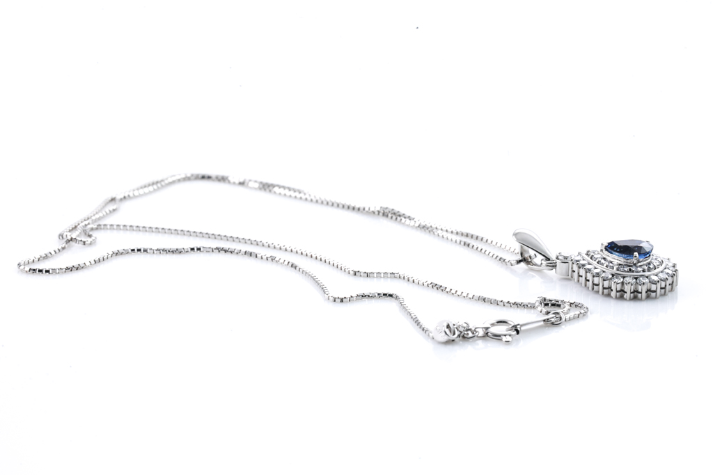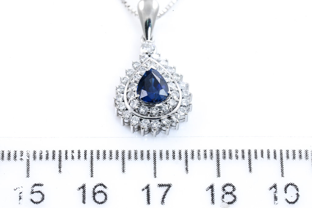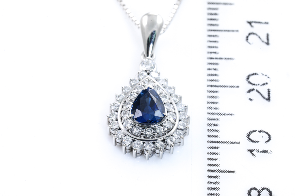 Sapphire and Diamond pendant with pear shape Unheated Cornflower Blue Sapphire of 1.14ct and round Diamonds totalling 0.57cts (Estimated grading: G-H SI). Platinum with 18ct white gold adjustable 44cm chain. Weight: 5.5g. With AIGS Certificate #GF22081334. (Pre-owned)