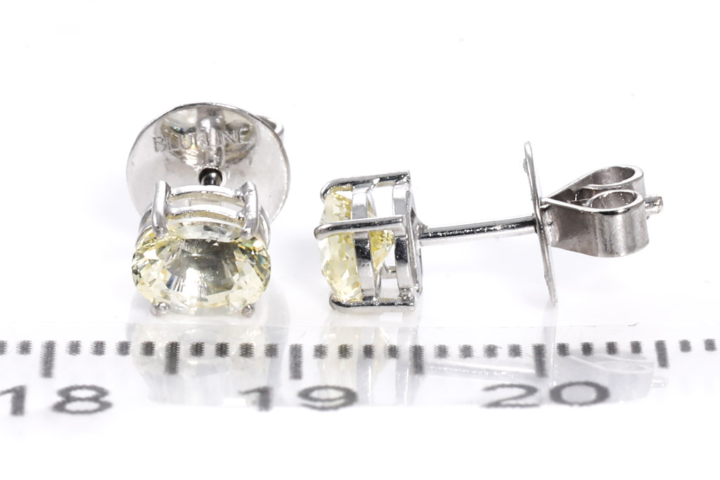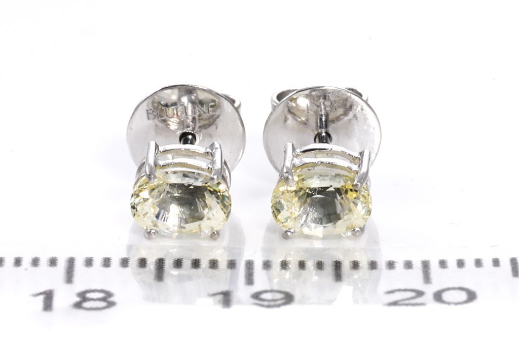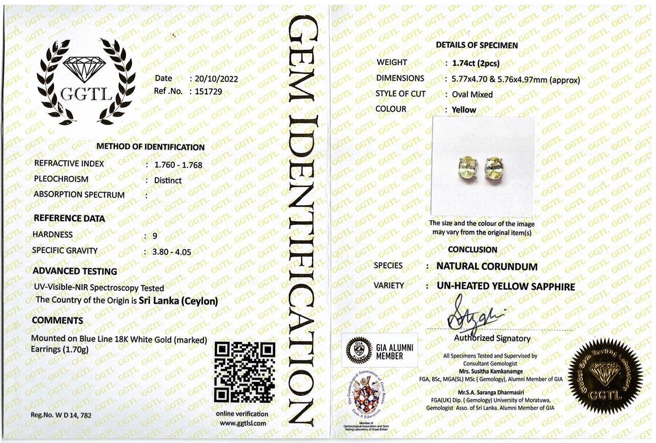 Sapphire earrings with oval unheated Ceylon yellow Sapphires totalling approximately 1.74cts. 18ct white gold. Weight 1.7g. With GGTL #151729. (As New)