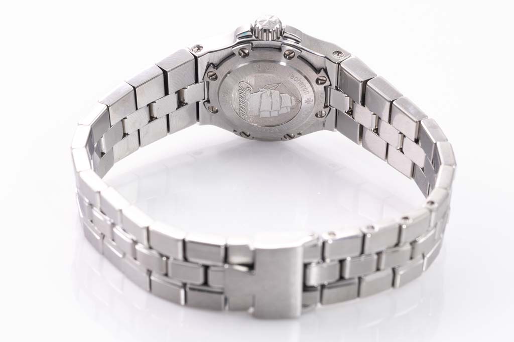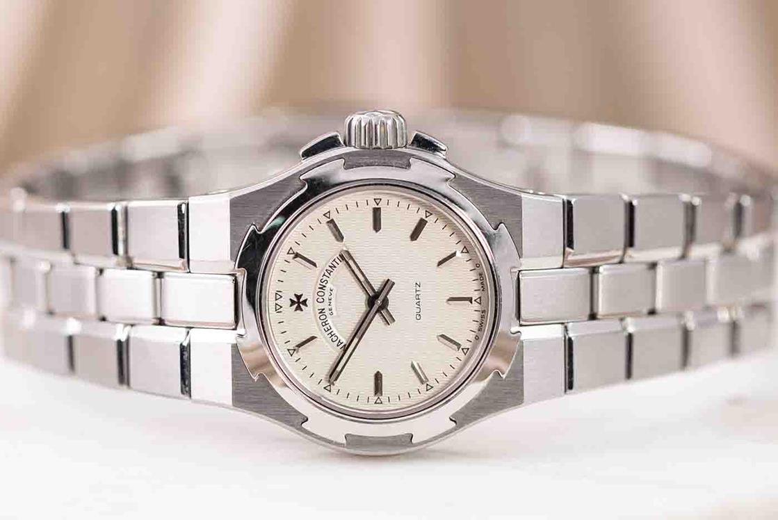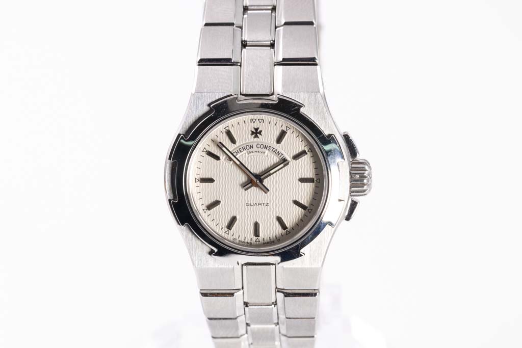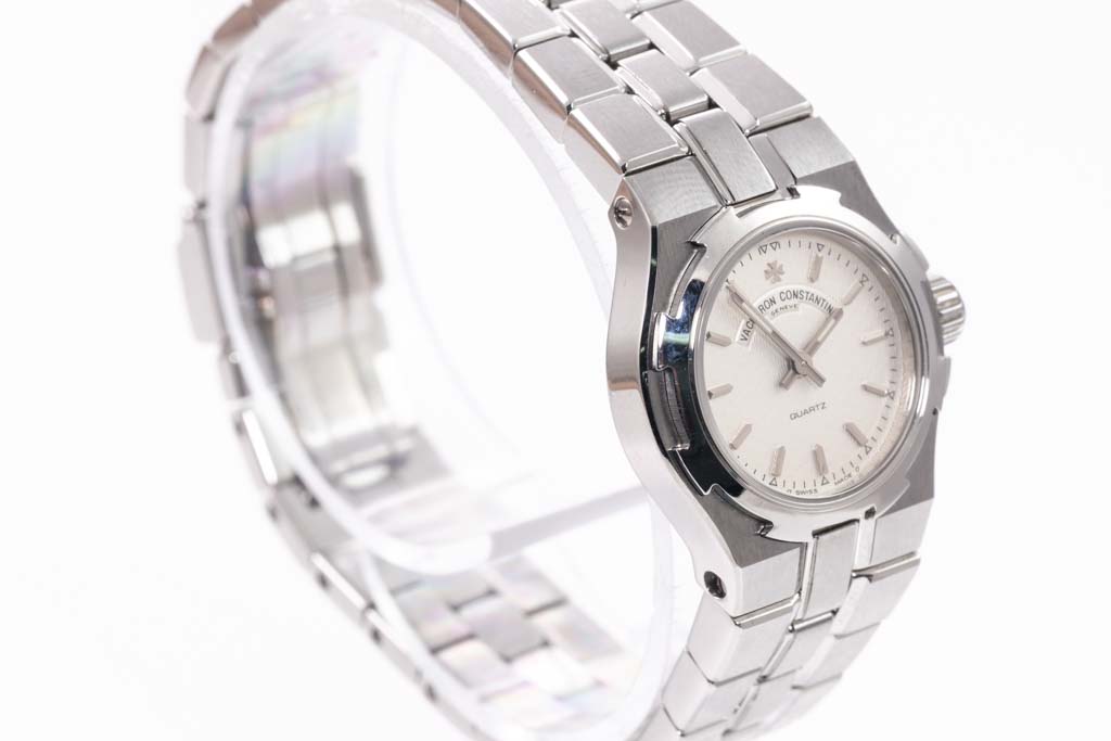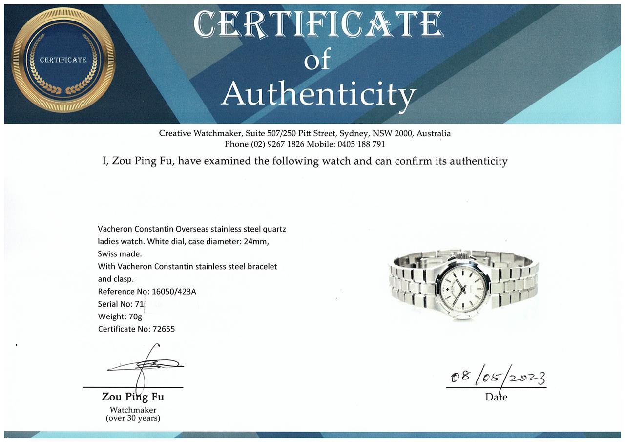 Vacheron Constantin Overseas stainless steel quartz ladies watch. White dial, case diameter: 24mm, wrist size: 15cm, Swiss made. Ref# 16050/423A. With Vacheron Constantin stainless steel bracelet and clasp. With Certificate of Authenticity, Vacheron Constantin Certificate of Origin and Warranty dated 30/07/2002 and Vacheron Constantin box. 6 month Creative watchmaker warranty from the date of full service. (Pre-owned)
