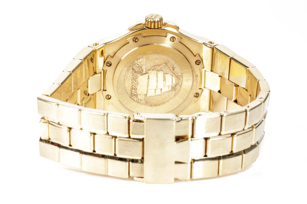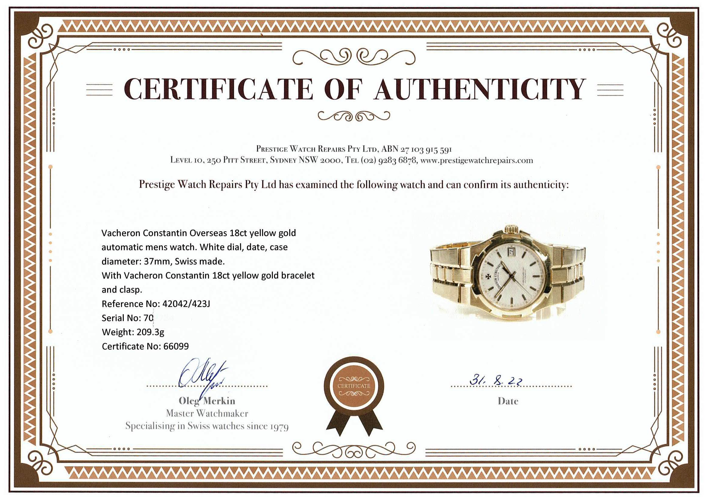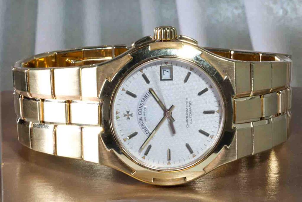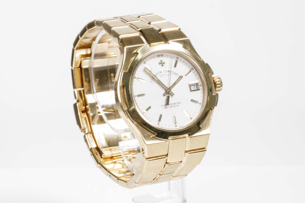 Vacheron Constantin Overseas 18ct yellow gold automatic mens watch. White dial, date, case diameter: 37mm, wrist size: 17cm, Swiss made. Ref# 42042/423J. With Vacheron Constantin 18ct yellow gold bracelet and clasp. With Certificate of Authenticity. 3 month FSA warranty. (Pre-owned)