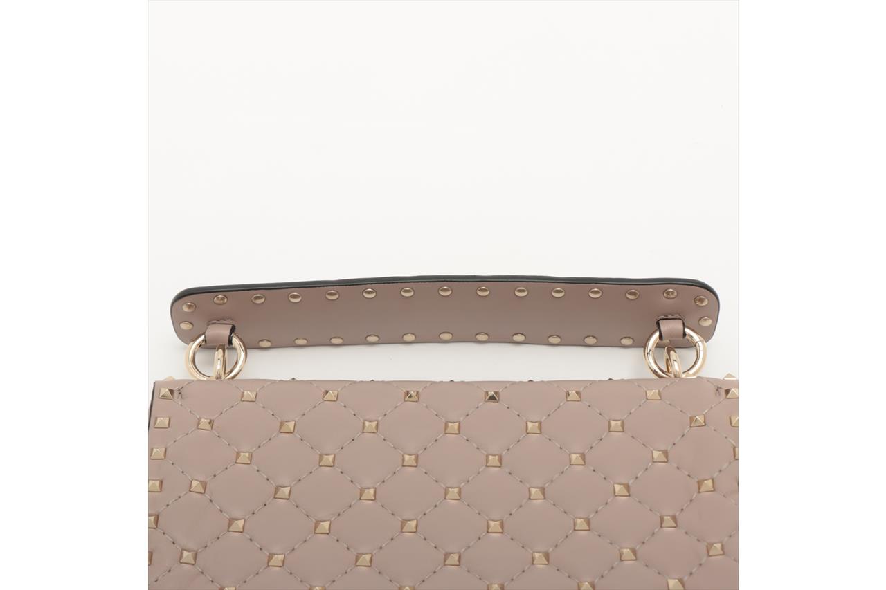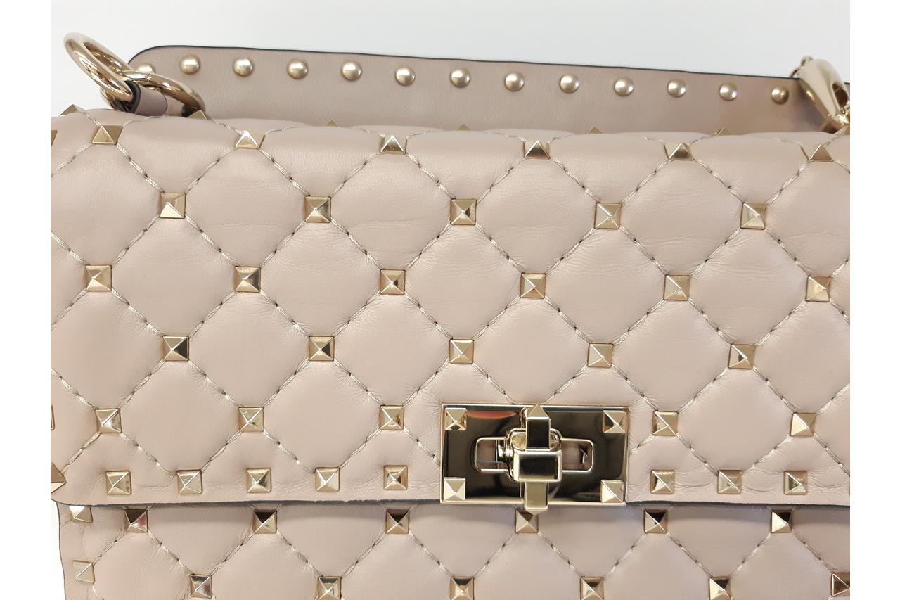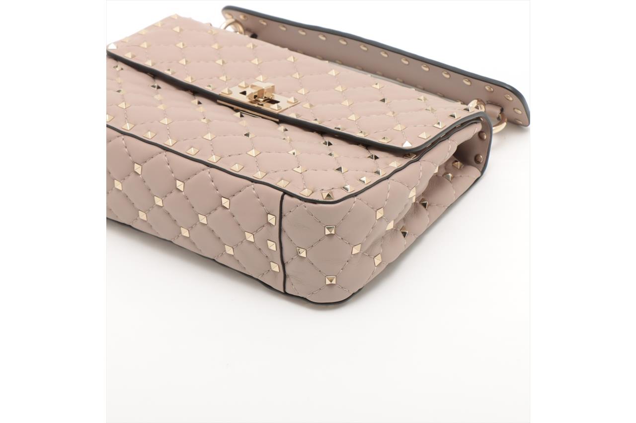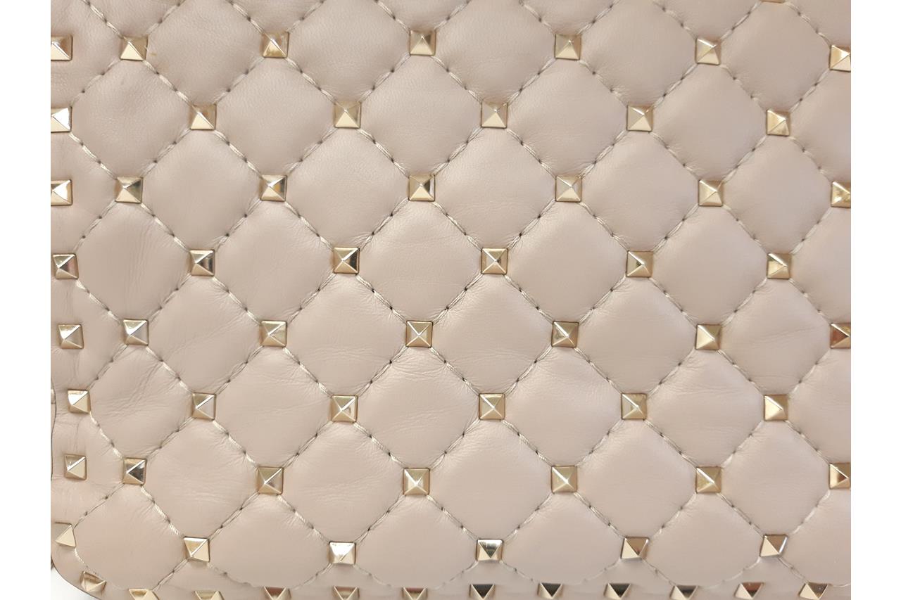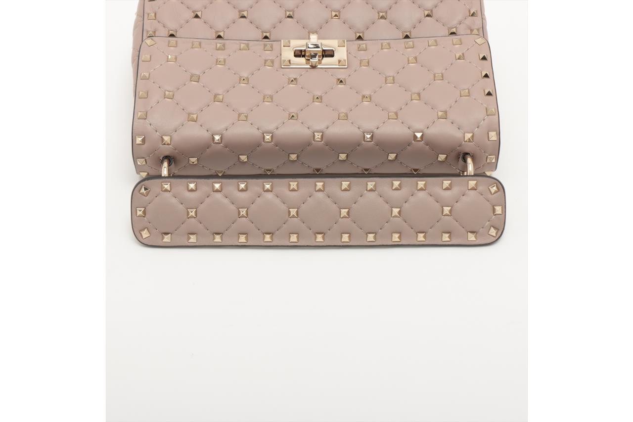 Valentino Garavani medium Rockstud Spike bag in poudre colour quilted nappa lambskin leather. Featuring small studs embellished, a detachable handle, gold-toned hardware, frontal flap with twist-lock closure. The flap opens to a nappa leather lined interior with a red leather zip pocket. Approximate dimensions: 23cm(L) x 16cm(H) x 6.5cm(D), 67cm detachable chain drop height. Accompanied by spare studs and cards. With Entrupy Certificate of Authenticity. (Pre-owned)