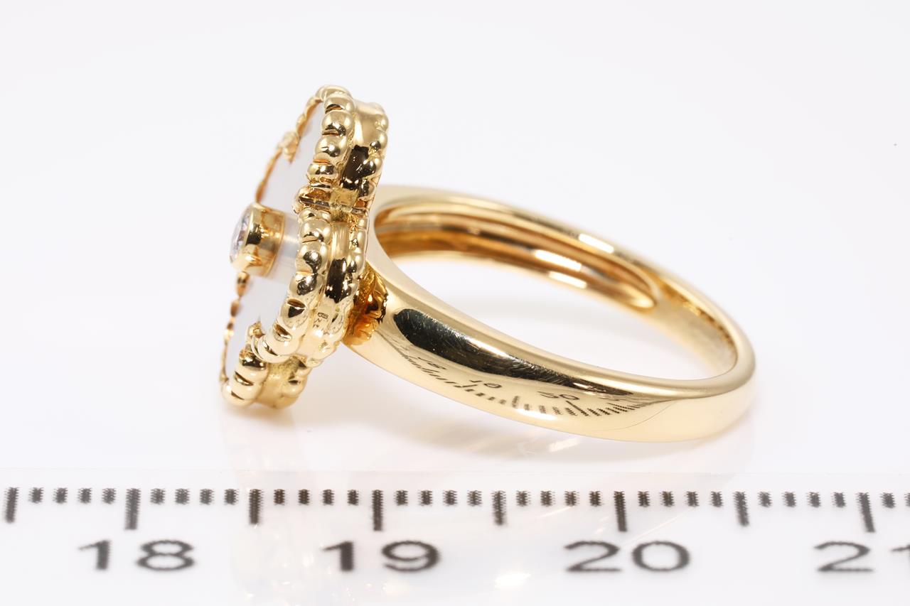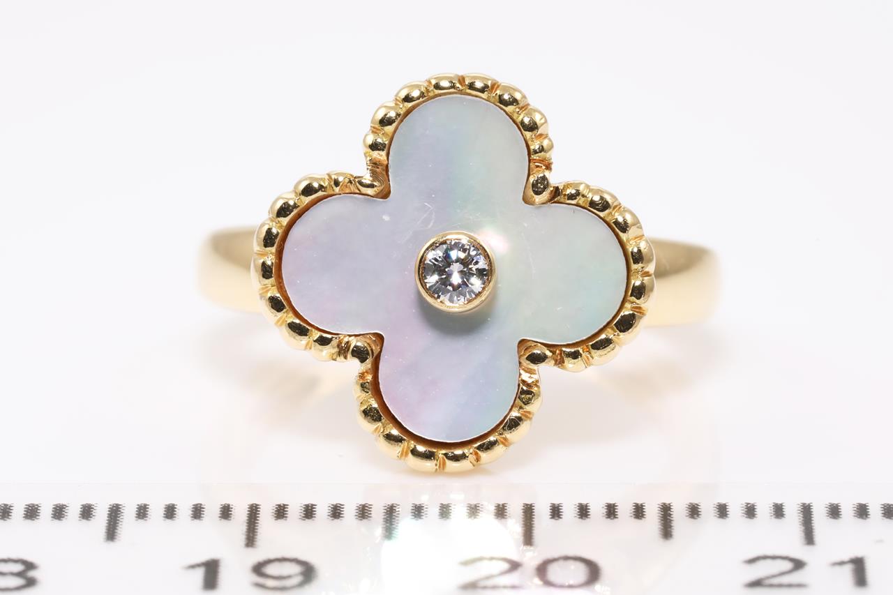 Van Cleef & Arpels Vintage Alhambra Mother of Pearl ring with a round Diamond of 0.06ct. 18ct yellow gold. Ring size K - ring resizing is not recommended. Weight: 6.7g. With Van Cleef & Arpels pouch and Van Cleef & Arpels authenticity certificate dated 16/08/2004. (Pre-owned)