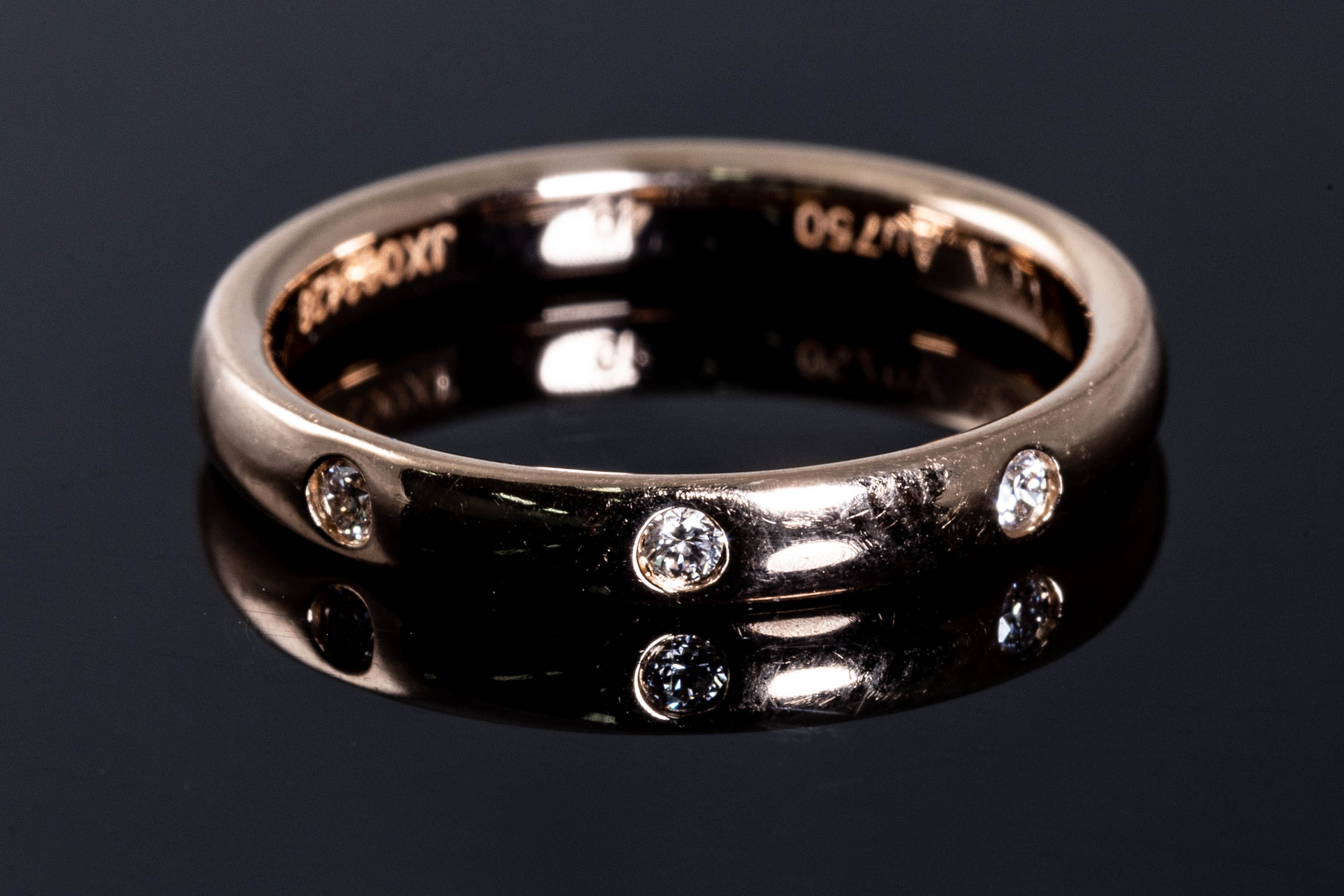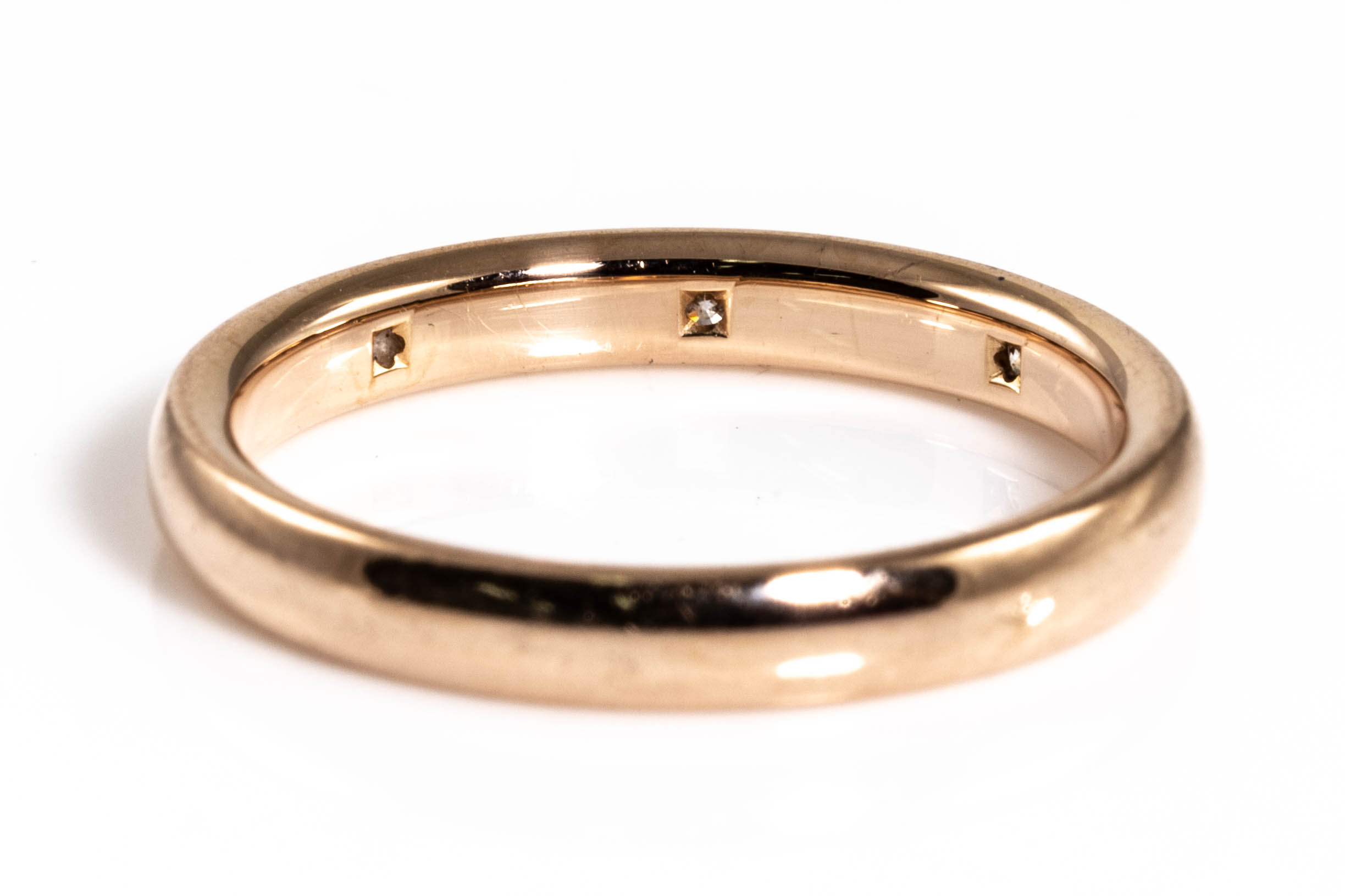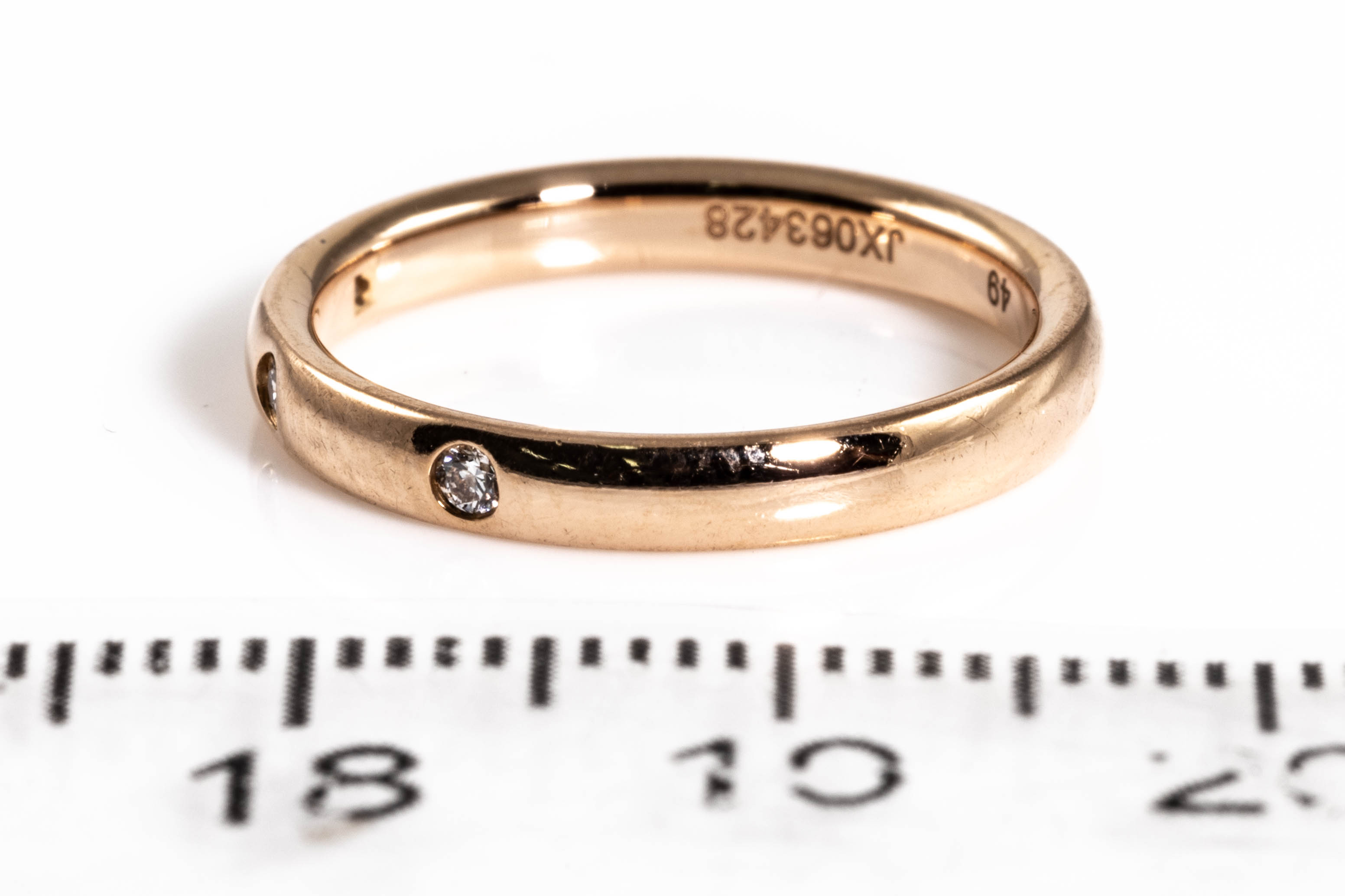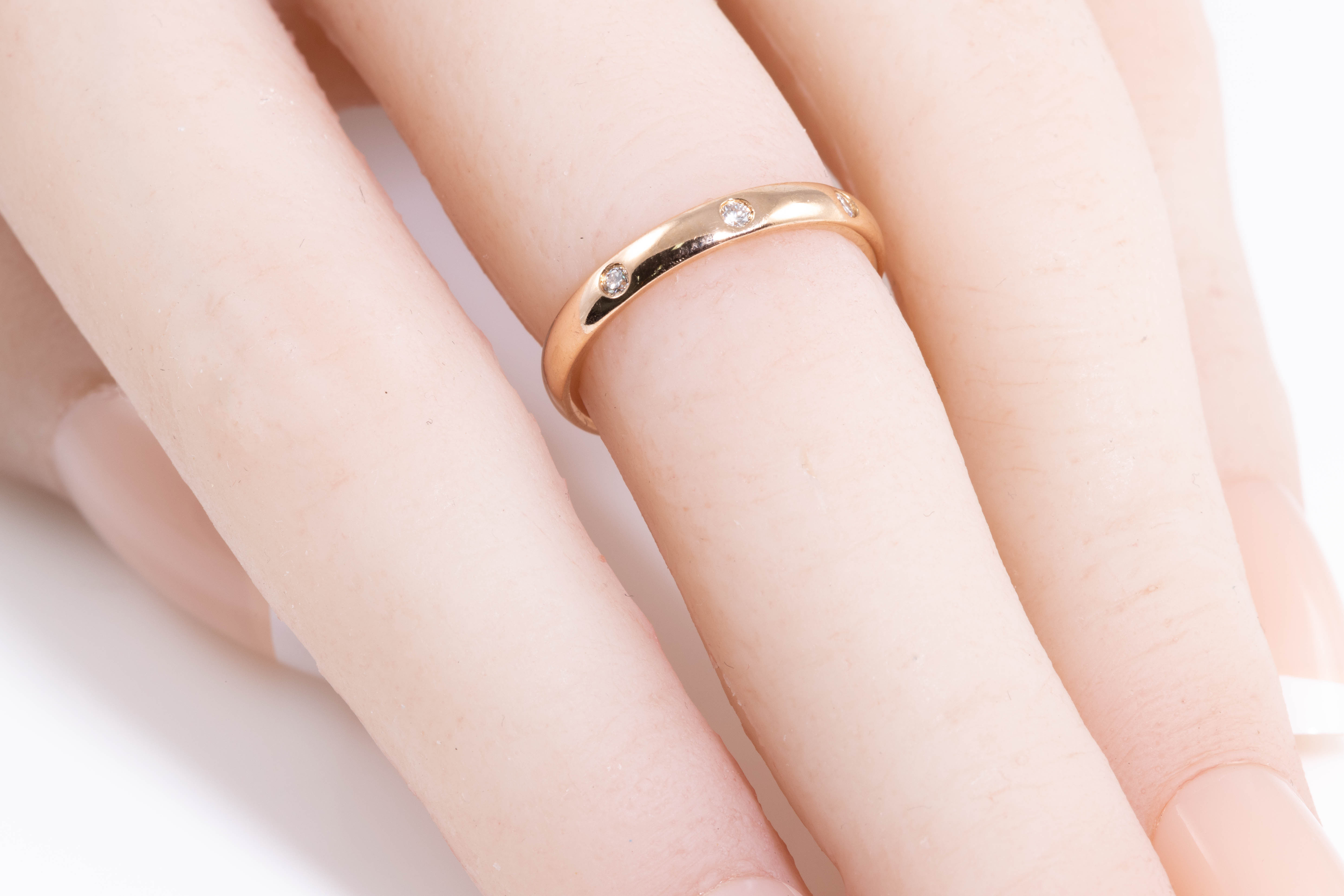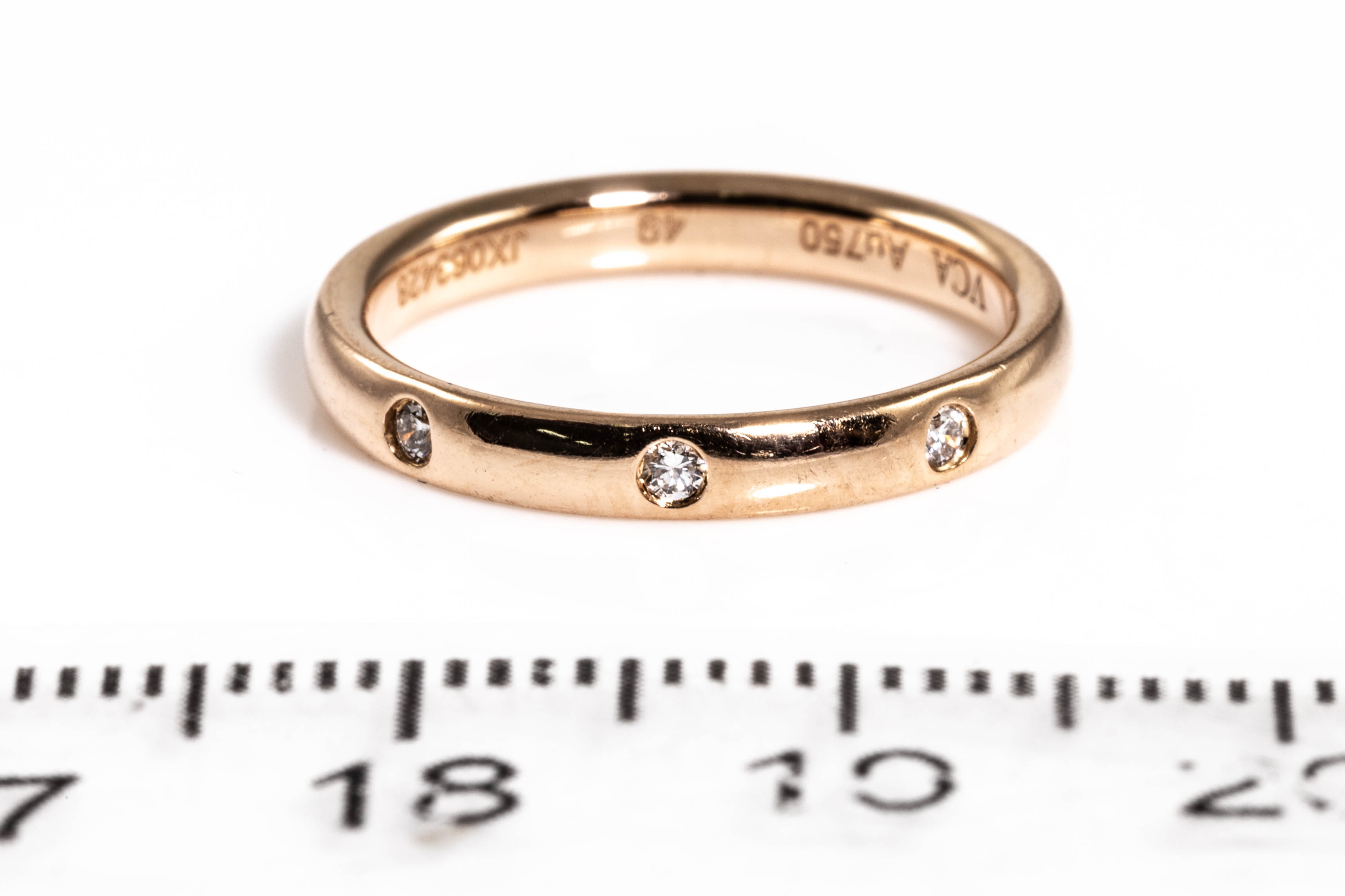 Van Cleef & Arpels Tendrement Etoiles Diamond wedding band with 3 round Diamonds totalling 0.06cts. 18ct rose gold. Van Cleef & Arpels stamped size 49, ring size J - ring resizing is not recommended. Weight: 2.8g. (Pre-owned)
