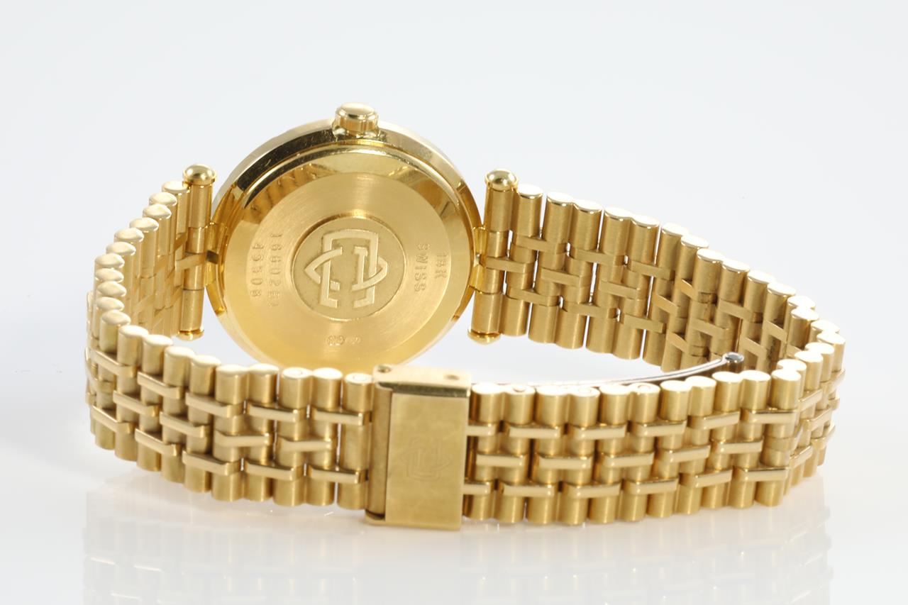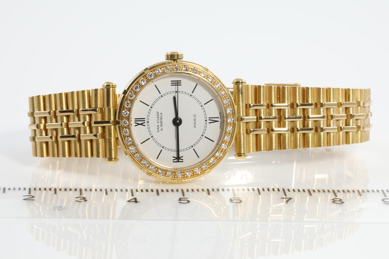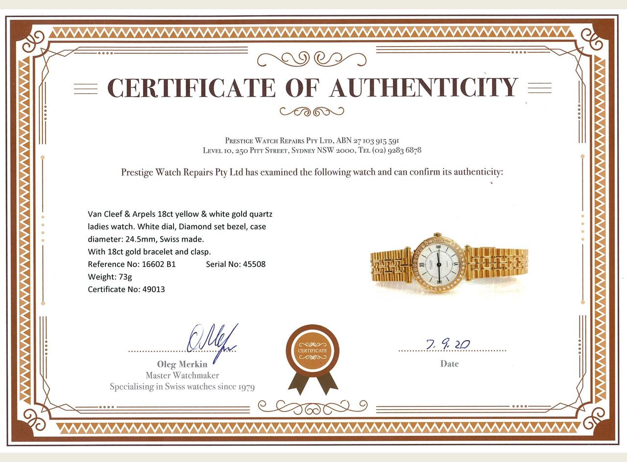 Van Cleef & Arpels 18ct yellow & white gold quartz ladies watch. White dial, Diamond set bezel, case diameter: 24.5mm, wrist size: 14cm, Swiss made. Ref# 16602 B1. With 18ct gold bracelet and clasp. With certificate of authenticity. 3 month FSA warranty. (Pre-owned)