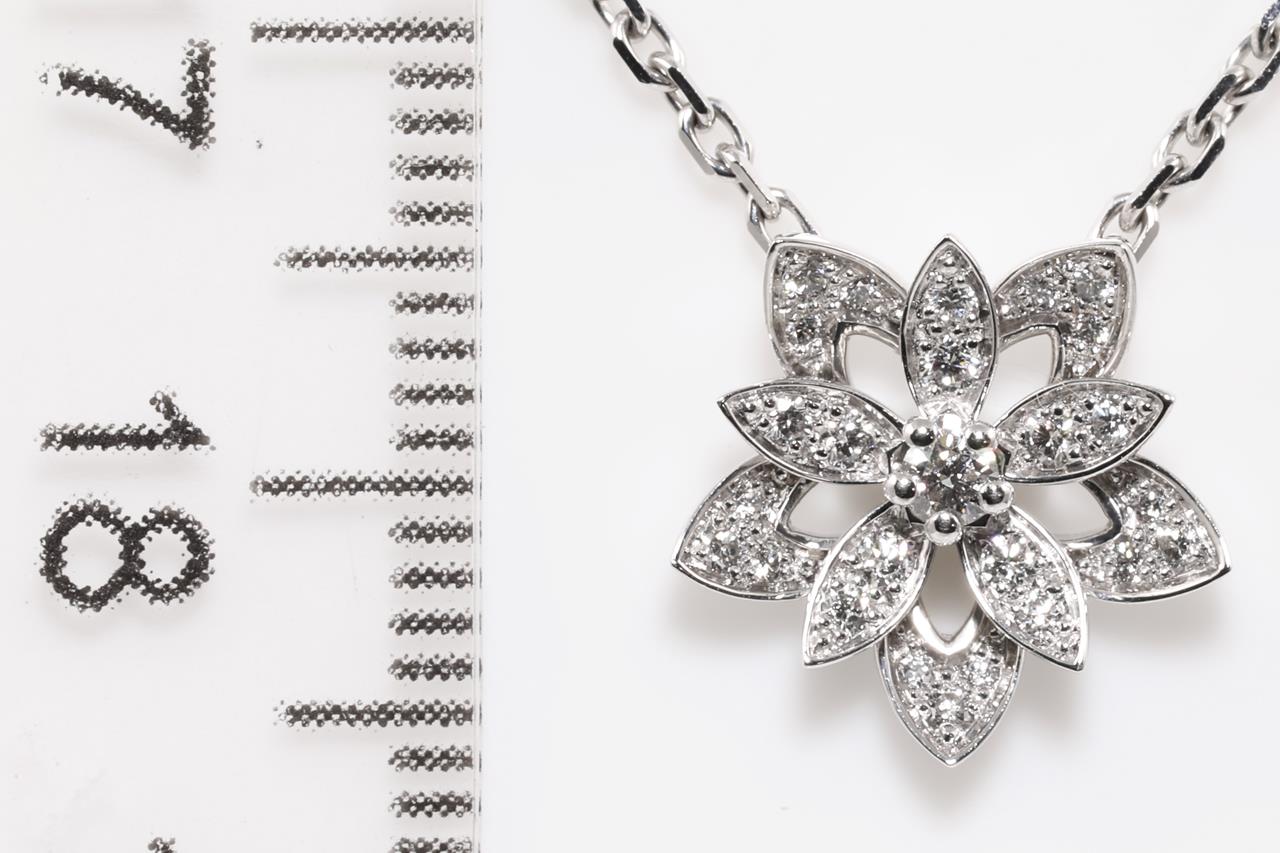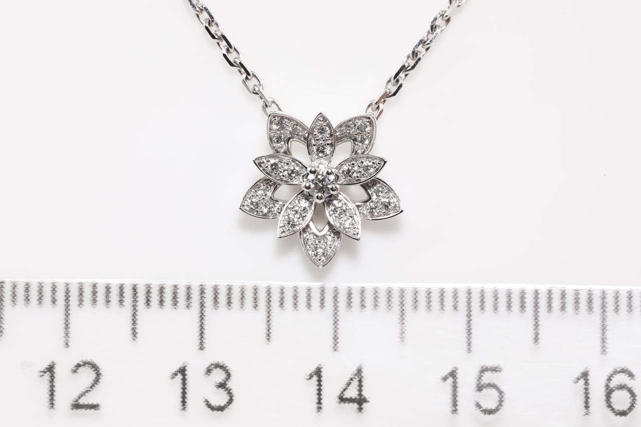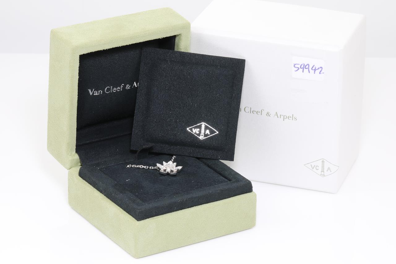 Van Cleef & Arpels Lotus openwork pendant mini model. Ref# VCARP0ZW00. 26 Diamonds totalling 0.16cts. 18ct white gold with attached chain. Adjustable max length: 42cm. With Van Cleef & Arpels box. Weight: 4.9g. With certificate #415003. (Pre-owned)