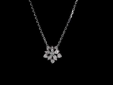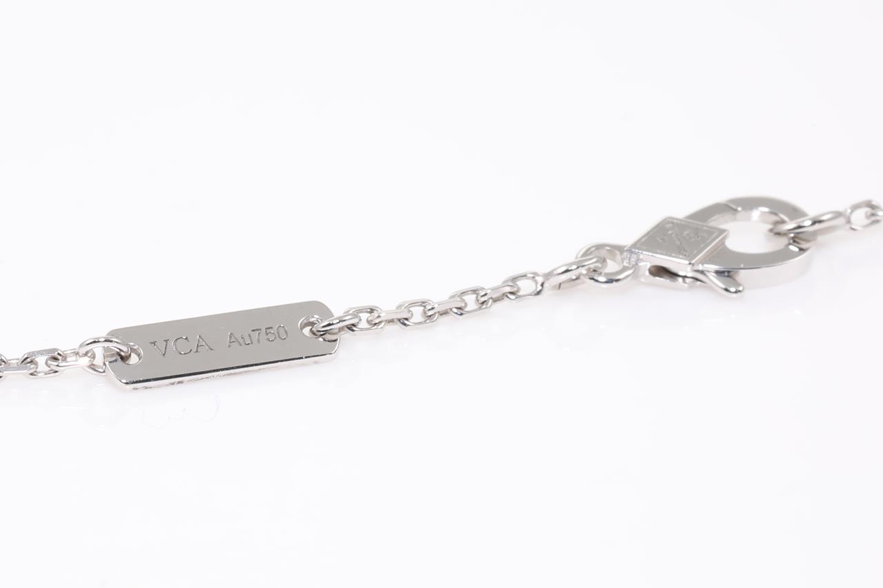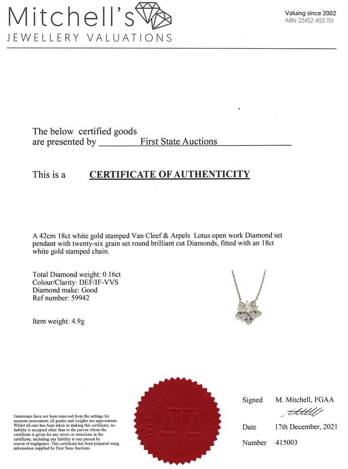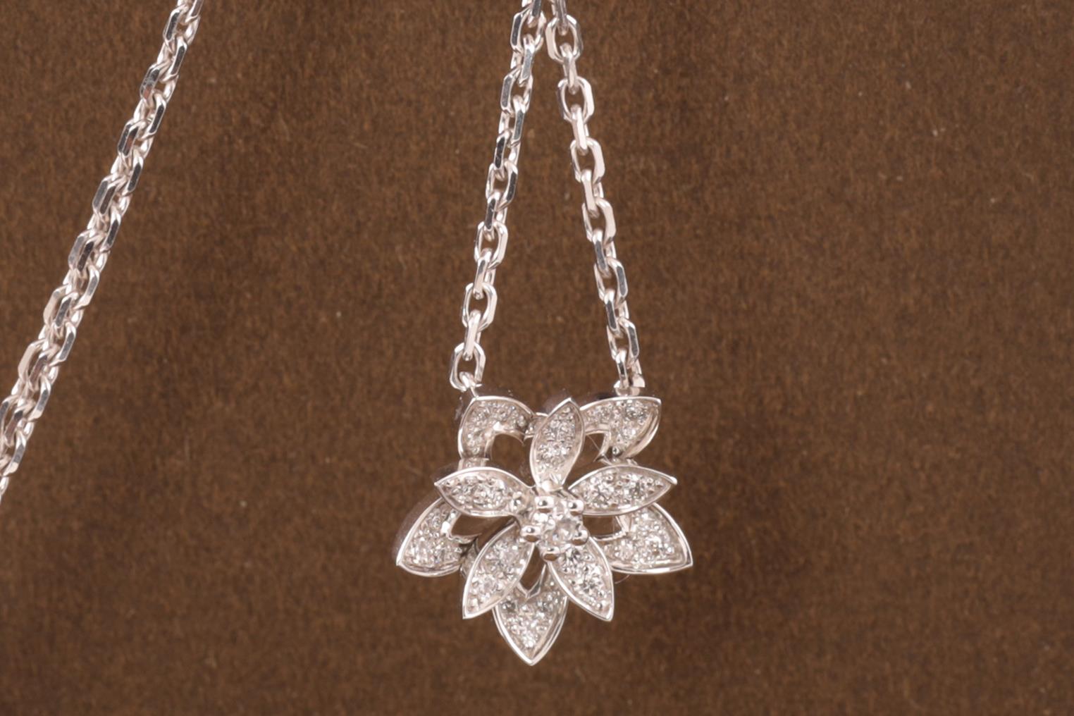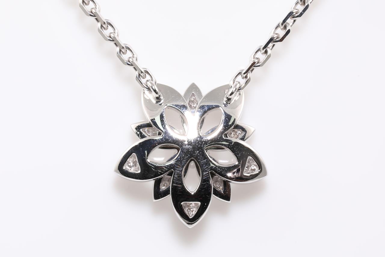 Van Cleef & Arpels Lotus openwork pendant mini model. Ref# VCARP0ZW00. 26 Diamonds totalling 0.16cts. 18ct white gold with attached chain. Adjustable max length: 42cm. With Van Cleef & Arpels box. Weight: 4.9g. With certificate #415003. (Pre-owned)