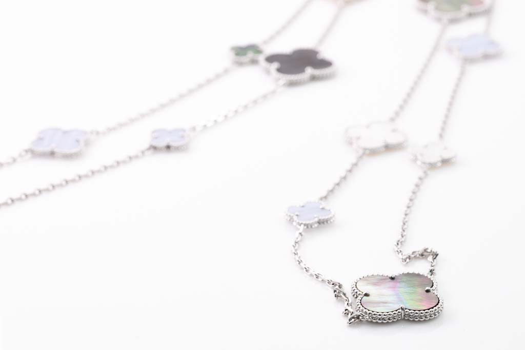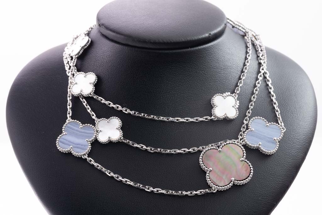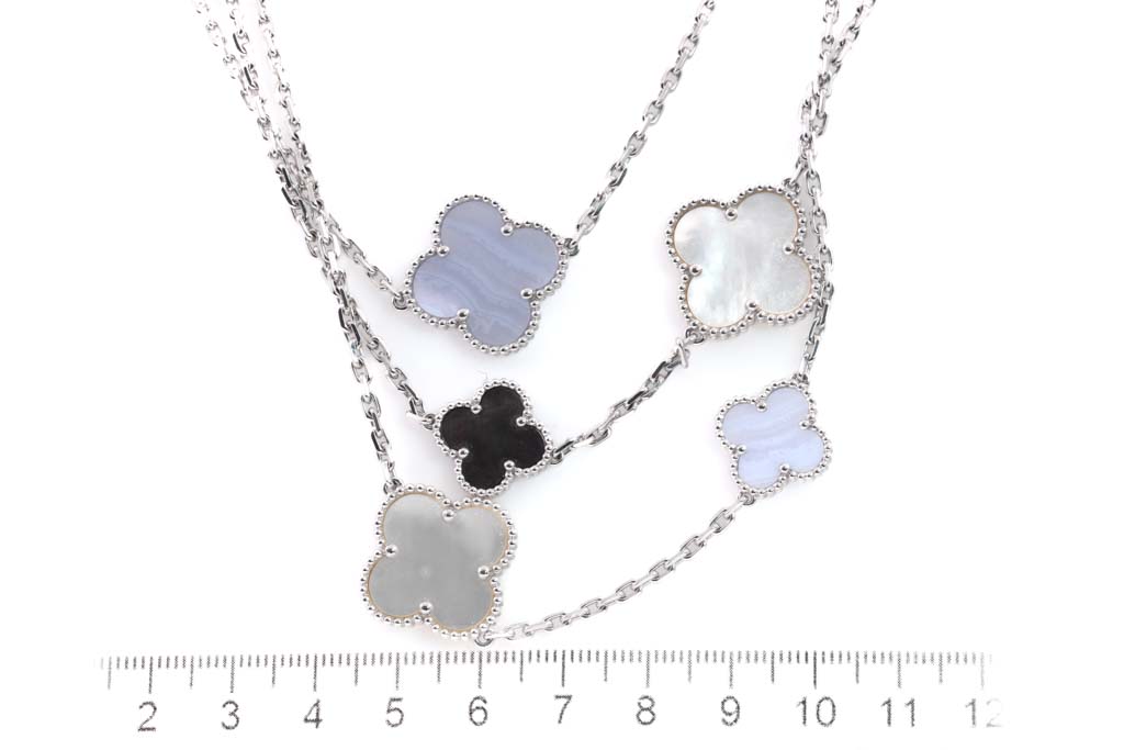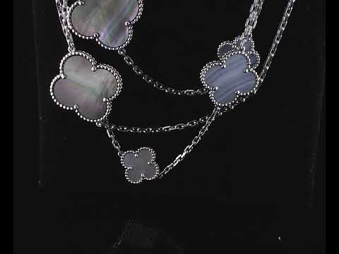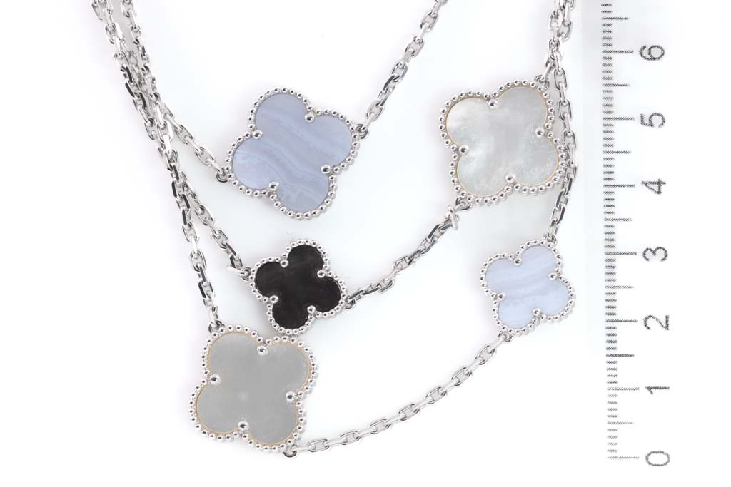 Van Cleef & Arpels Magic Alhambra long necklace 16 motifs with white & grey Mother of Pearl and Chalcedony. 18ct white gold. Length: 120cm. Weight: 71.6g. With Van Cleef & Arpels Certificate of Authenticity & purchase invoice both dated 04/07/2014 and Van Cleef & Arpels box. (Pre-owned)