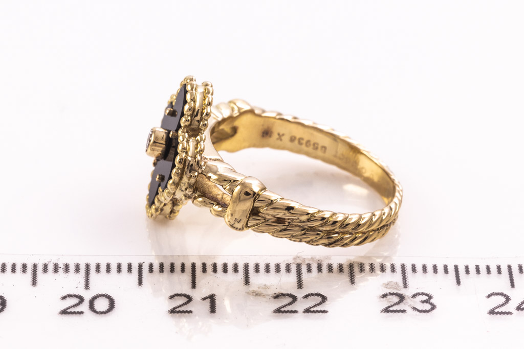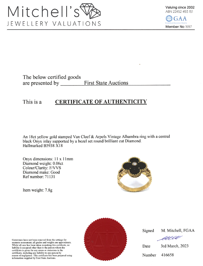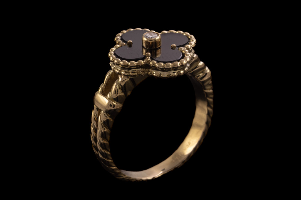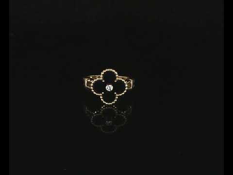 Van Cleef & Arpels Vintage Alhambra ring with Onyx and a round Diamond of 0.06ct. 18ct yellow gold. Ring size P1/2 - ring resizing is not recommended. Weight: 7.8g. With Van Cleef & Arpels box. With Certificate #416658. (Pre-owned)