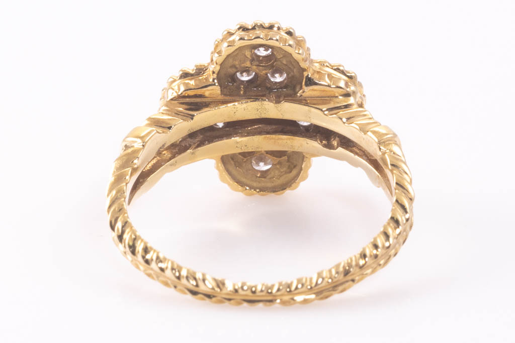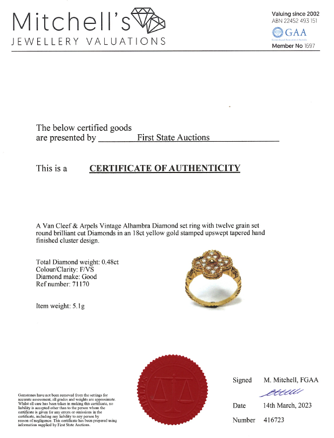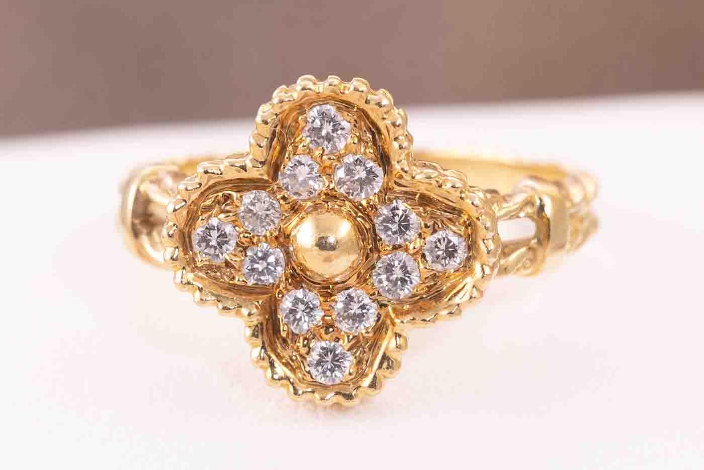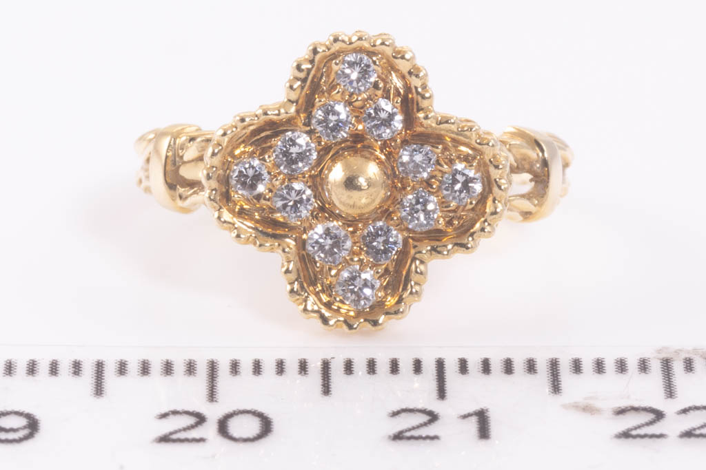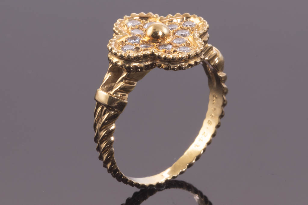 Van Cleef & Arpels Vintage Alhambra Diamond ring with round Diamonds totalling 0.48cts. 18ct yellow gold. Ring size M -ring resizing is not recommended. Weight: 5.1g. With Van Cleef & Arpels box. With Certificate #416723. (Pre-owned)