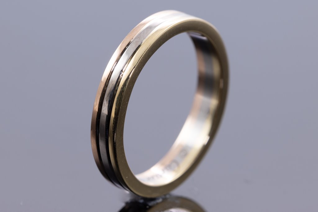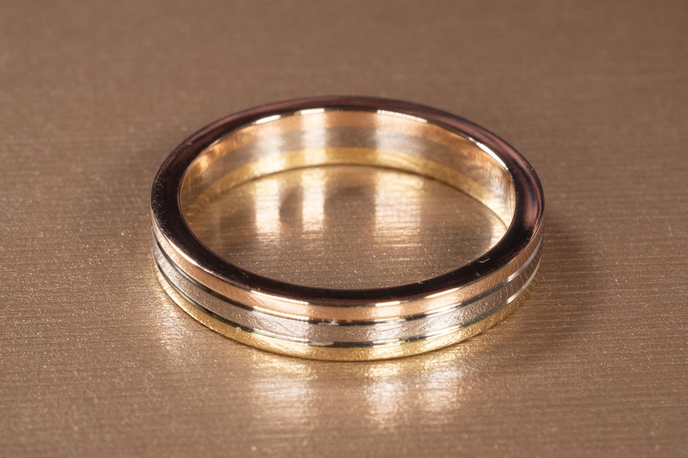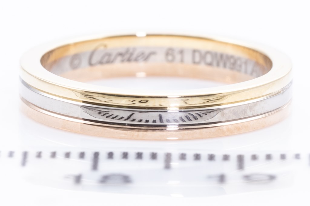 Vendome Louis Cartier Wedding Ring. 18ct yellow, rose and white gold. Width: 3.5 mm. Cartier Stamped size: 61 (actual size L) - ring resizing is not recommended. Weight: 4.7g. (Pre-owned)