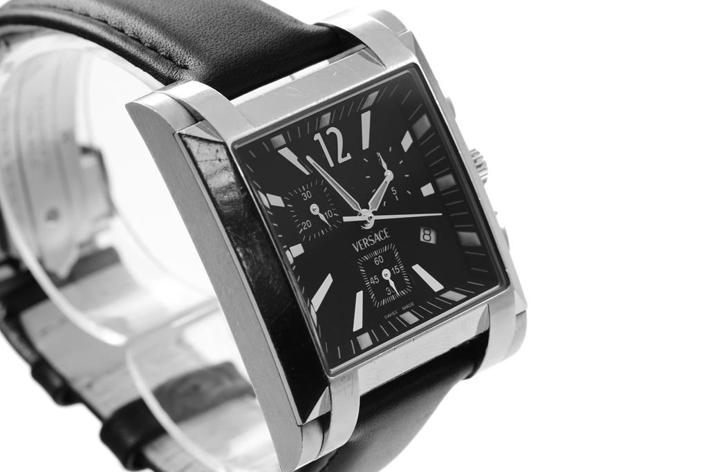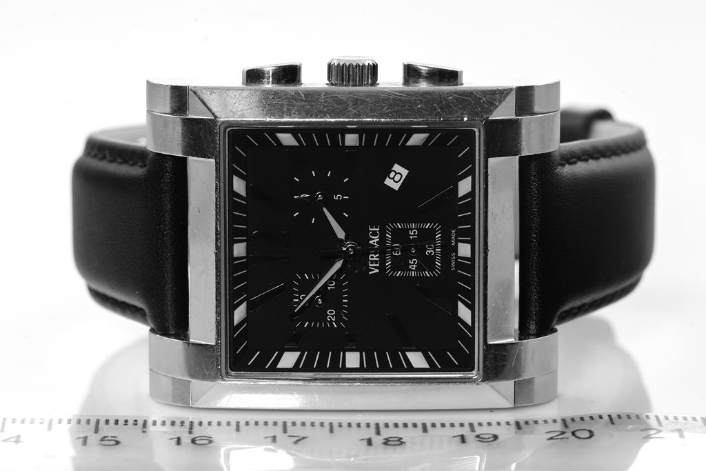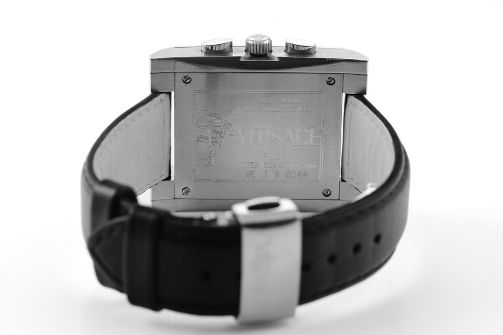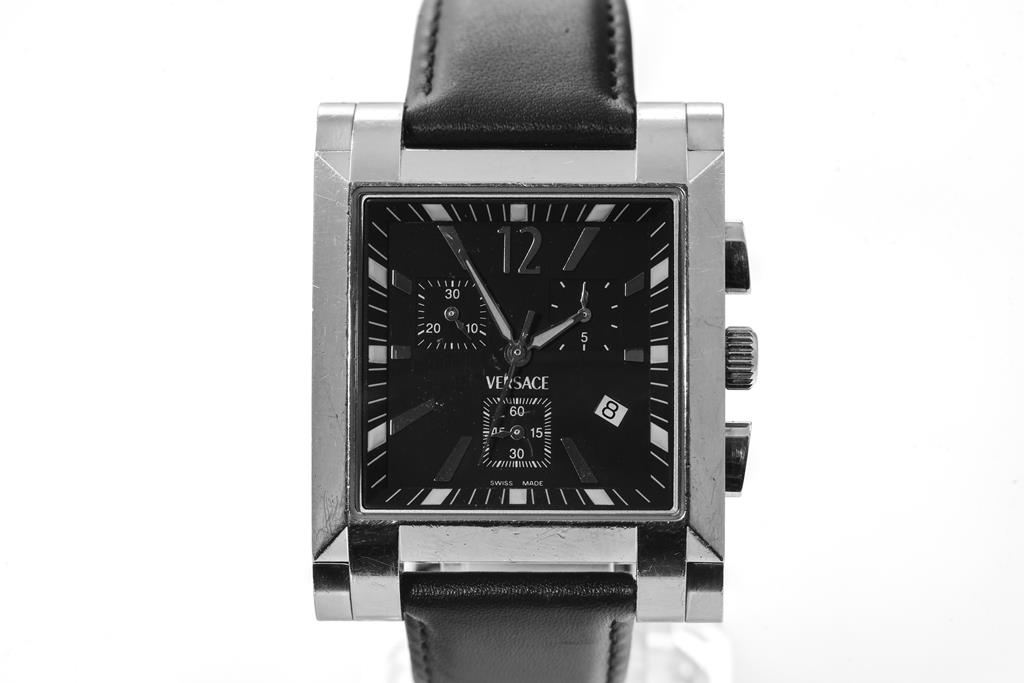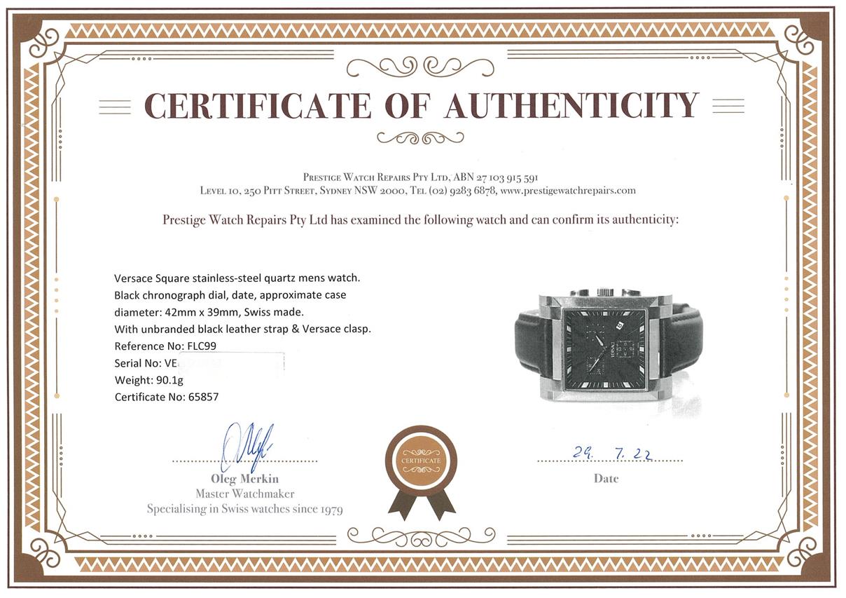 Versace Square stainless steel quartz mens watch. Black chronograph dial, date, approximate case diameter: 42mm x 39mm, wrist size: 17.5cm, Swiss made. Ref# FLC99. With unbranded black leather strap and Versace clasp. With Certificate of Authenticity. 3 month FSA warranty. (Pre-owned)