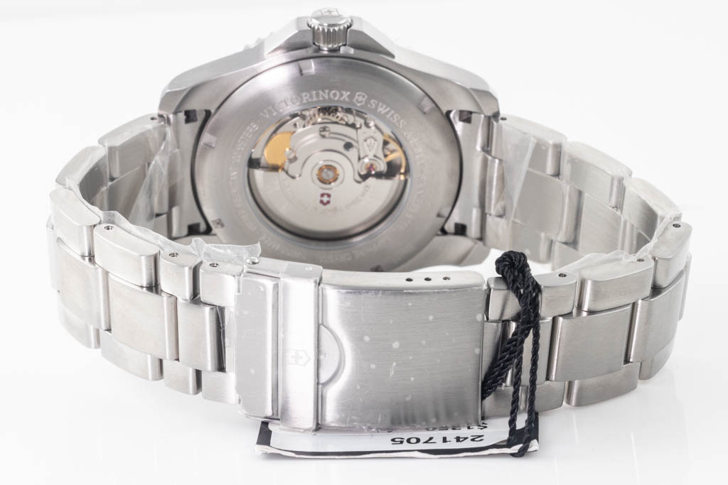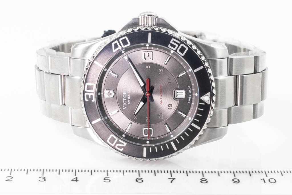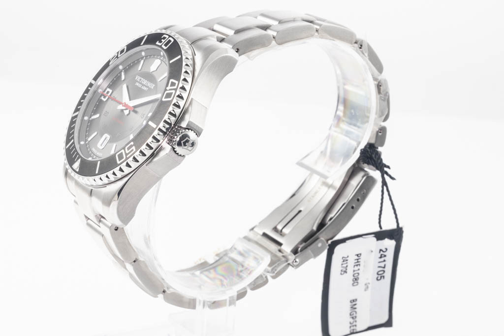 Victorinox Maverick Swiss stainless steel automatic mens watch. Grey dial, date, case diameter: 43mm, wrist size: 20cm, Swiss made. Ref# 241705. With Victorinox stainless steel bracelet and clasp. With Victorinox 5-Year International Warranty card and Victorinox box. (As New, Note: minor scratches on case and bracelet due to being display stock)