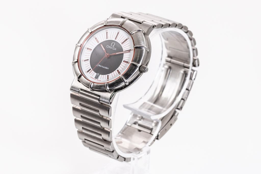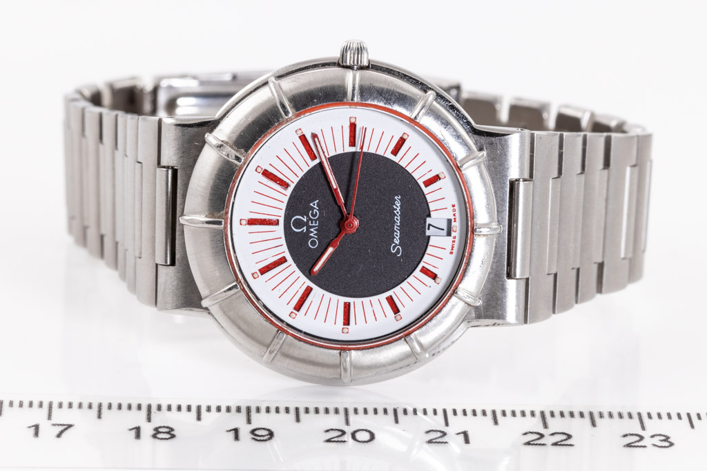Vintage Omega Seamaster Dynamic ll stainless steel quartz watch. Black/white dial, date, approximate case diameter: 33mm, wrist size: 16.5cm, Swiss made. Ref# 1960301, Circa: 1984. With Omega stainless steel bracelet and clasp. With Certificate of Authenticity. 3 month FSA warranty (Pre-owned)