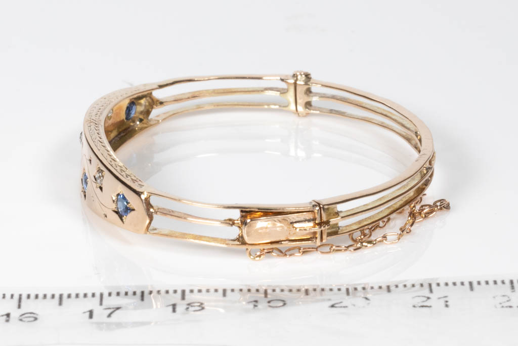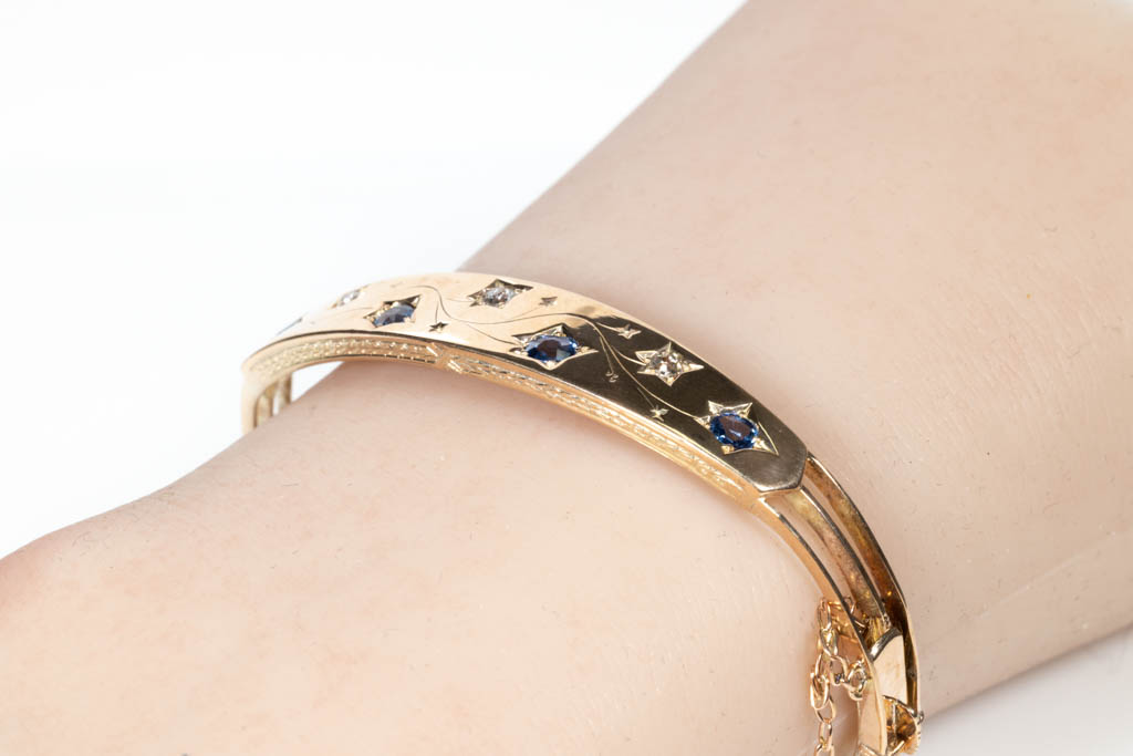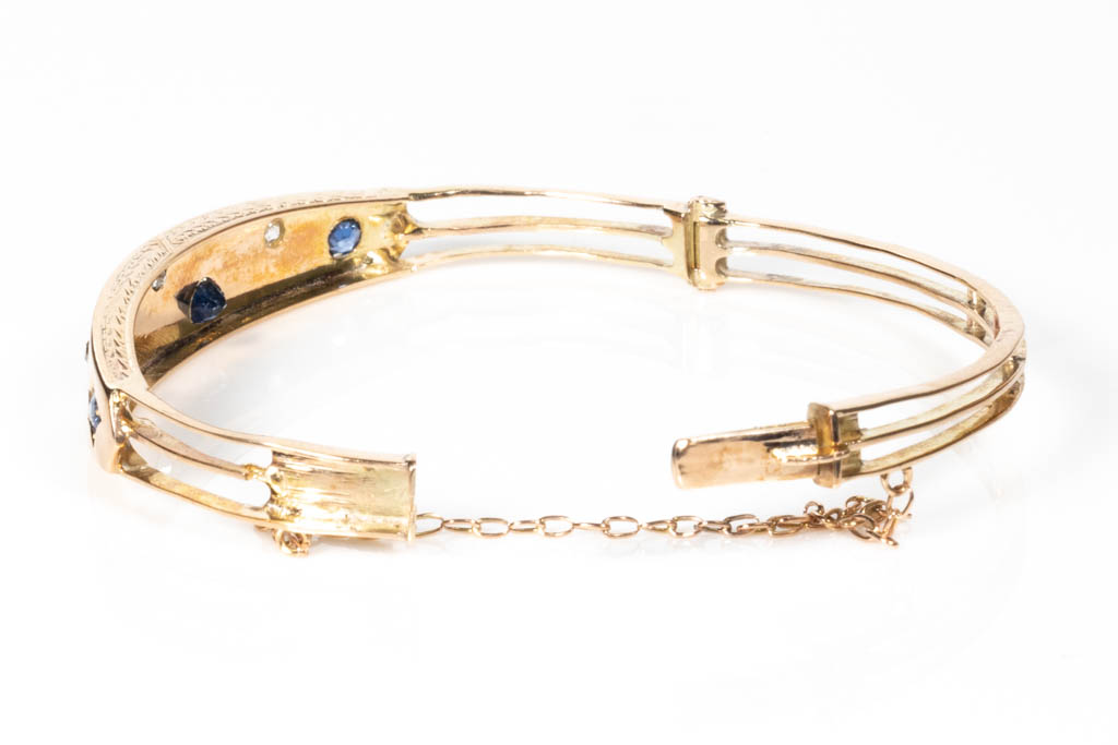 Vintage Bracelet with oval cut light blue Sapphires totalling approximately 0.64cts and round Diamonds totalling approximately 0.15cts (one diamond chipped). 9ct rose gold with safety chain. Circumference 14cm. Weight 9.2g. Few dents. (Pre-owned)