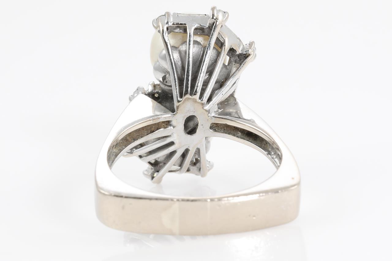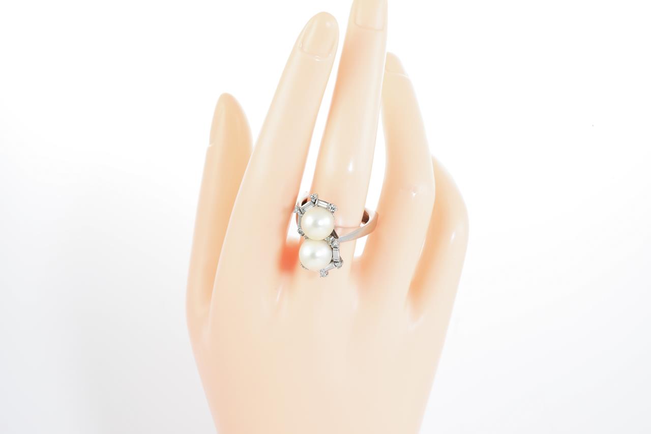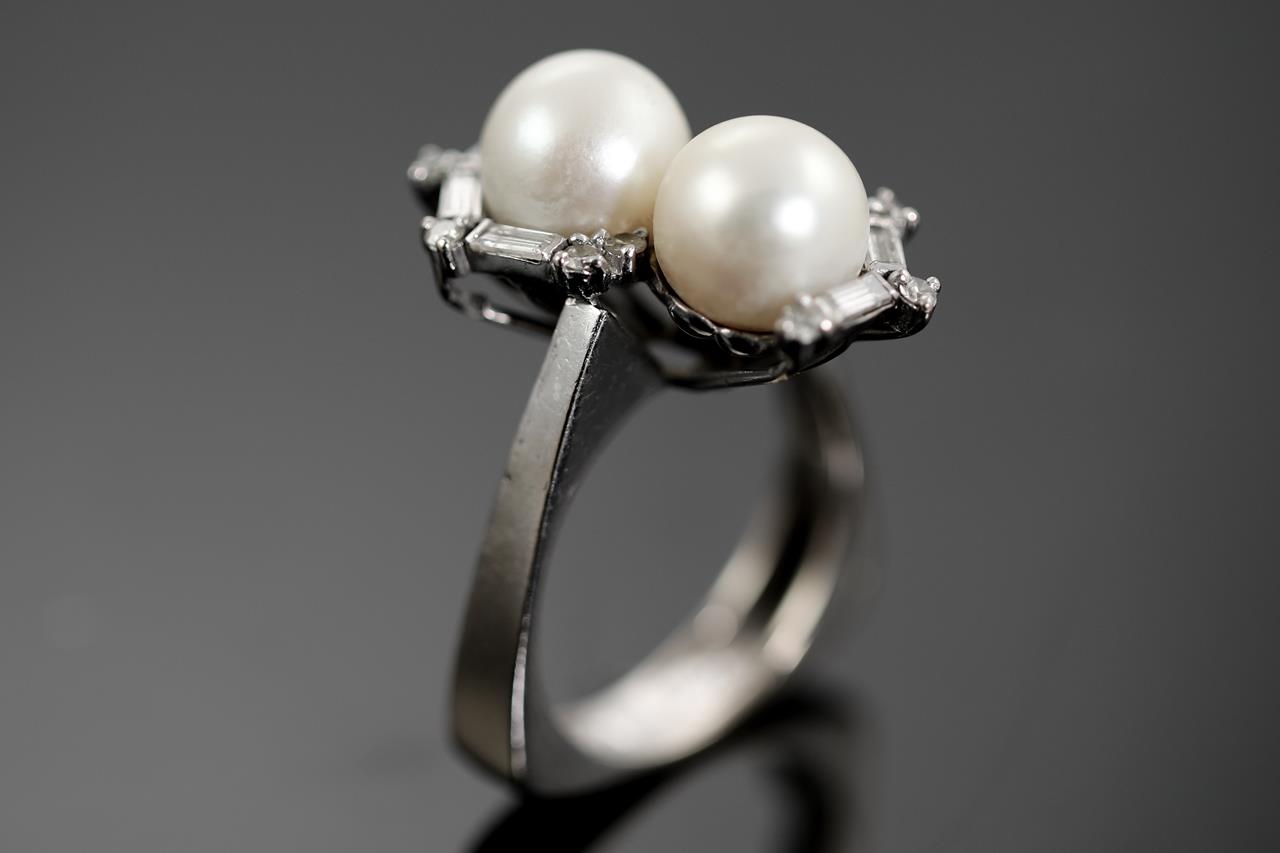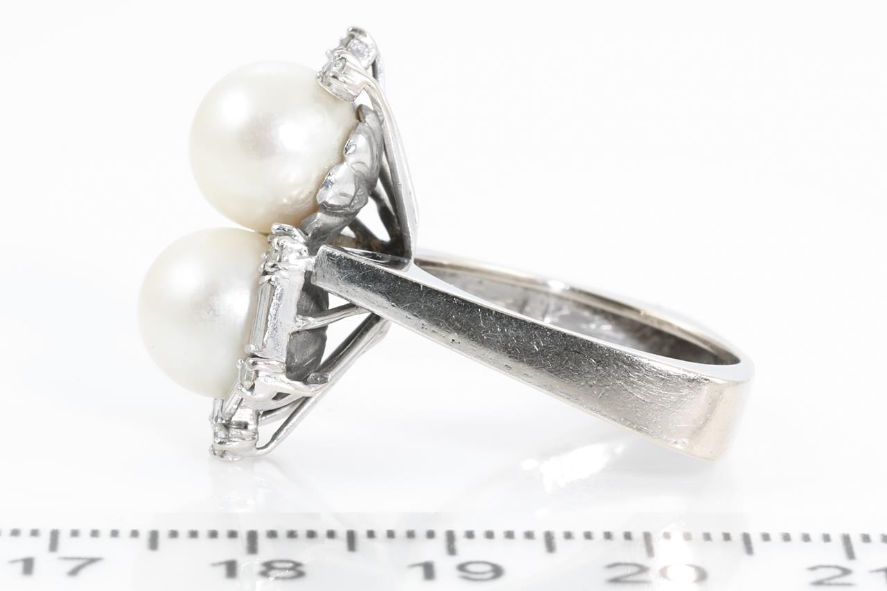 Vintage Pearl and Diamond Ring with round 9mm Cultured Pearls and 16 Diamonds (baguette cut and round) totalling approximately 0.58cts (Estimated grading: H-I SI, J-K SI-P1). 9ct white gold, rhodium plating worn - acid tested, not stamped. Ring size P1/2. Weight 10.8g. (Pre-owned)