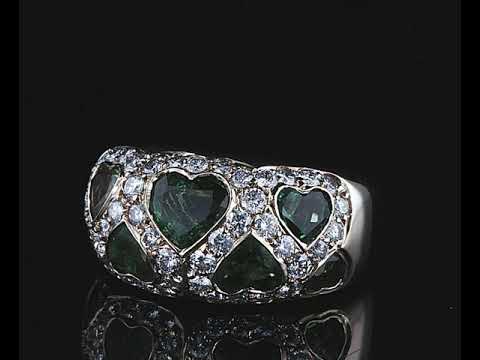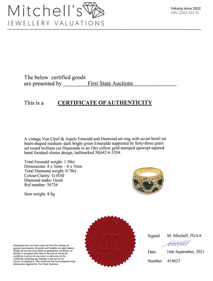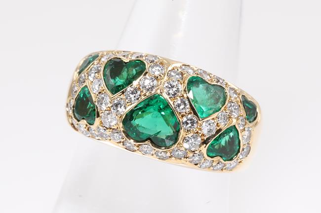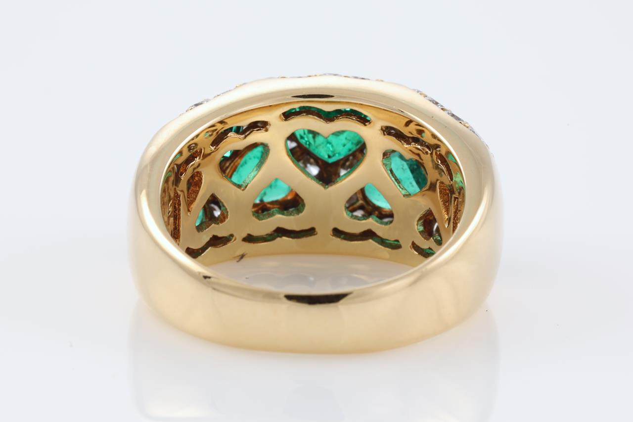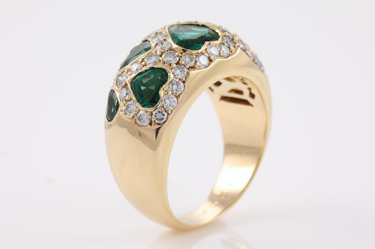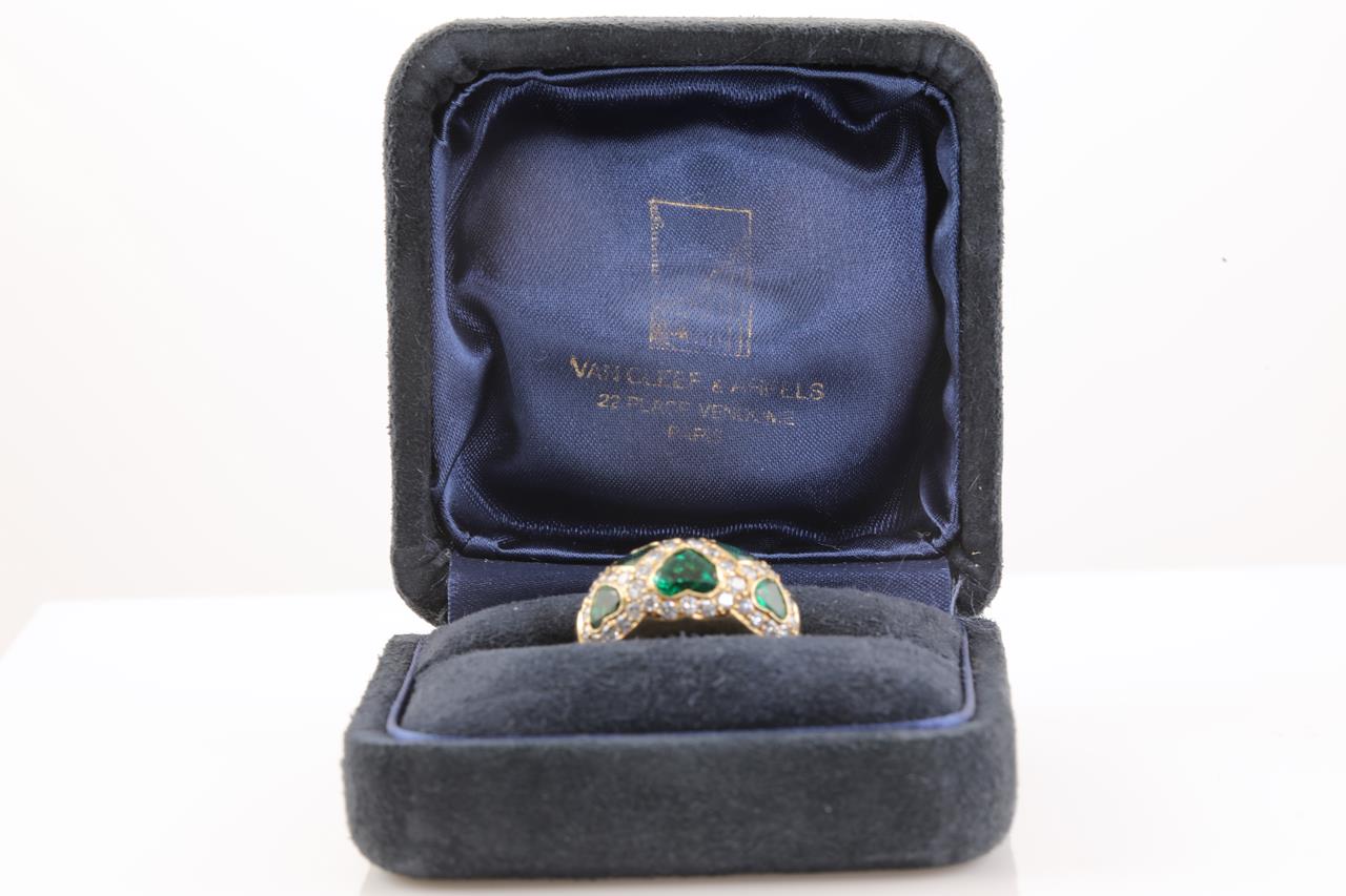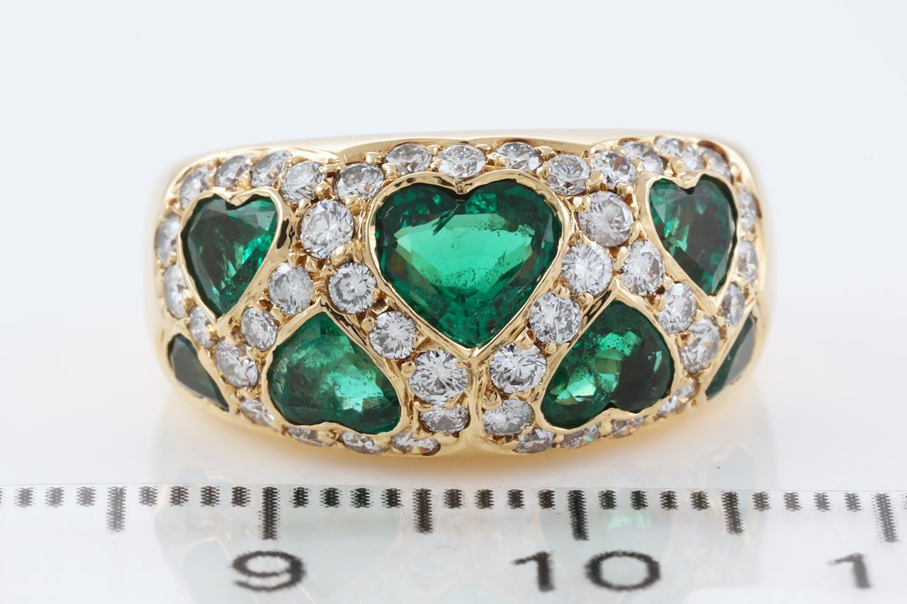 Vintage Van Cleef & Arpels ring with heart shape Emeralds totalling approximately 1.50cts and Diamonds totalling approximately 0.70cts (Estimated grading: G-H SI). 18ct yellow gold. Ring size L1/2 - ring resizing is not recommended. Weight: 8.8g. With Van Cleef & Arpels box. With certificate #414623. (Pre-owned)