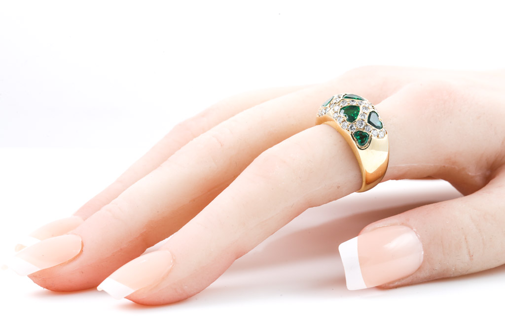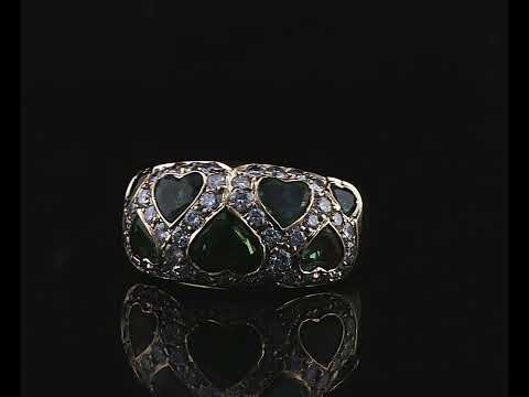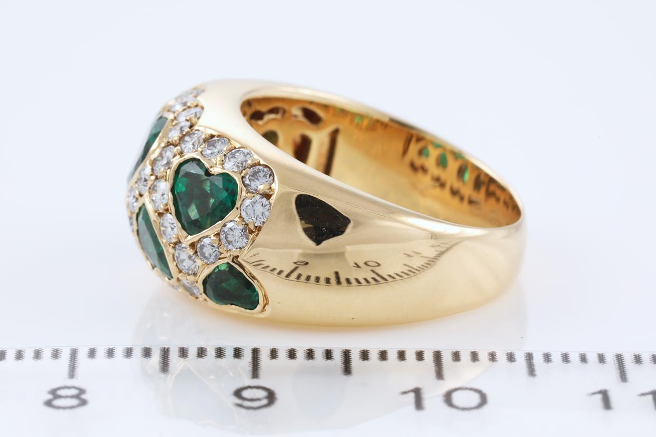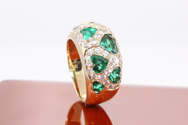 Vintage Van Cleef & Arpels ring with heart shape Emeralds totalling approximately 1.50cts and round cut Diamonds totalling approximately 1.00cts (Estimated grading: G-H SI). 18ct yellow gold. Ring size L1/2 - ring resizing is not recommended. Weight: 8.8g. With Van Cleef & Arpels box. With certificate #416461. (Pre-owned)