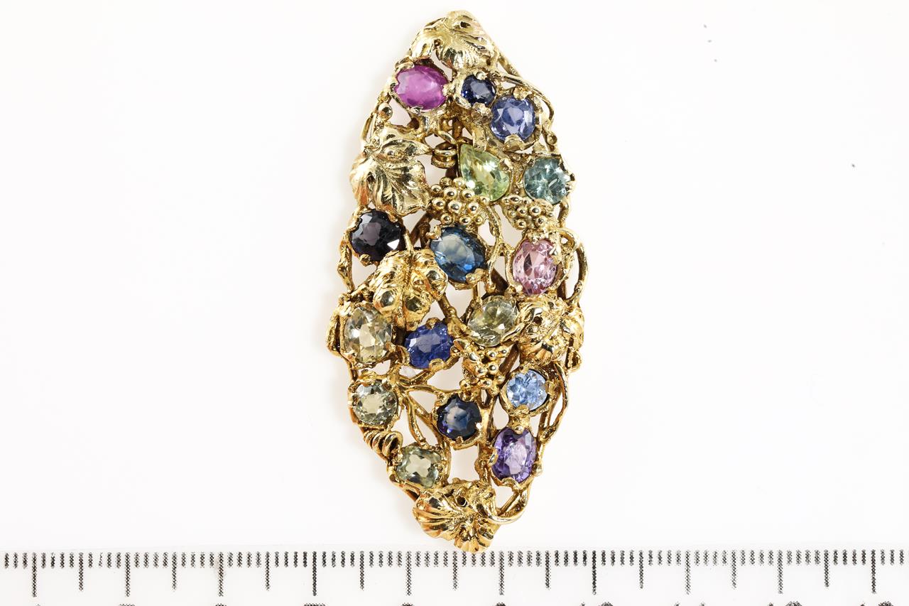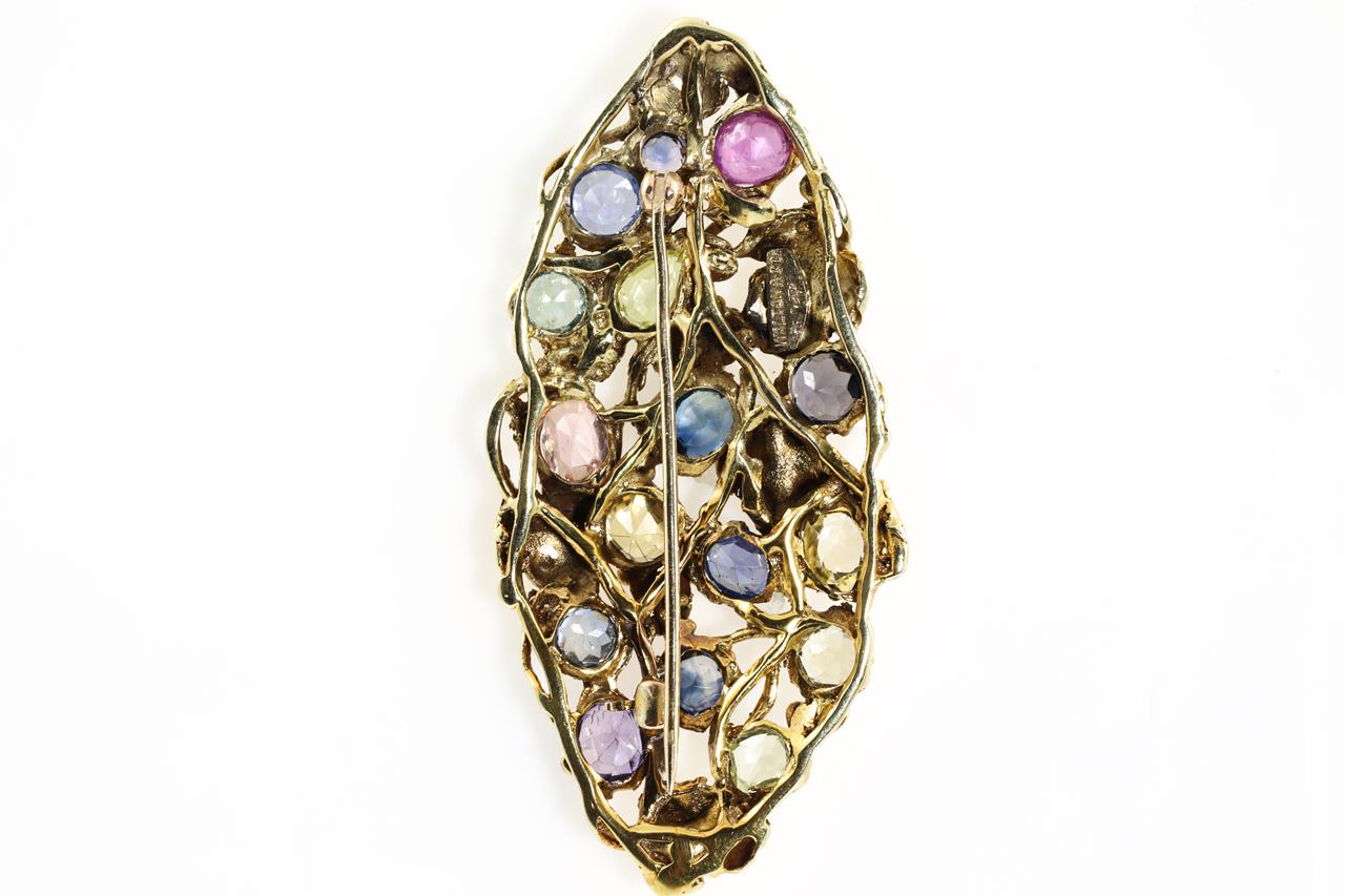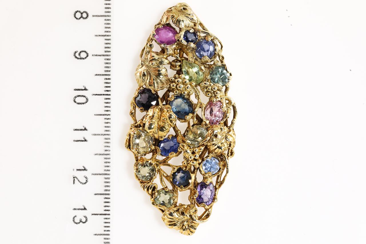 Vintage Walton & Co brooch with mixed shape multi colour sapphires totalling approximately 11.00cts (note minor surface wear). 14ct yellow gold. Weight: 15.2g. (Pre-owned)