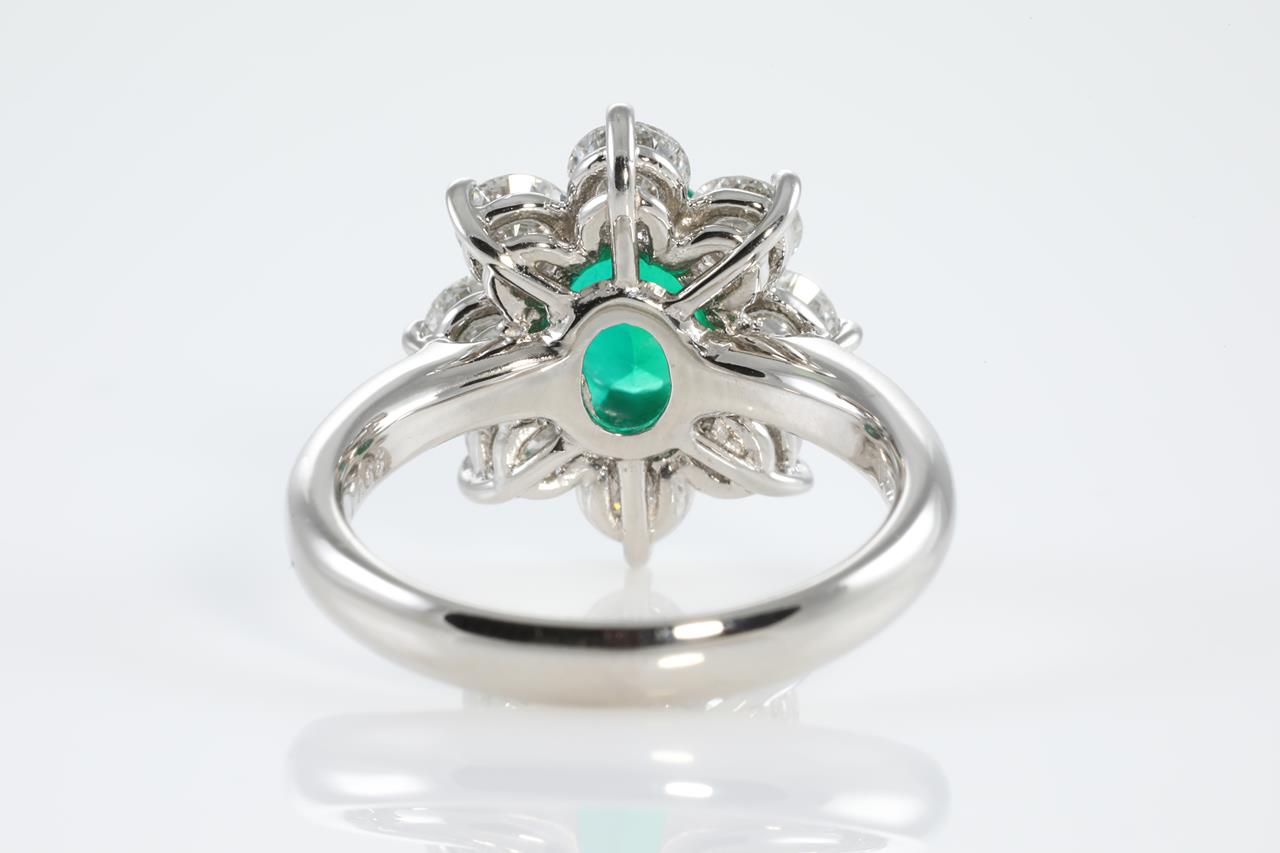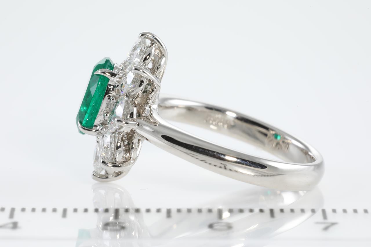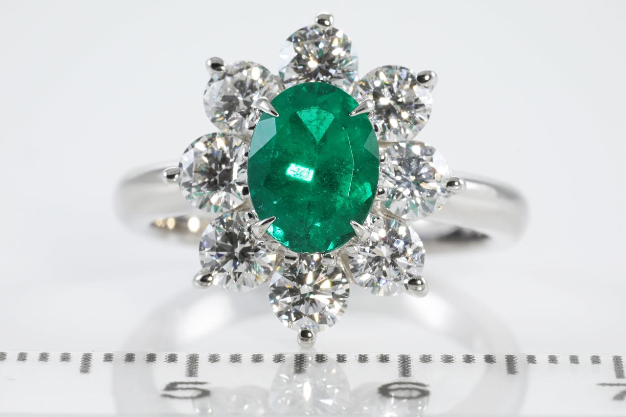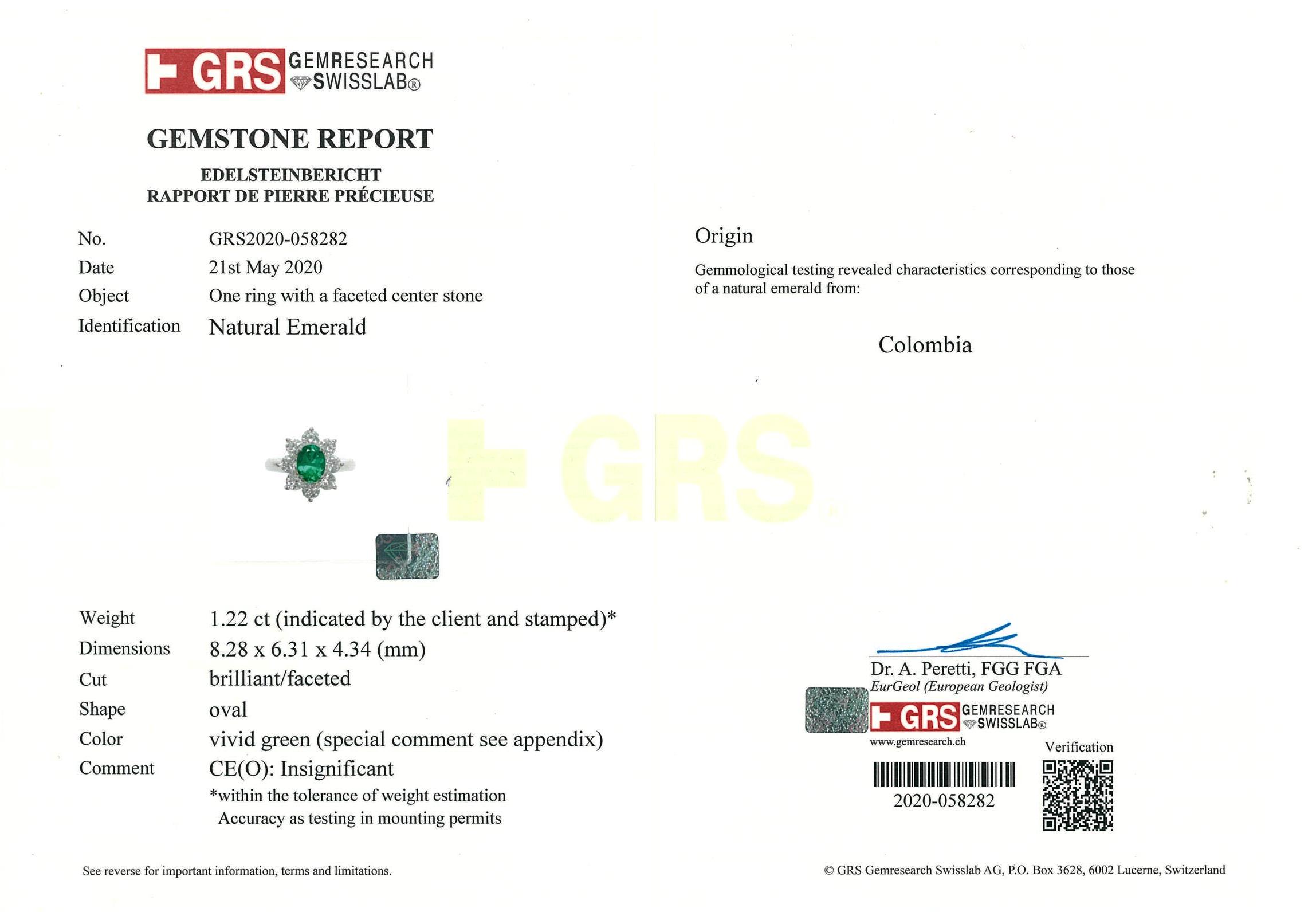 Emerald and Diamond ring with oval shape vivid green Colombian Emerald of 1.22ct (with GIA report #7346433552 & GRS Report #GRS2020-058282) and Diamonds totalling 1.65cts (Estimated grading: G SI1). Platinum. Ring size M. Weight: 9.0g (Pre-owned)