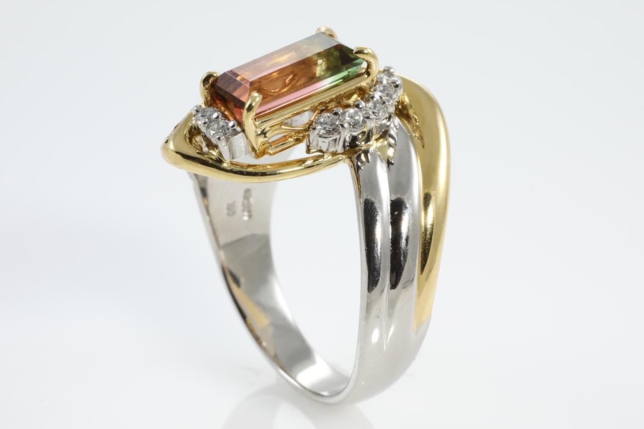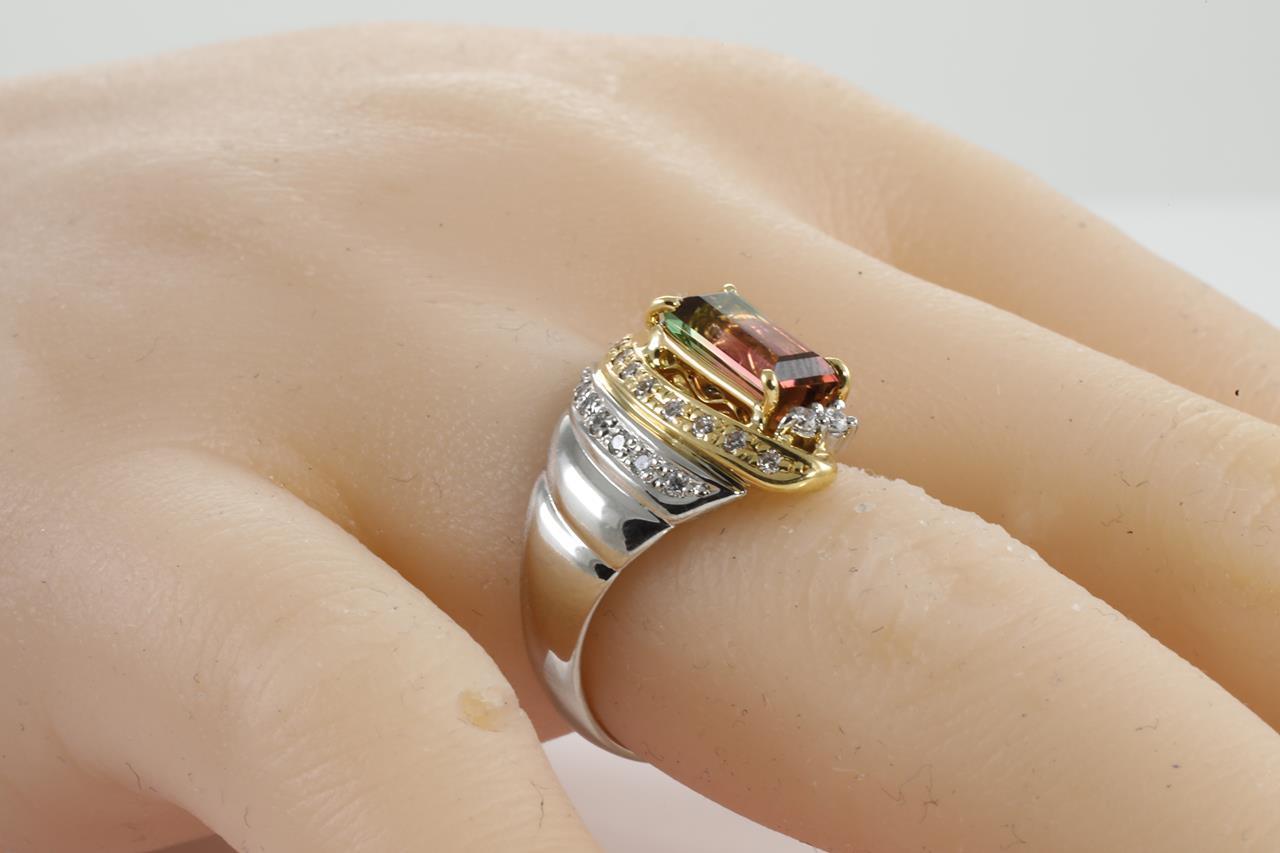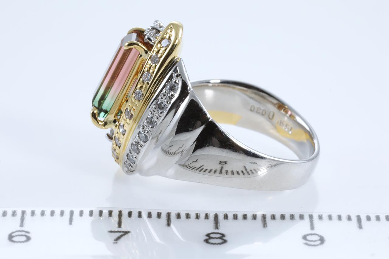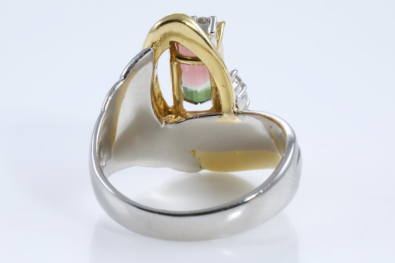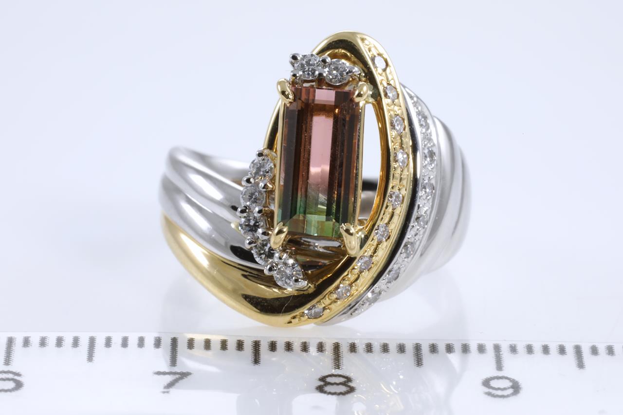 Tourmaline and Diamond ring with emerald cut Watermelon Tourmaline of 1.56ct and round Diamonds totalling 0.30cts (Estimated grading: H SI). Platinum and 18ct yellow gold. Ring size N. Weight: 12.3g (Pre-owned)