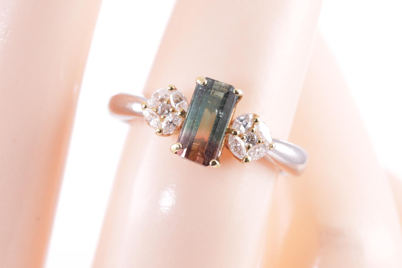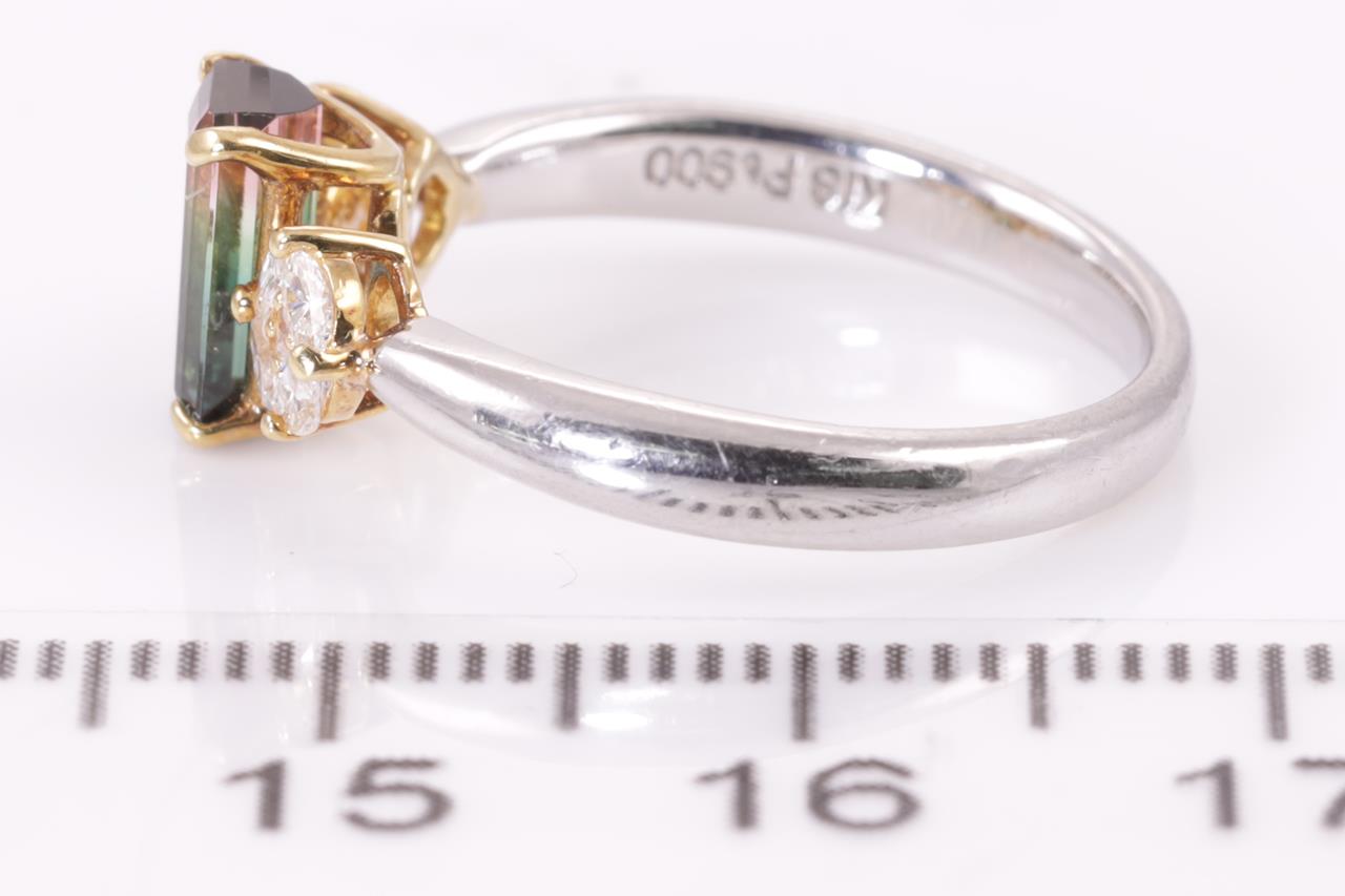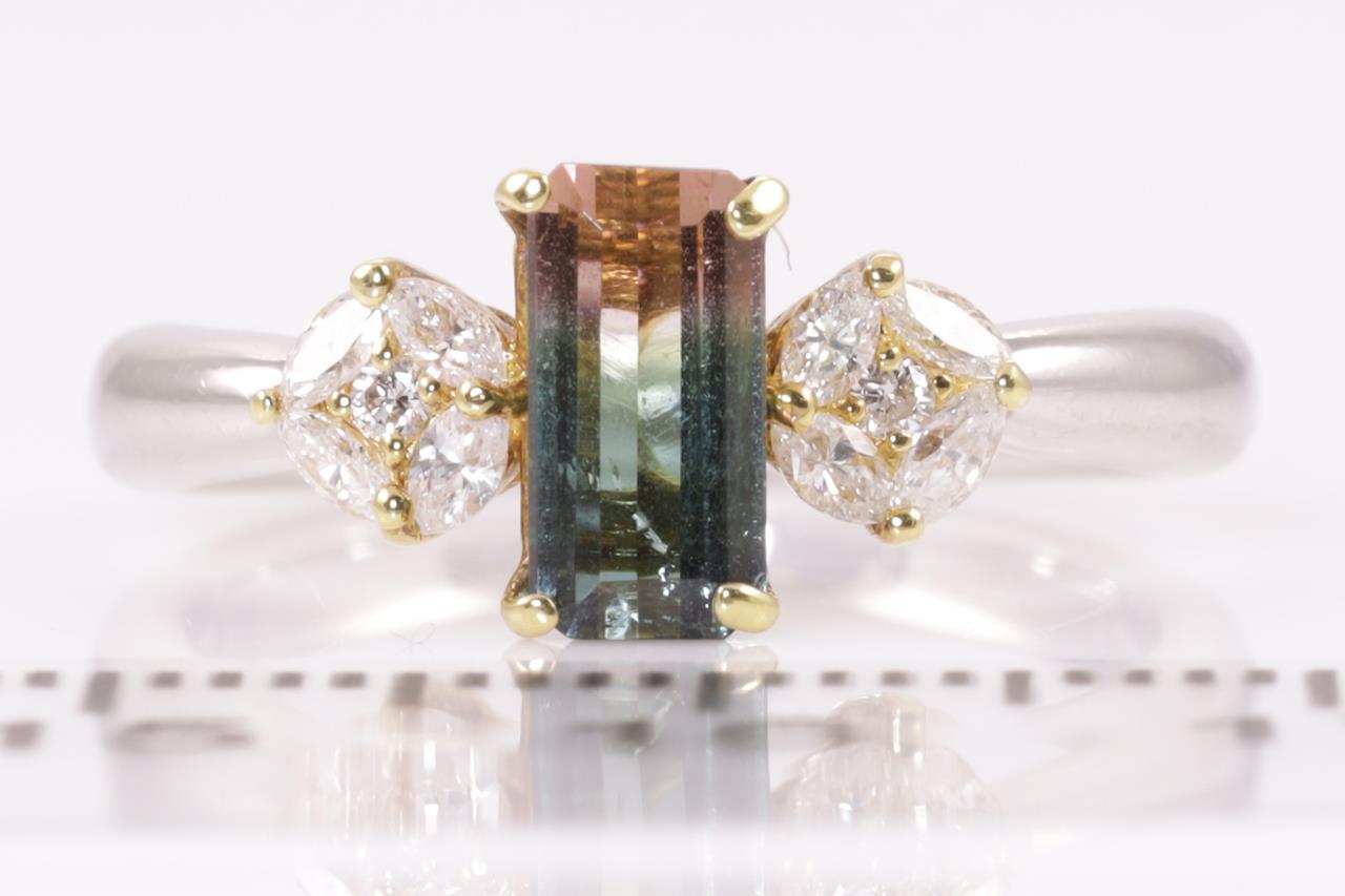 Tourmaline and Diamond Ring with emerald cut Watermelon Tourmaline of 0.89ct and Diamonds totalling 0.23cts. 18ct yellow gold and platinum. Ring size L - ring resizing is not recommended. Weight: 4.5g (Pre-owned)