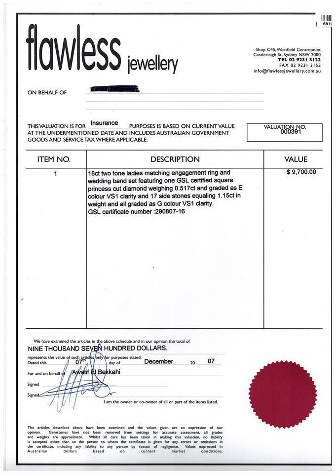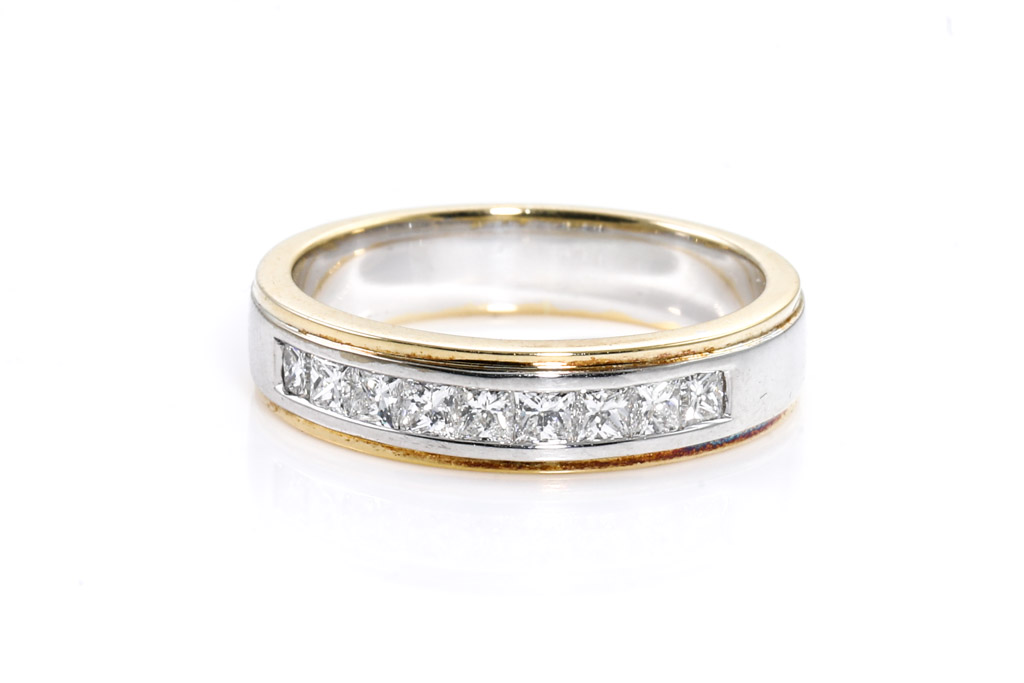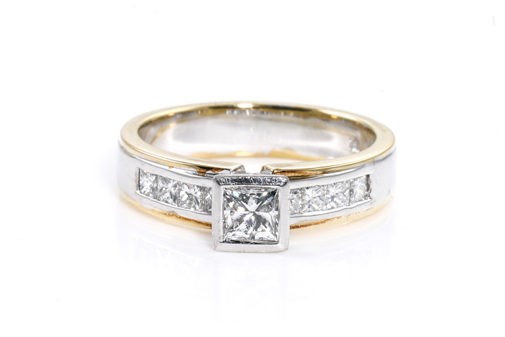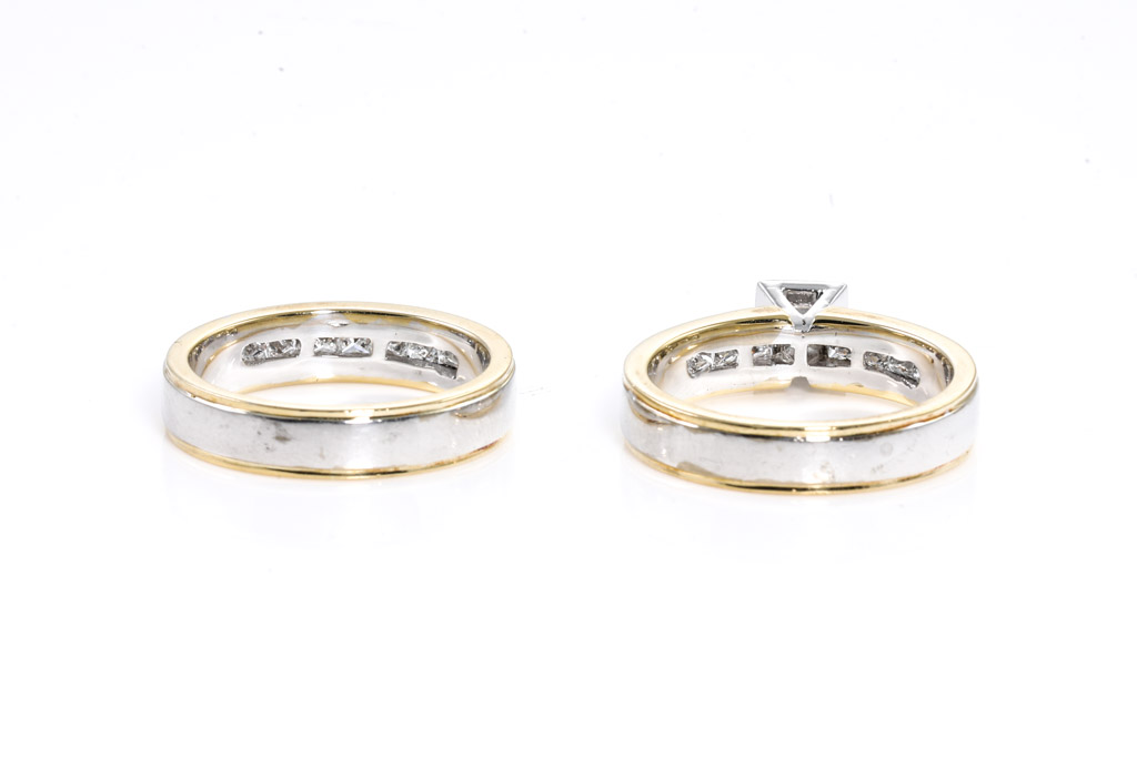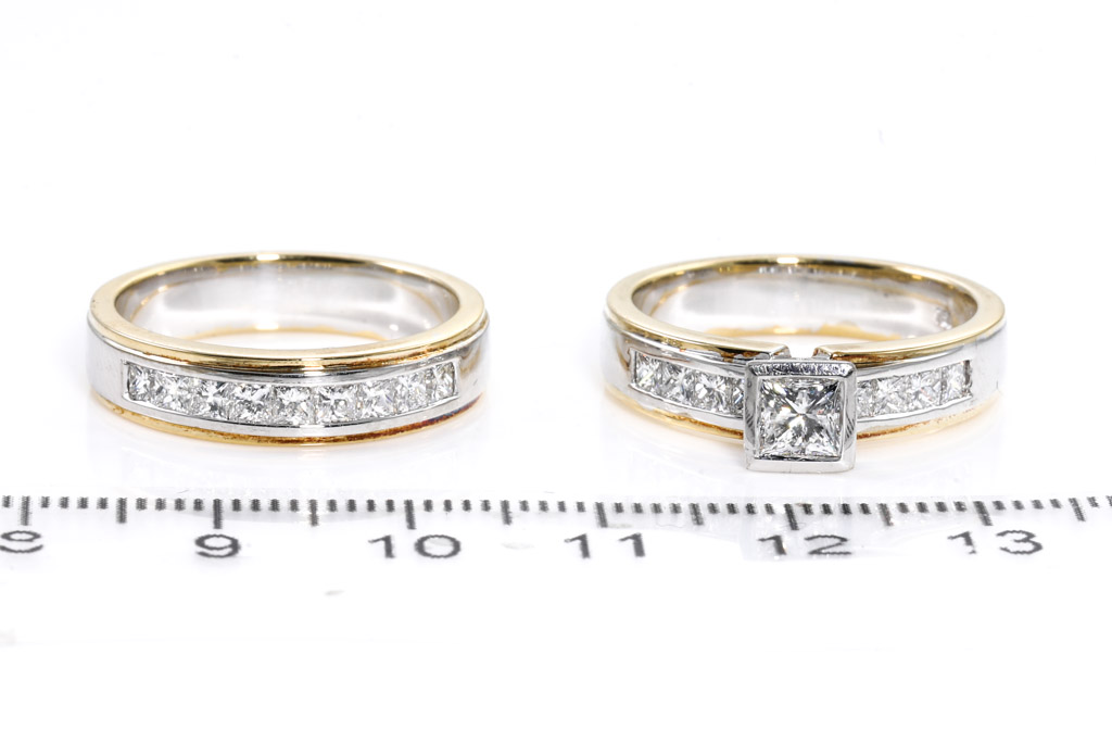 A wedding set comprising an engagement ring with centred princess cut Diamond of 0.51ct (with GSL graded as E VS1 #AA41177/2) and shoulder princess cut Diamonds totalling approximately 0.54cts (Estimated grading G VS1), 18ct yellow and white gold. And an eternity ring with princess cut Diamonds totalling approximately 0.61cts (Estimated grading G VS1). 18ct yellow and white gold. Ring sizes O. Weight 16.2g. With Valuation. (Pre-owned)