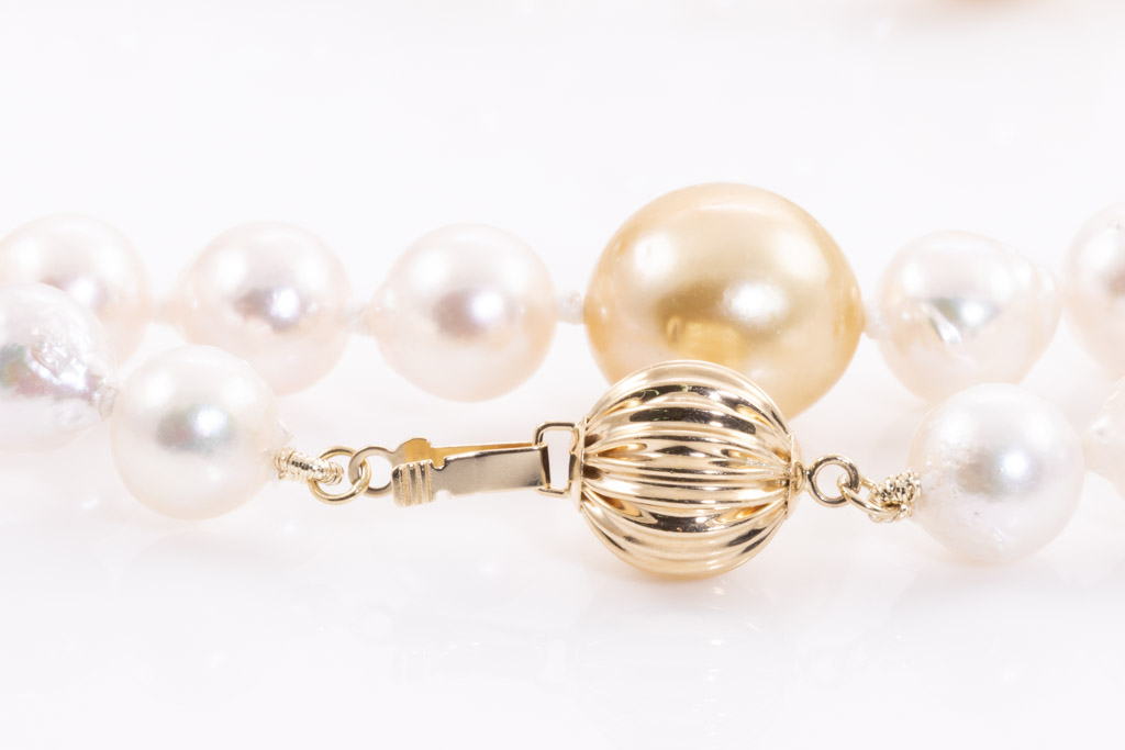 Pearl necklace with 58 slightly baroque South Sea Pearl of 8.6mm-8.0mm and 7 oval & drop shape Golden South Sea Pearls of 11.9mm-10.3mm. 14ct yellow gold ball clasp. Length: 68cm. Weight: 62.1g. (Pre-owned)