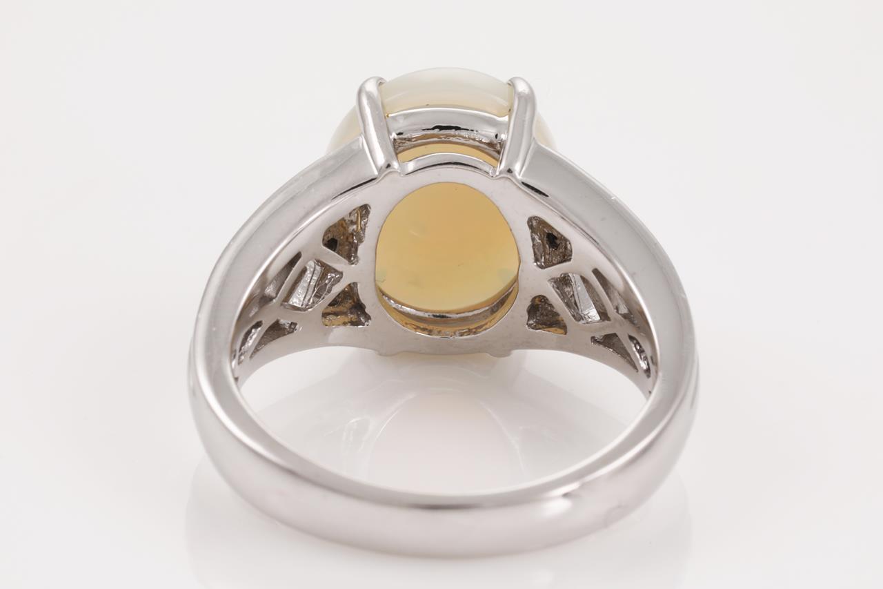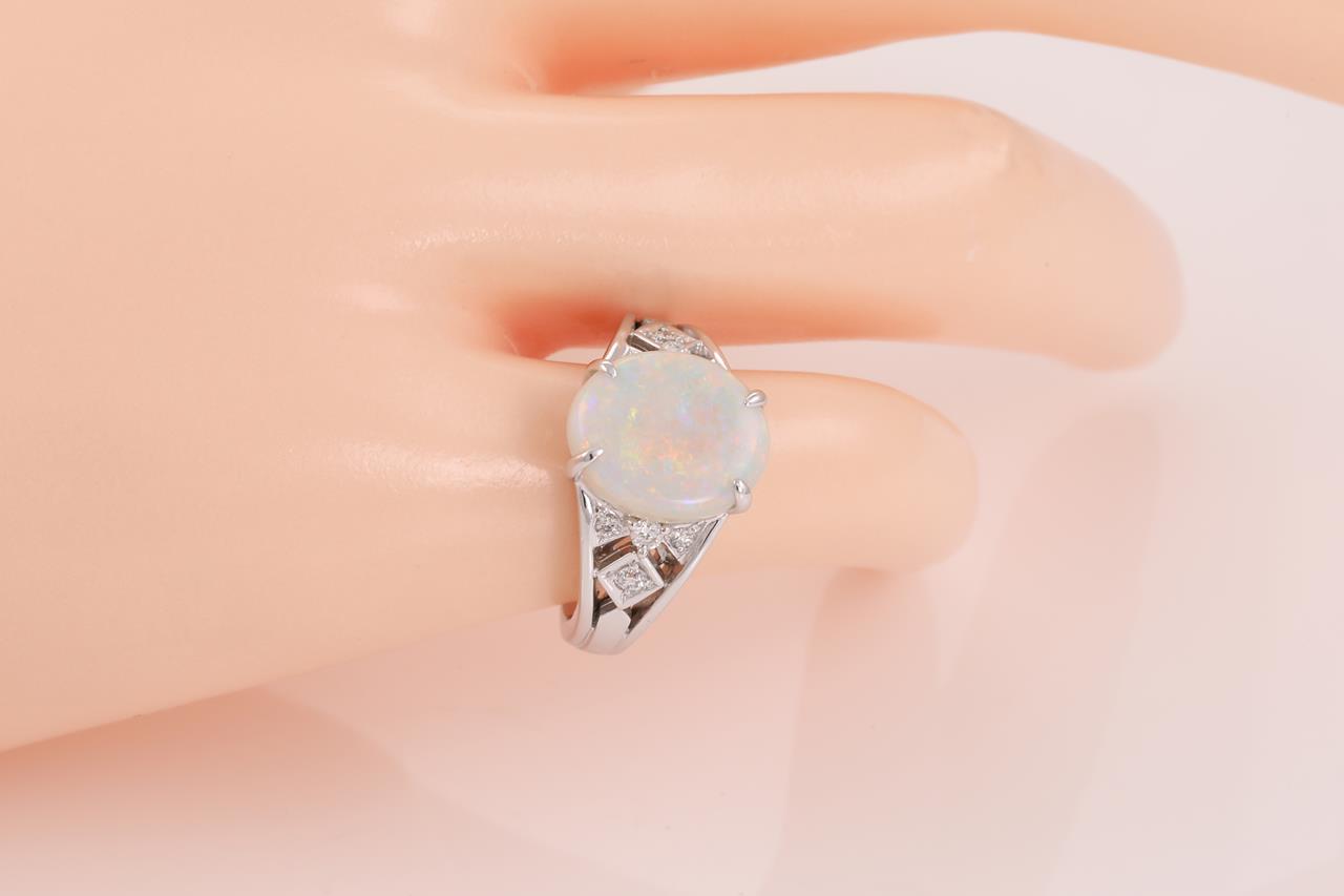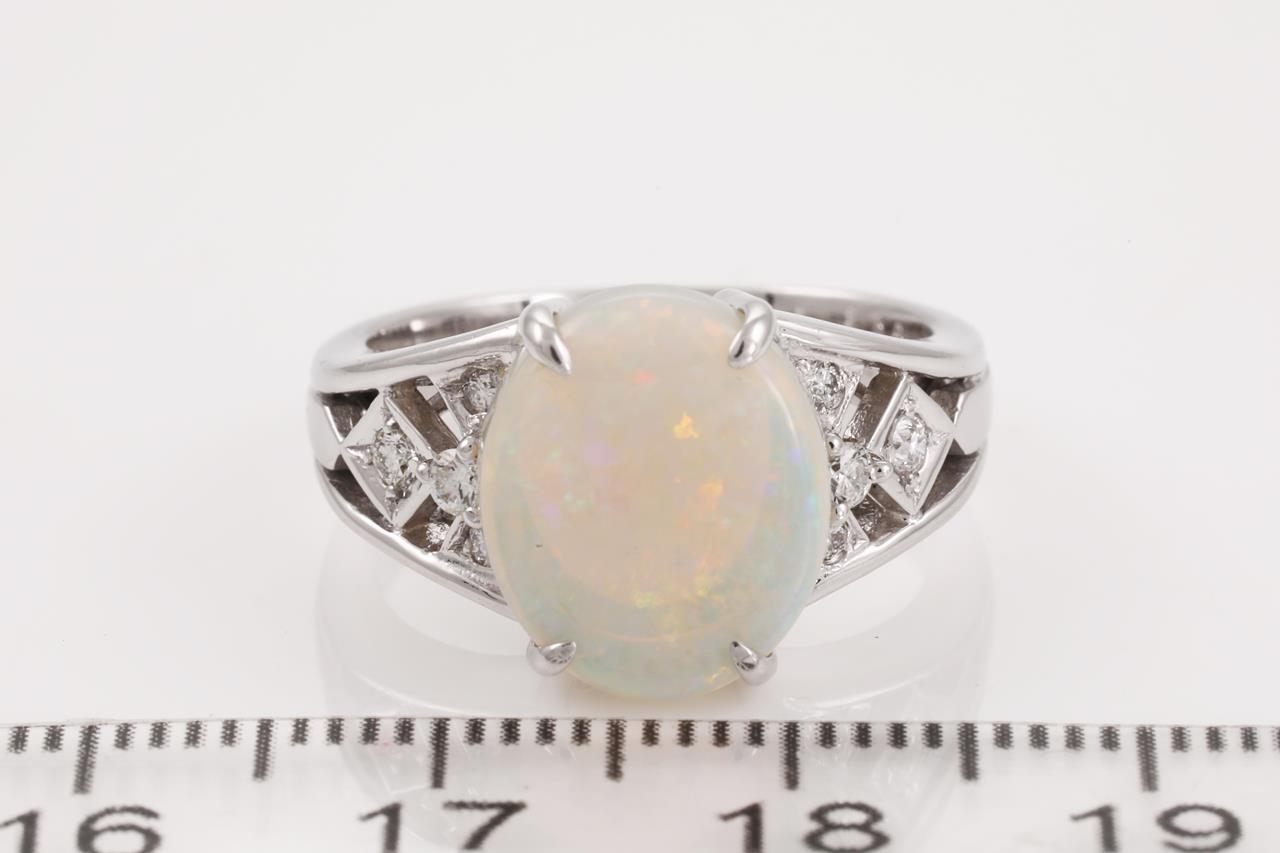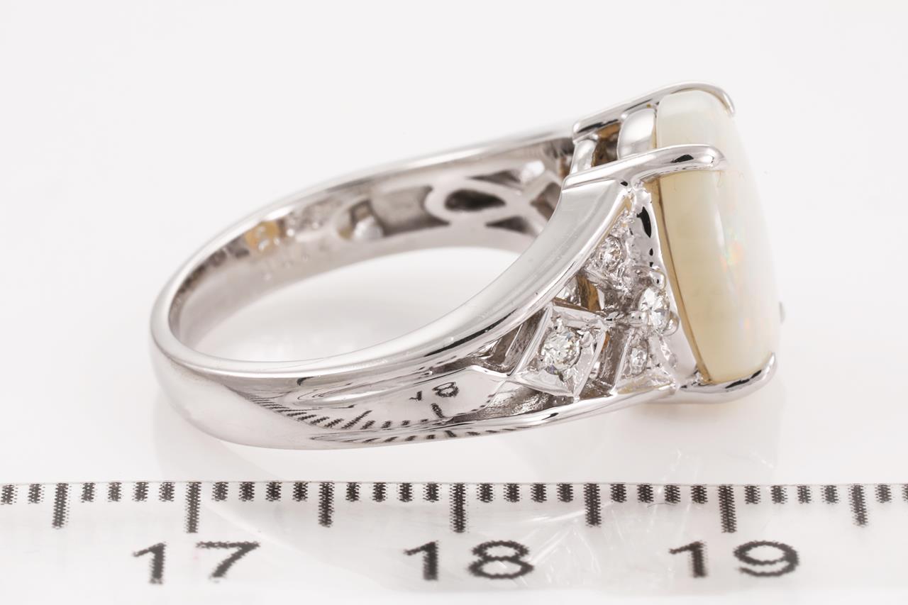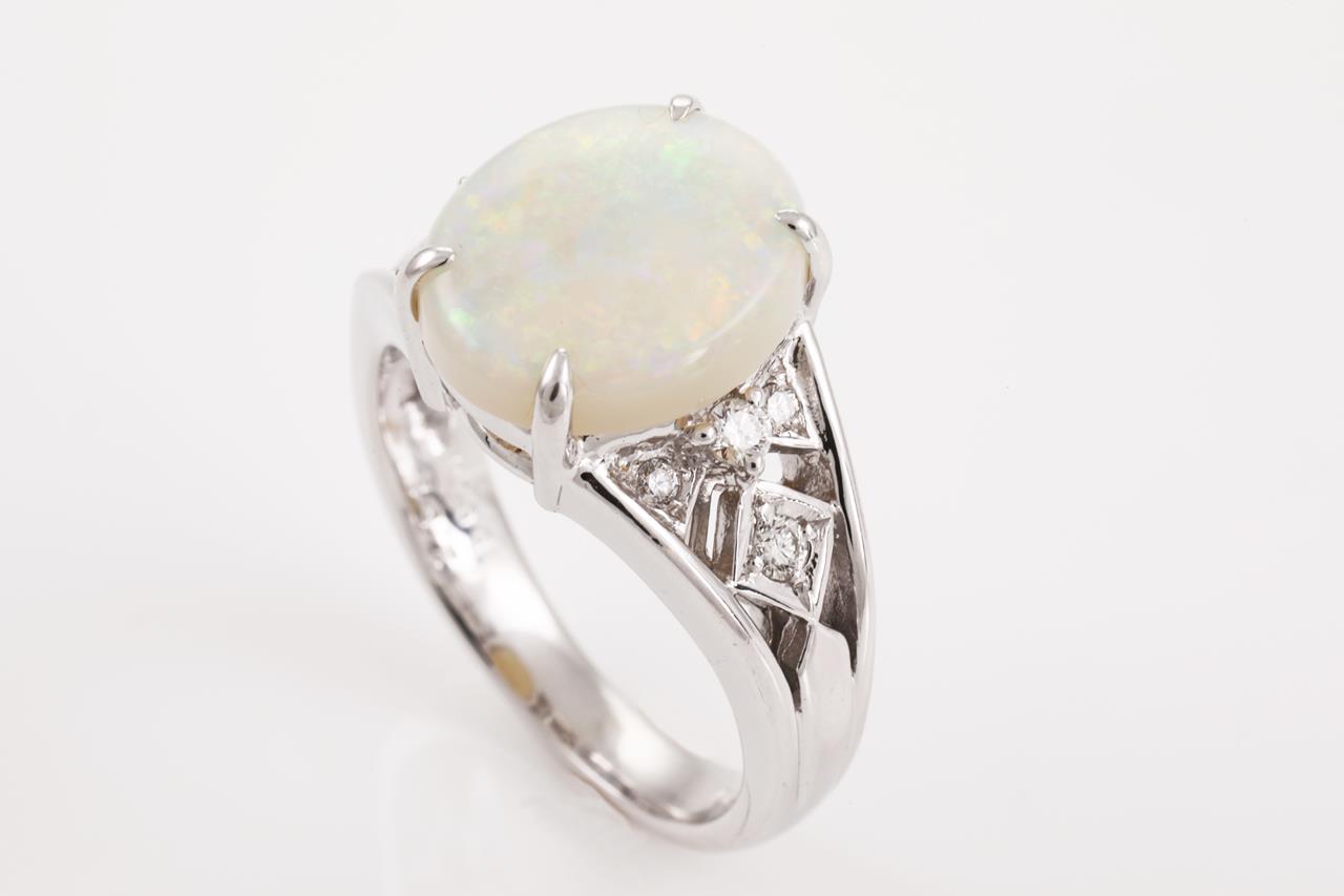 Opal and Diamond ring with an oval cabochon cut white Opal of 2.68ct and Diamonds totalling 0.14cts. 18ct white gold. Ring size: L - ring resizing is not recommended. Weight: 6.7g. (Pre-owned)