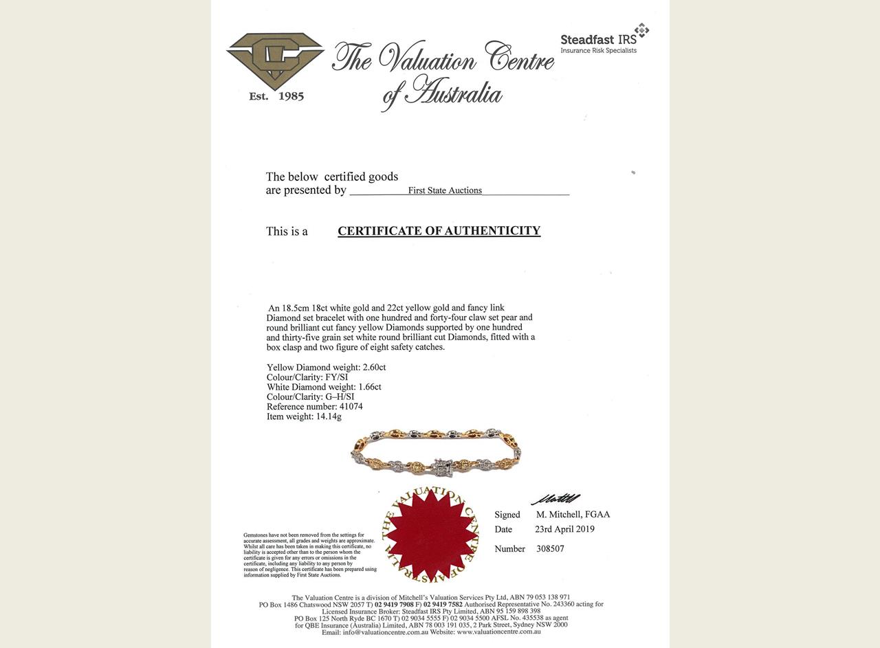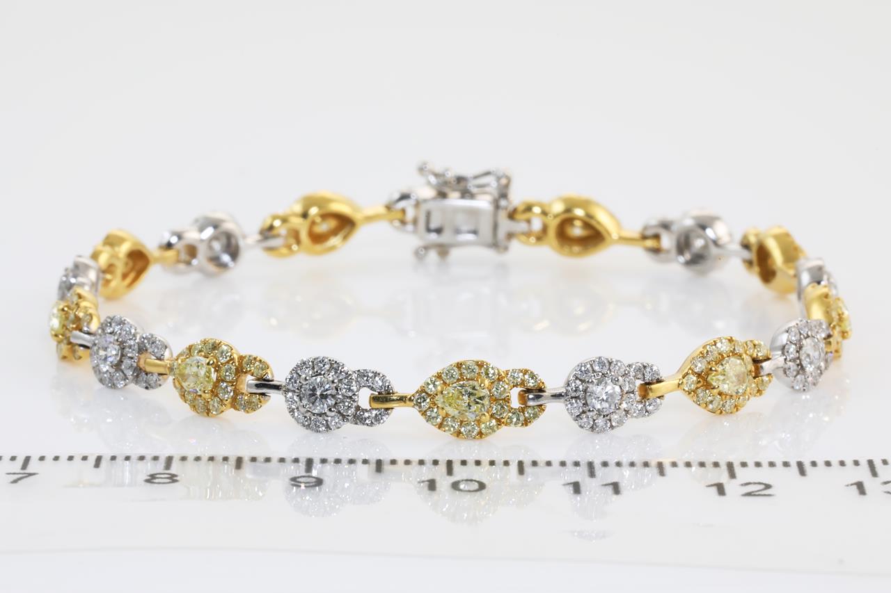 Diamond bracelet with yellow Diamonds totalling 2.60cts (Estimated grading: FY SI) and white Diamonds totalling 1.66cts (Estimated grading: G-H SI). 22ct yellow gold & 18ct white gold. Length: 18.5cm. With certificate #308507. Weight: 14.2g. (New)