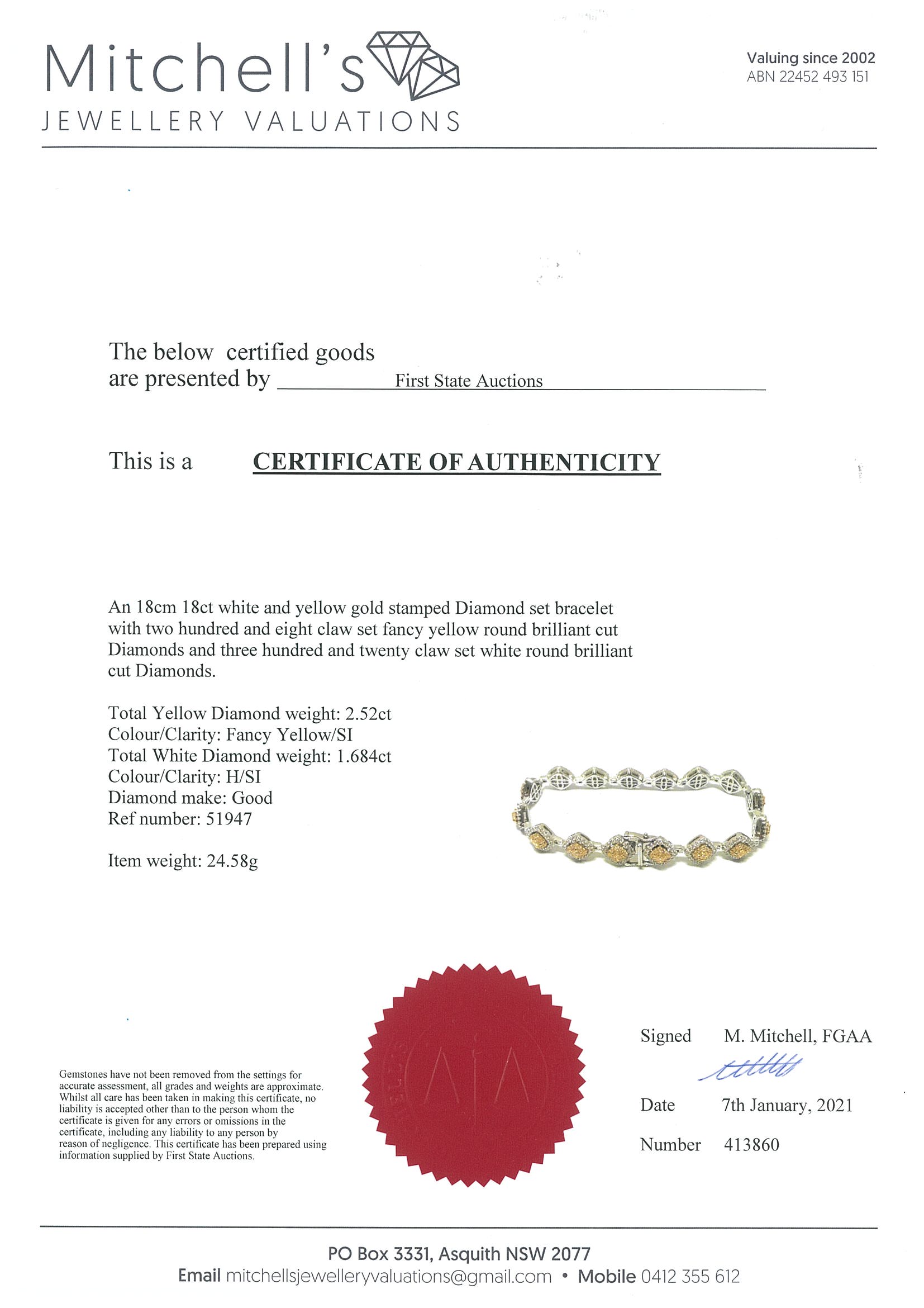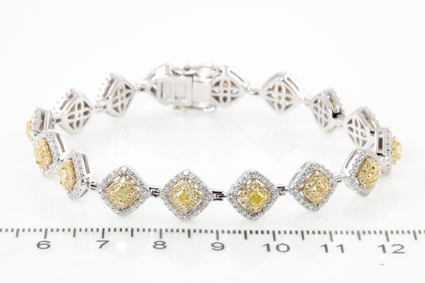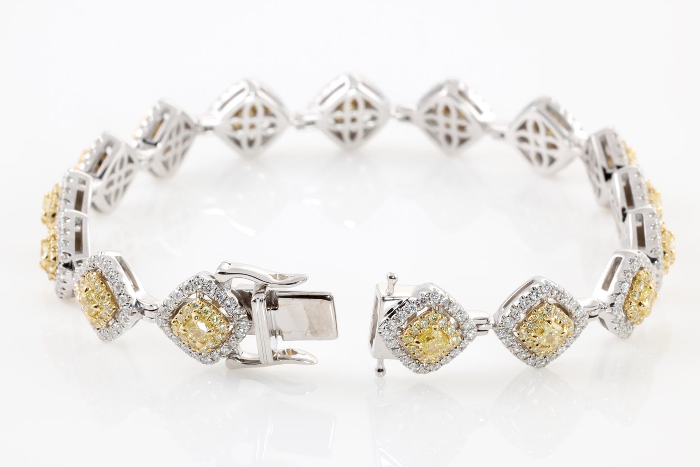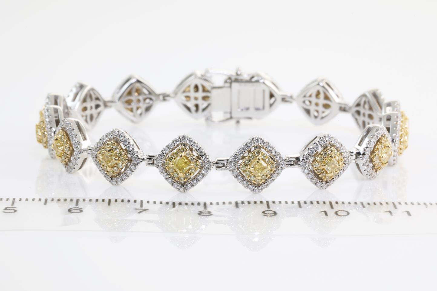 Diamond bracelet with yellow Diamonds totalling 2.52cts (Estimated grading: Fancy yellow SI) and white Diamonds totalling 1.68cts (Estimated grading: H SI). 18ct yellow gold & 18ct white gold. Length: 18cm. With certificate #413860. Weight: 24.5g. (As new)