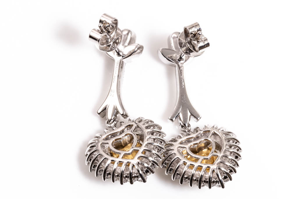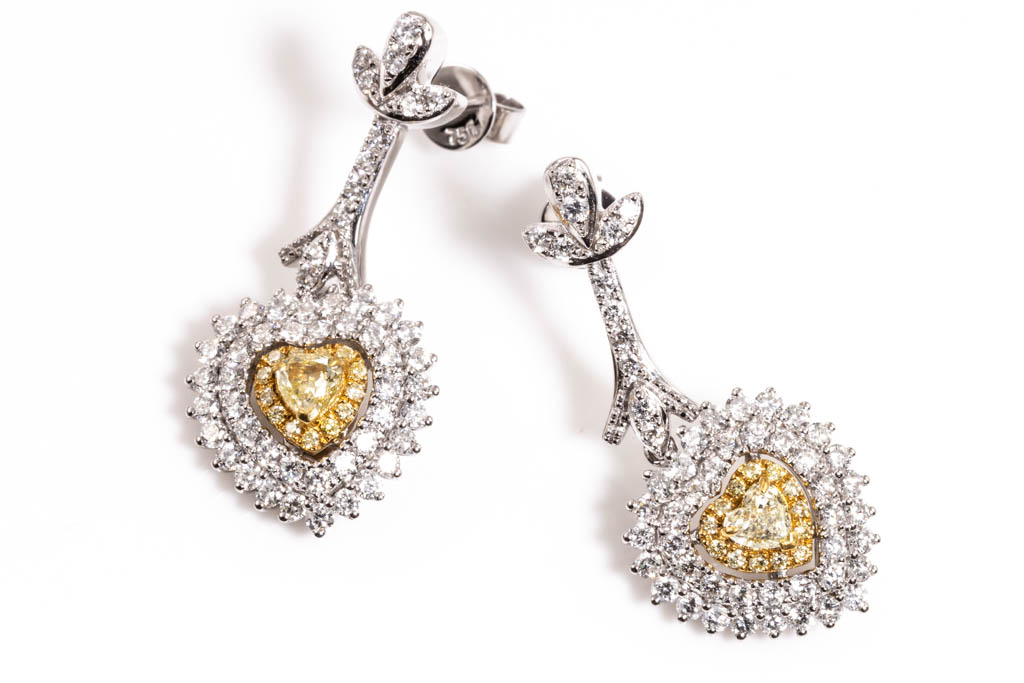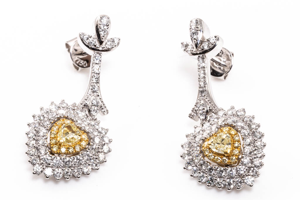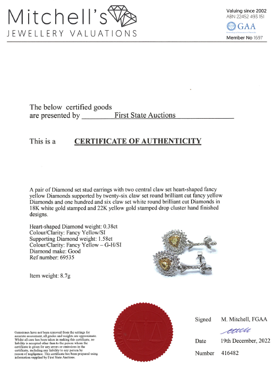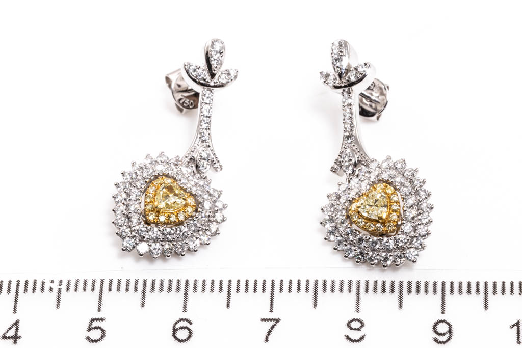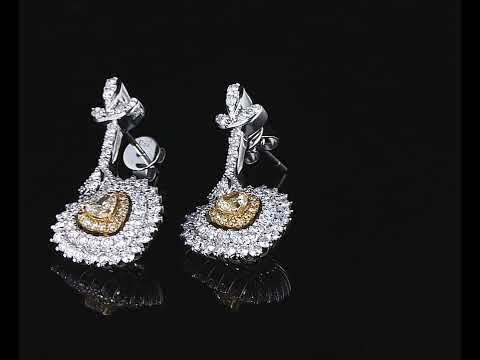 Diamond drop earrings with centre heart shape Diamonds totalling 0.38cts (Estimated grading: Fancy Yellow SI) and surrounding round Diamonds totalling 1.58cts (Estimated grading: Fancy Yellow & G-H SI). 18ct white gold. Weight: 8.7g. With Certificate #416482. (As new)