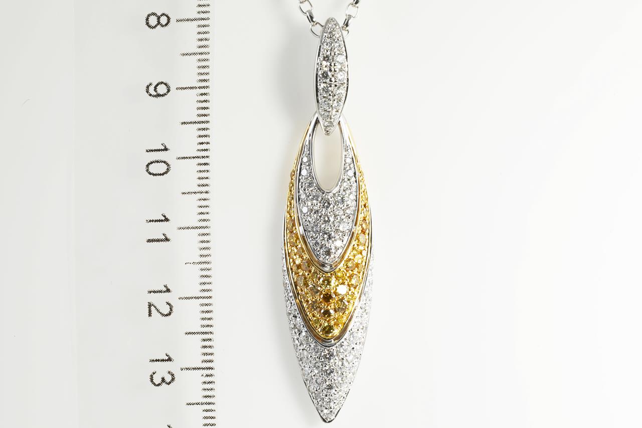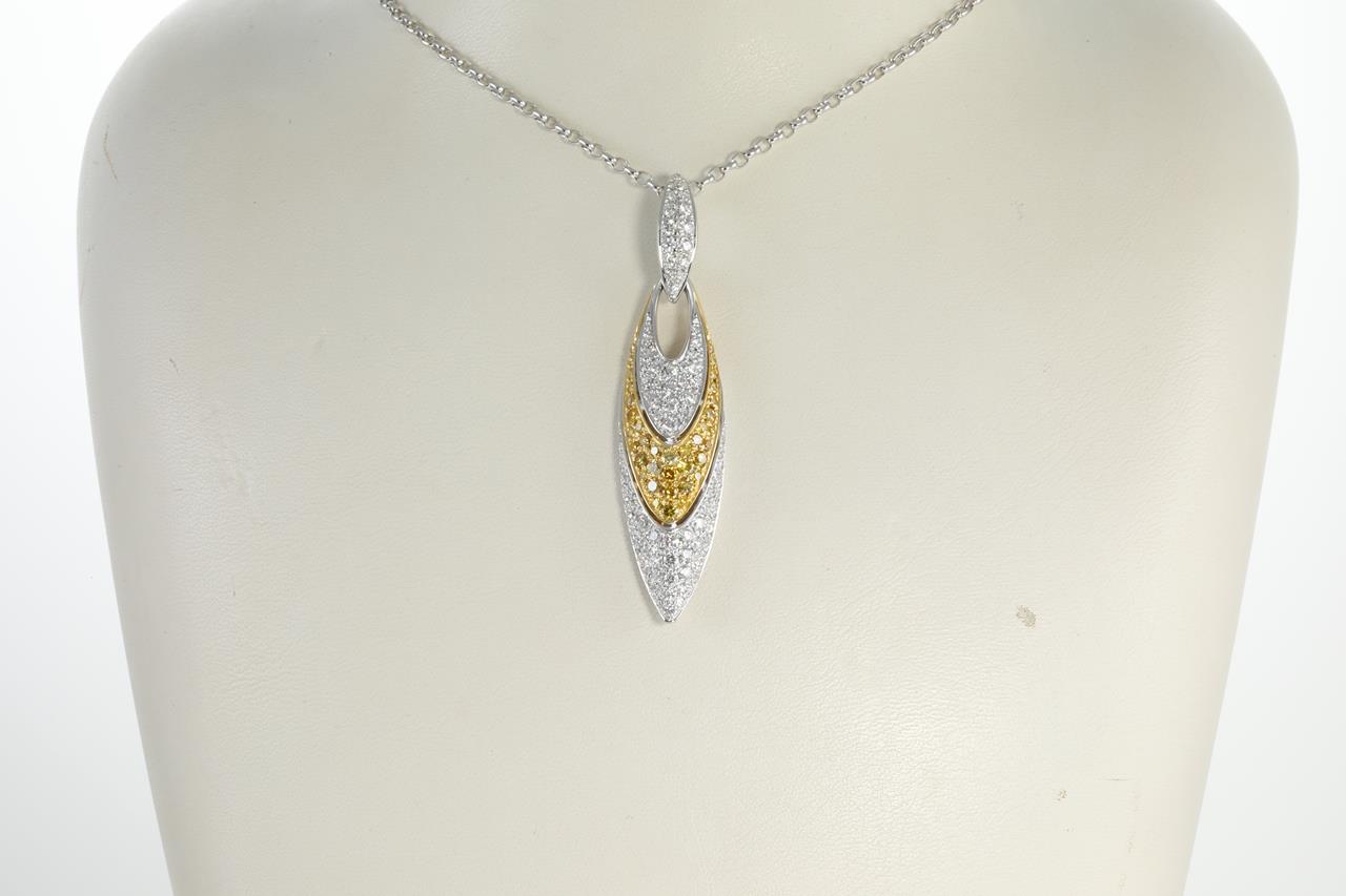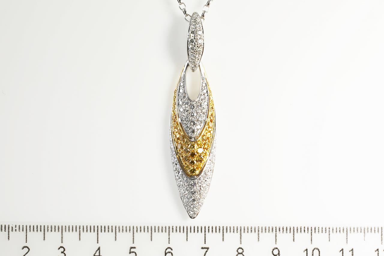 Diamond pendant with round white Diamonds totalling 1.58cts (Estimated grading: G-VS SI) and round yellow Diamonds totalling 0.75cts (Estimated grading: Fancy Yellow SI). 18ct yellow gold with platinum 50cm chain. With certificate #413571. Weight: 20.46g (Pre-owned)