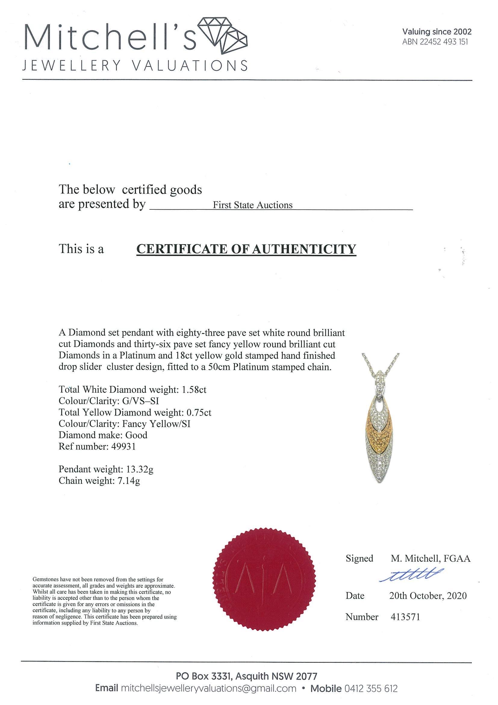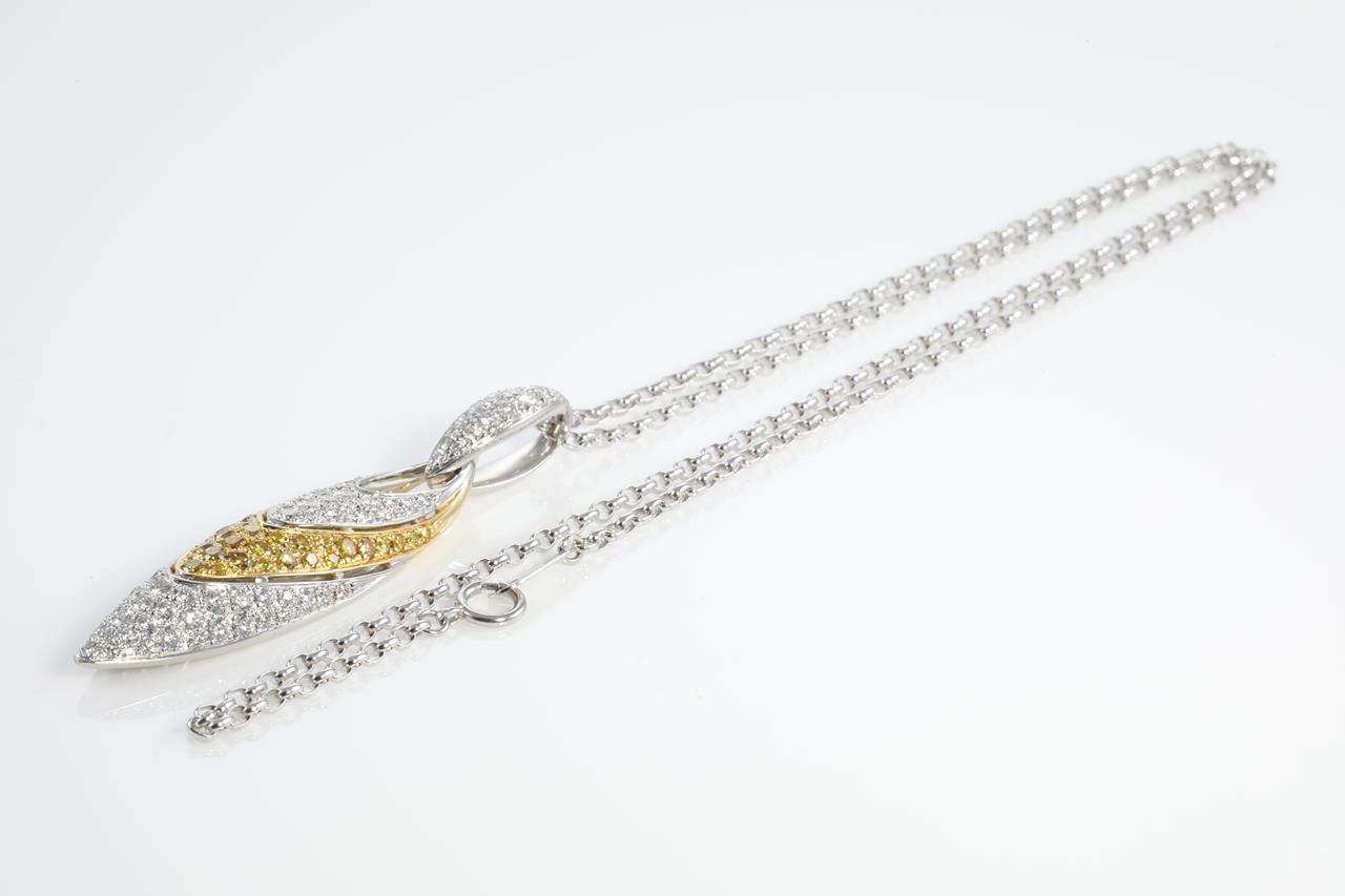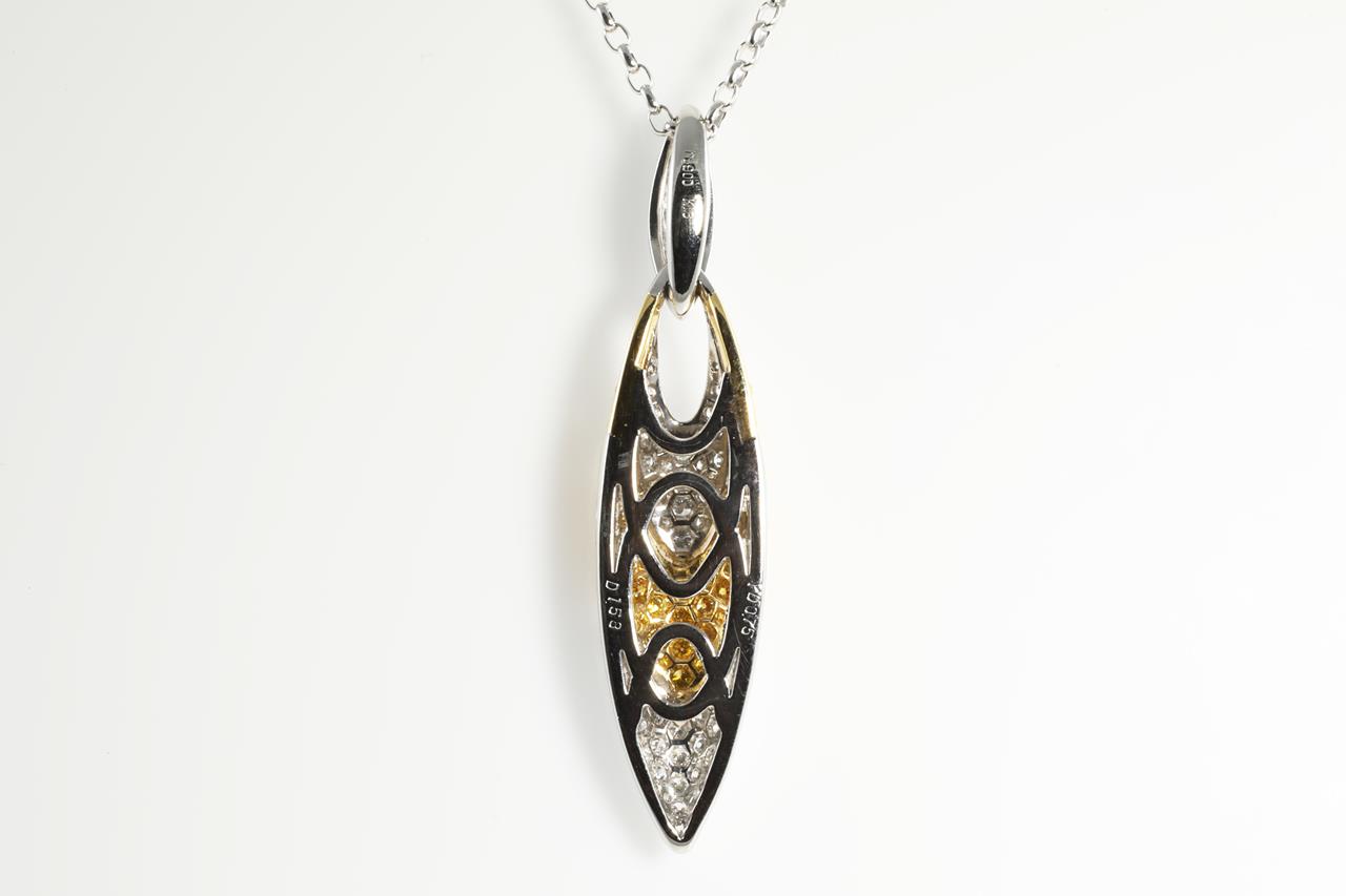 Diamond pendant with round white Diamonds totalling 1.58cts (Estimated grading: G-VS SI) and round yellow Diamonds totalling 0.75cts (Estimated grading: Fancy Yellow SI). 18ct yellow gold with platinum 50cm chain. With certificate #413571. Weight: 20.46g (Pre-owned)