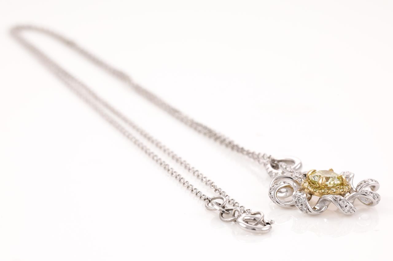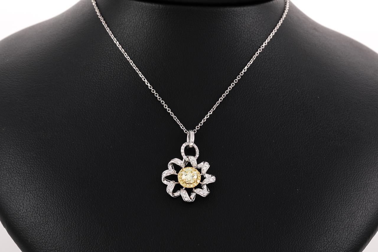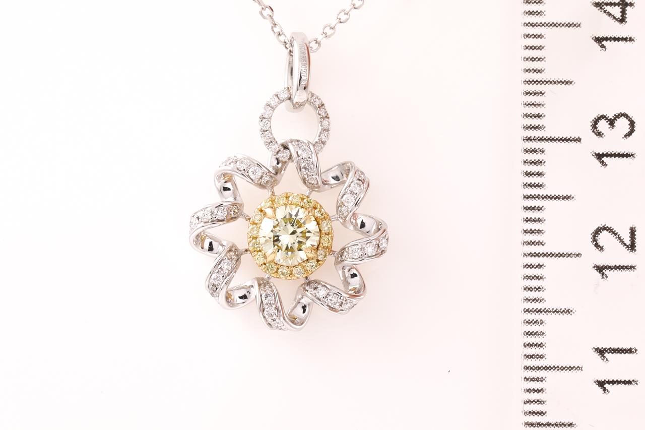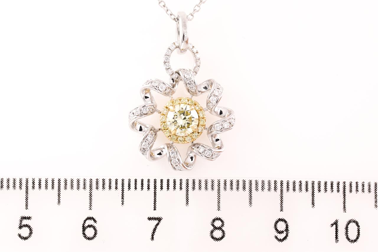 Diamond Pendant with centre round shape yellow Diamond of 0.51ct (Estimated grading: FY SI) and remaining Diamonds totalling 0.39 cts (Estimated grading: G-H SI-P1). 18ct yellow and white gold with 18ct white gold chain. Length: 44.5cm. Weight: 3.7g (As new)