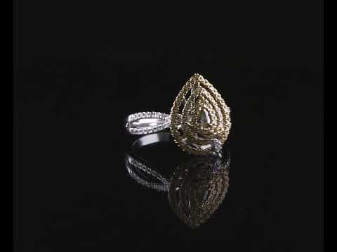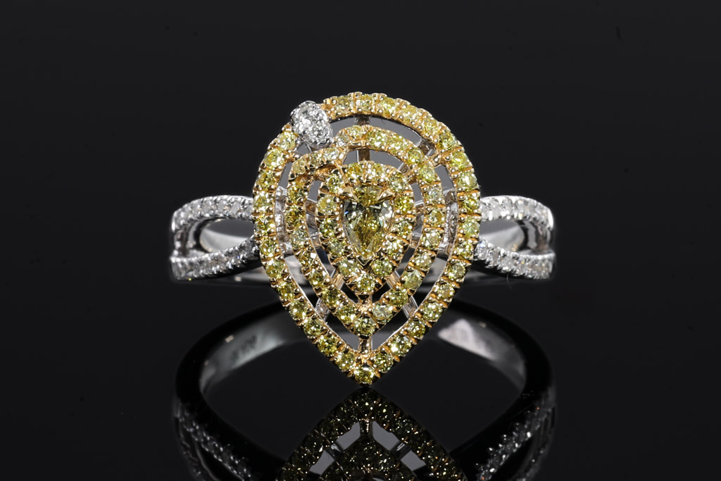 Diamond ring with a centre pear shape Yellow Diamond of 0.08ct and surrounding Yellow & White Diamonds totalling 0.52cts (Estimated grading: G-H P1-2, Fancy Yellow SI-P1). 18ct yellow and white gold. Ring size N - ring resizing is not recommended. Weight: 5.1g. (As new)