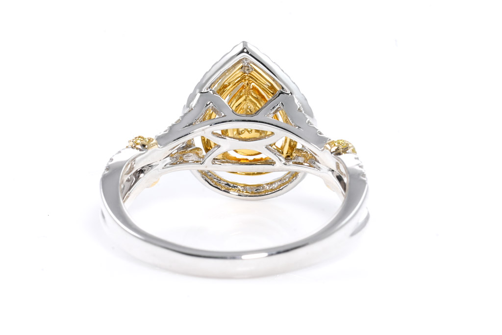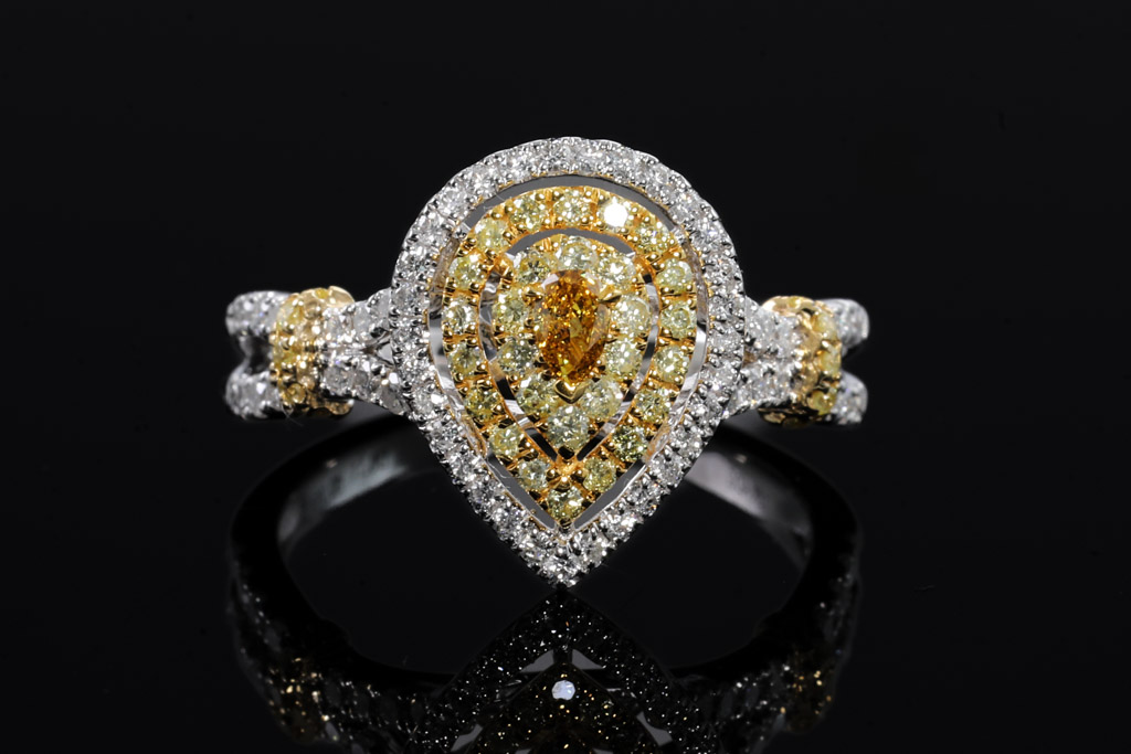 Diamond ring with a centre pear shape Orangy Yellow Diamond of 0.11ct and surrounding Yellow & White Diamonds totalling 0.75cts (Estimated grading: Fancy Yellow SI-P1, G-H P1). 18ct yellow gold and white gold. Ring size N - ring resizing is not recommended. Weight: 4.7g. (As new)